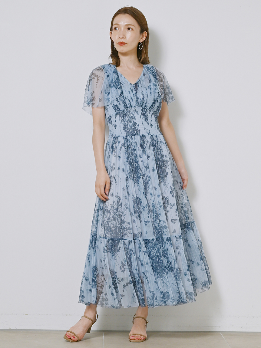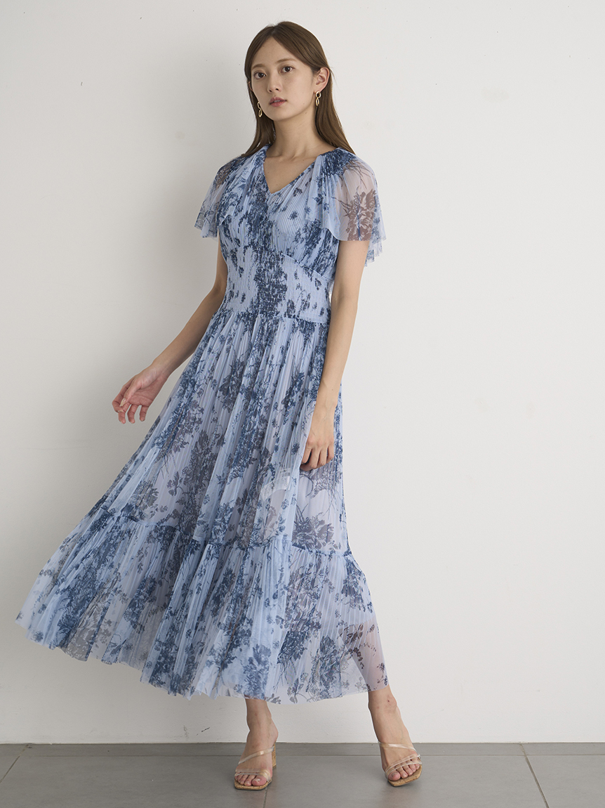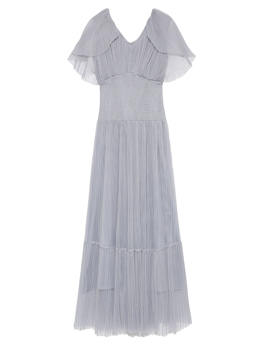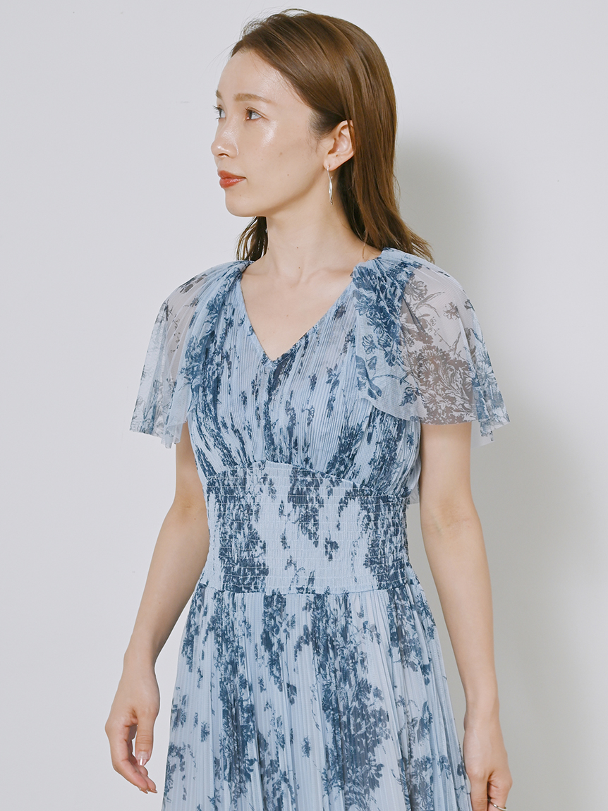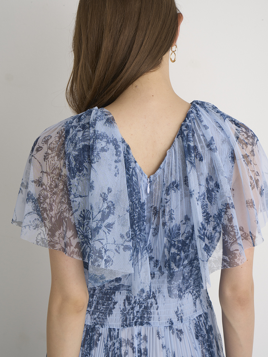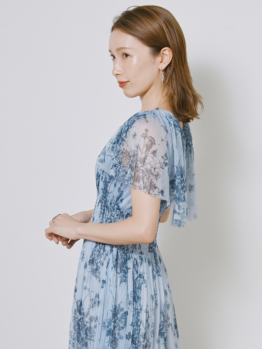 贅沢に細やかなプリーツを効かせた、エレガントで華やかなチュールドレス。ひらりと広がるケープ風の袖でトレンド感も押さえています。ウエスト部分はシャーリングでキュッと締めることでメリハリのあるシルエットをメイク。スタイルアップ効果を存分に期待できます。合わせるアイテム次第でオケージョンシーンからデイリーまで幅広く活躍してくれる万能な1着です。