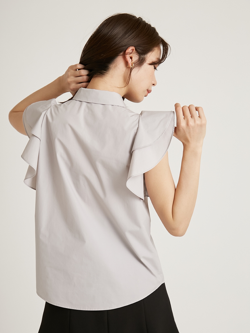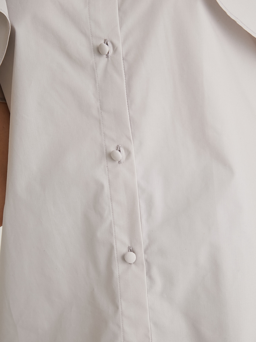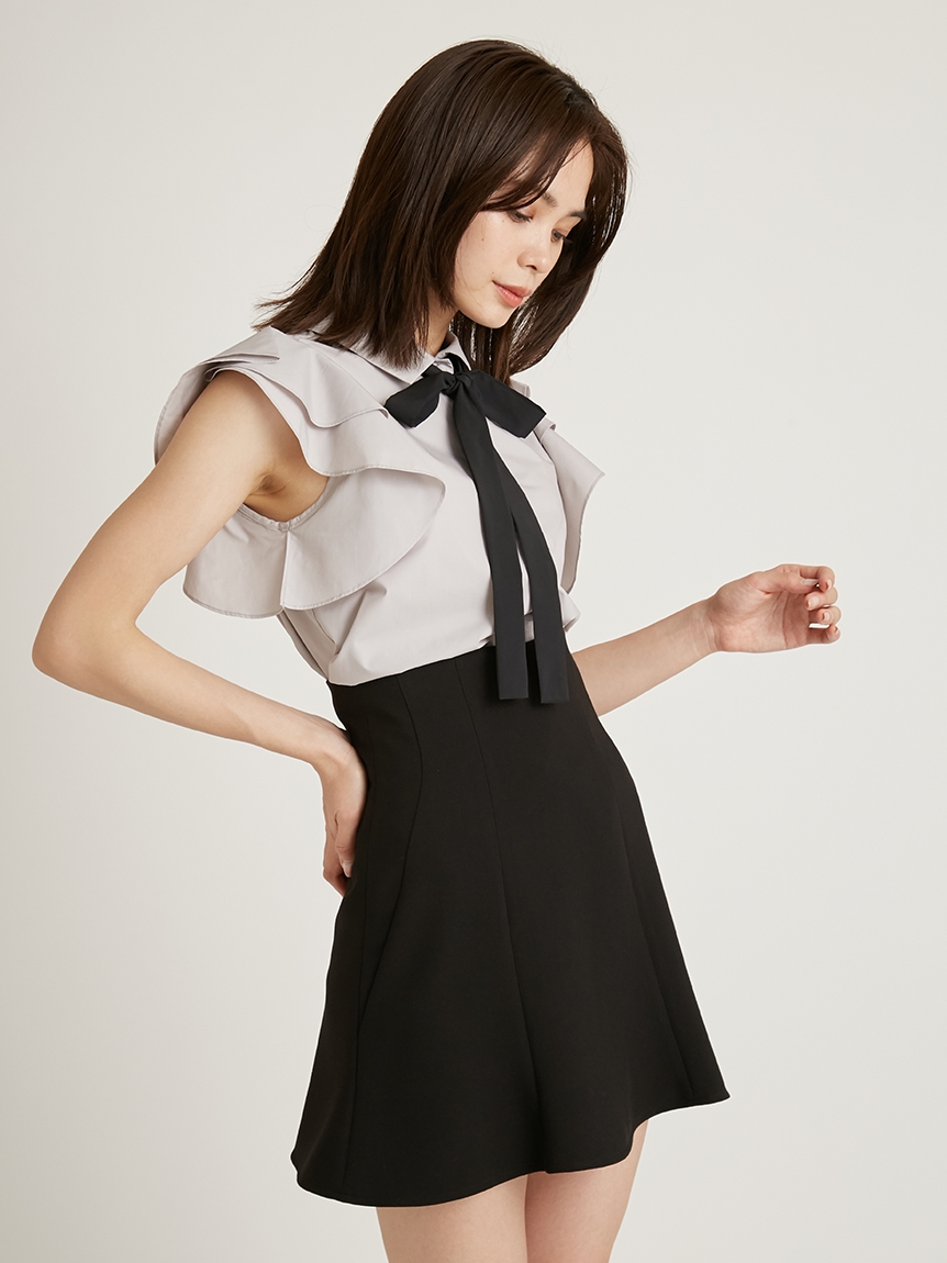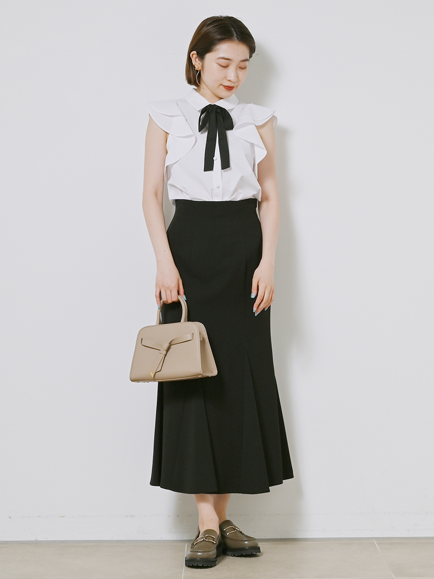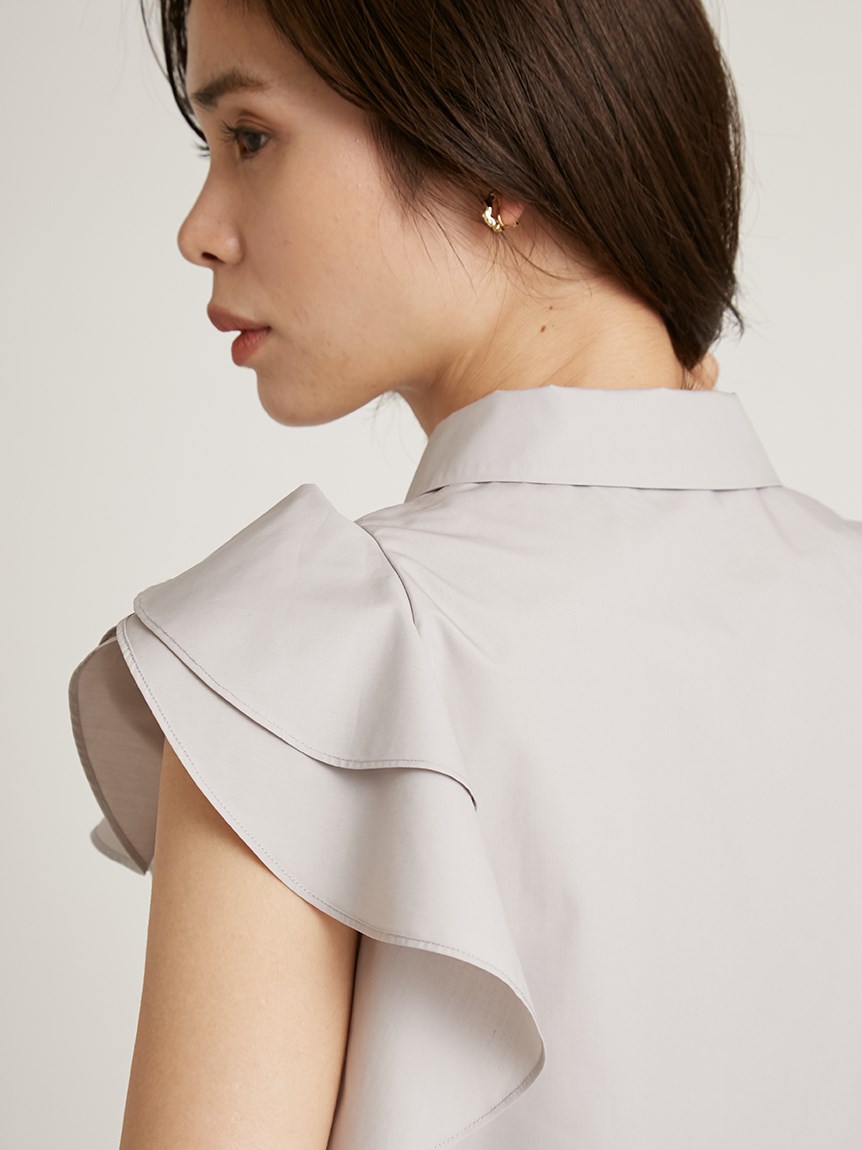 構築的なフリルやボウタイリボンがポイントになった、レディライクなノースリブラウス。パリッとしたきれいめのシャツ地を用いることで、モードなルックスに仕上げました。身頃部分はすっきりとシンプルにまとめることで、エレガントなボリュームフリルがより際立った印象に。ボトムにインしてもアウトでもバランス良く決まるので、合わせるボトムを選ばず幅広く活躍してくれます。