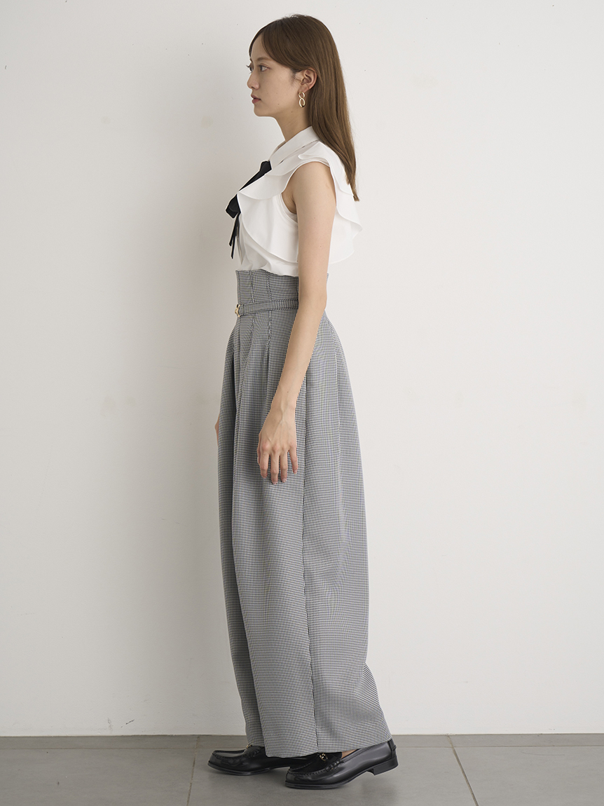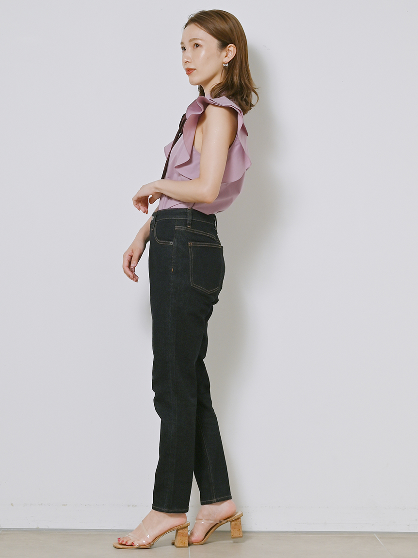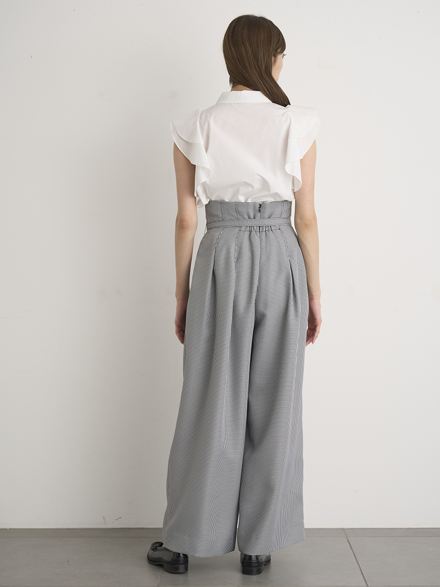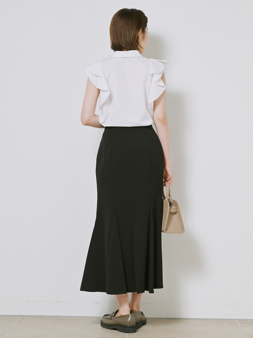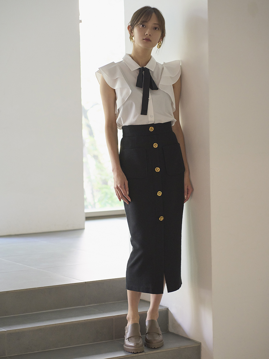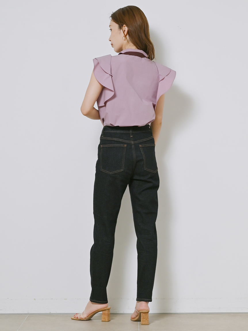 構築的なフリルやボウタイリボンがポイントになった、レディライクなノースリブラウス。パリッとしたきれいめのシャツ地を用いることで、モードなルックスに仕上げました。身頃部分はすっきりとシンプルにまとめることで、エレガントなボリュームフリルがより際立った印象に。ボトムにインしてもアウトでもバランス良く決まるので、合わせるボトムを選ばず幅広く活躍してくれます。