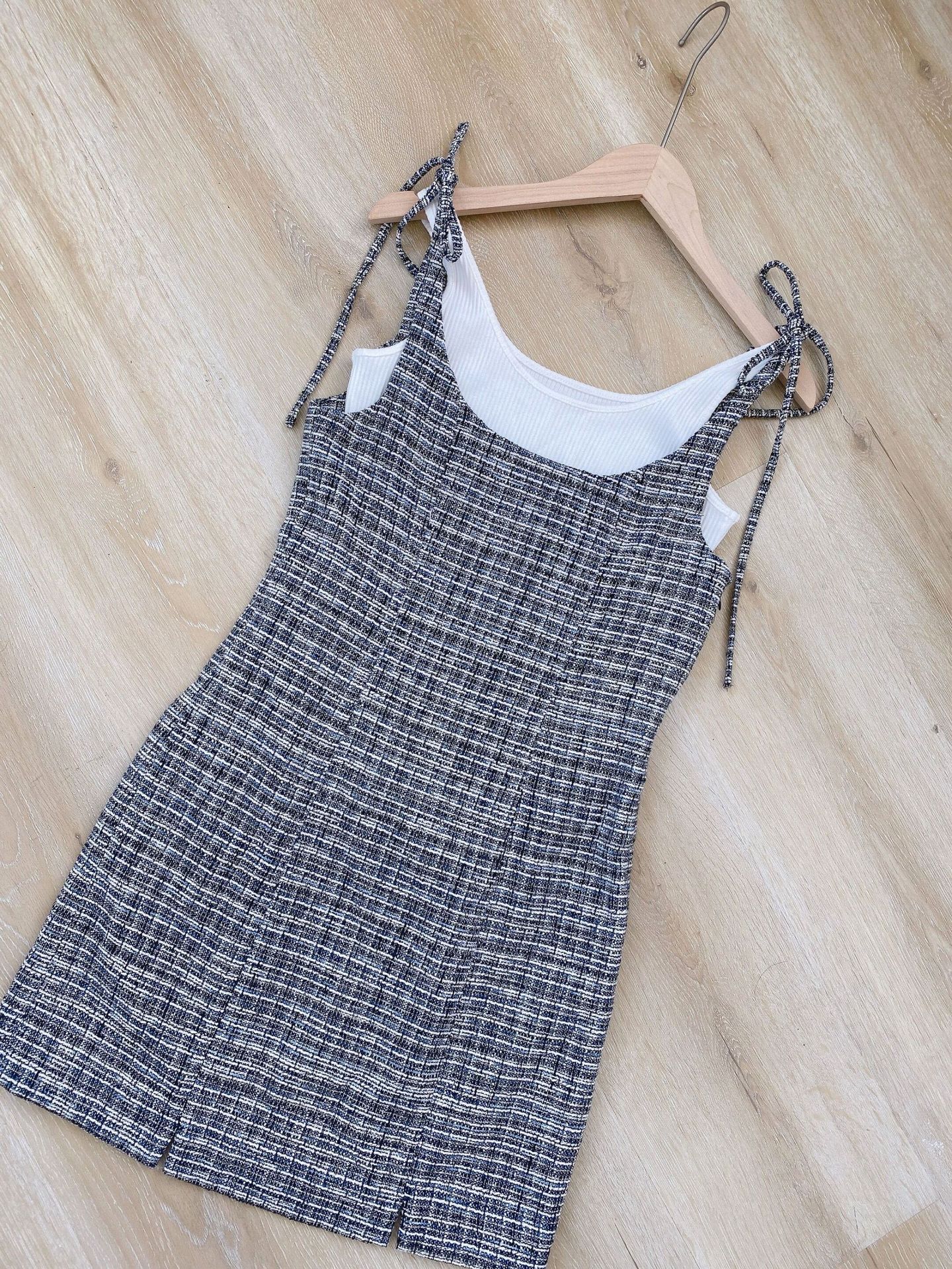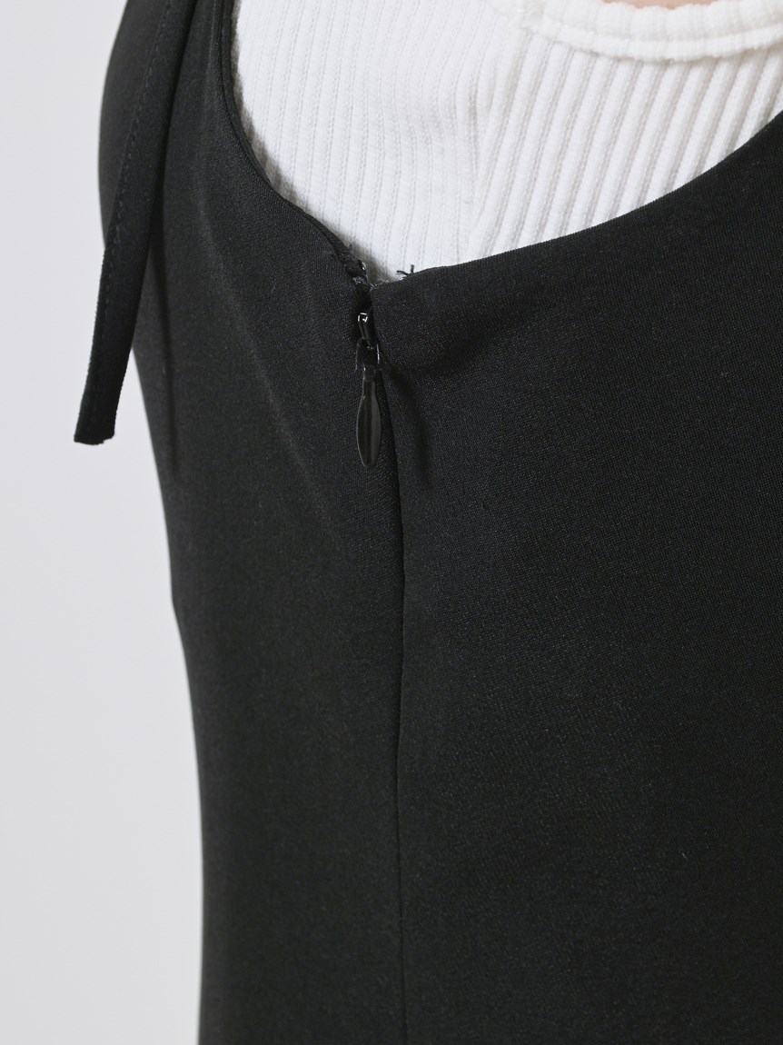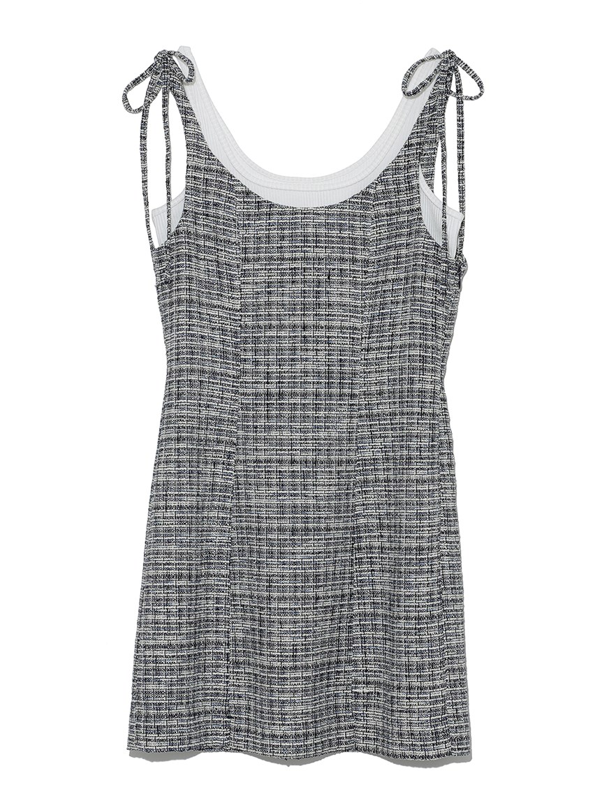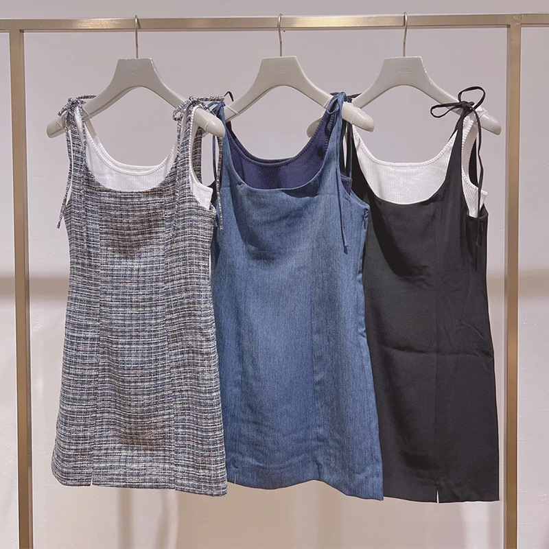 ジョーゼット素材を用いたブラック、デニム調生地のネイビー、ツイード素材を使用したミックスの3色展開。タンクトップには伸縮性のある柔らかなカットソーを使用しています。