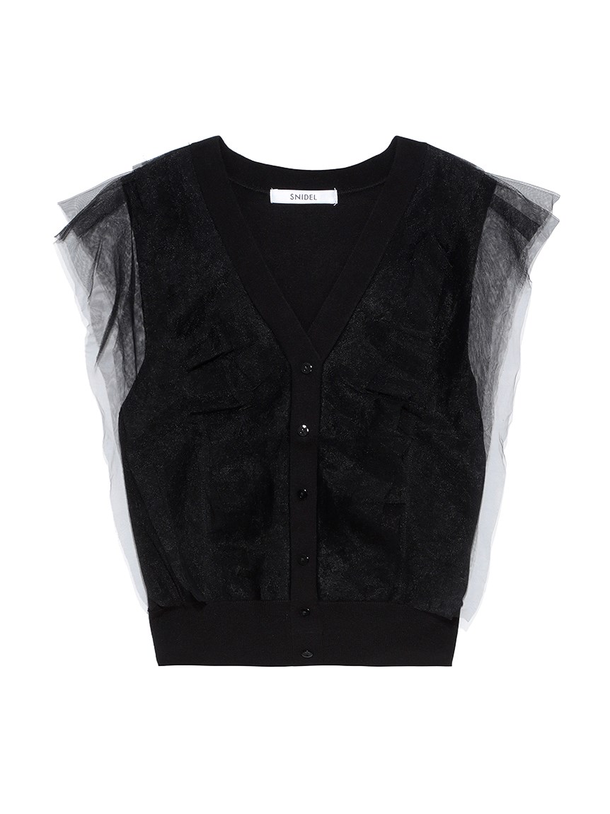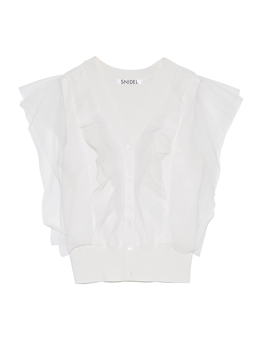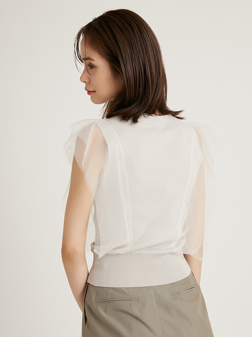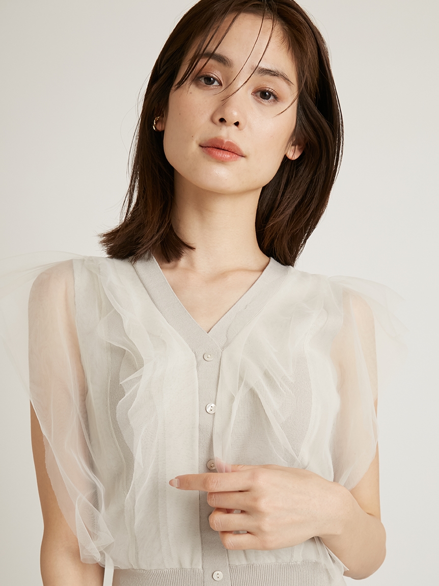 透明感とハリのあるチュールをドッキングした、モードな異素材コンビデザインのニットプルオーバー。ひらりと広がるフリル&スリーブで愛らしいルックスに仕上げています。今年らしいショート丈を採用したコンパクトなシルエット。パンツともスカートとも合わせやすく、幅広いコーディネートに活躍してくれます。