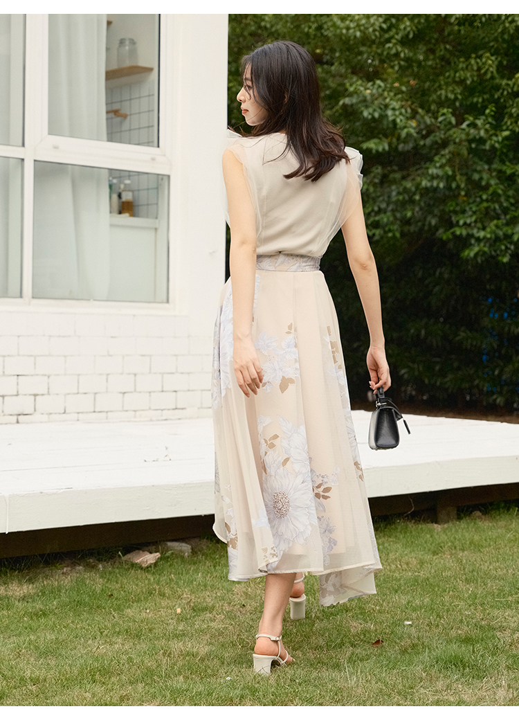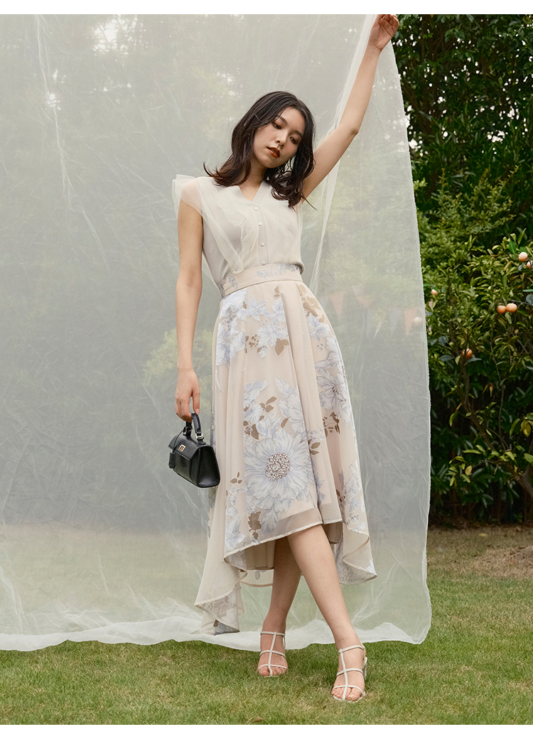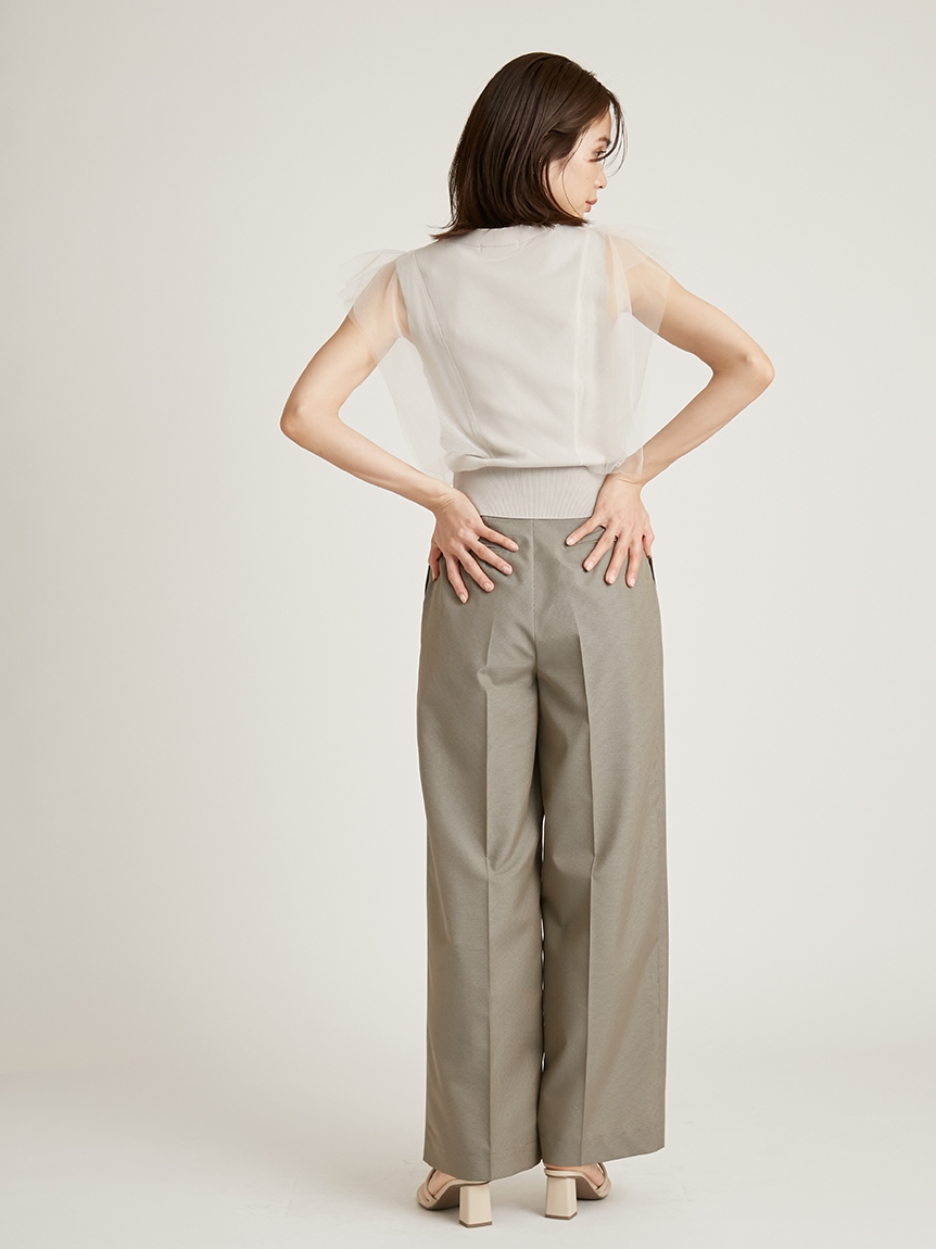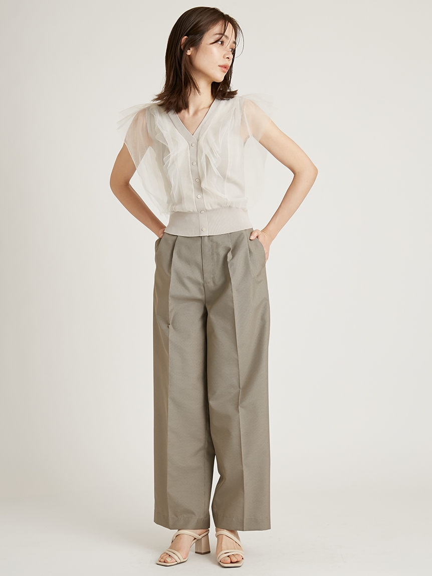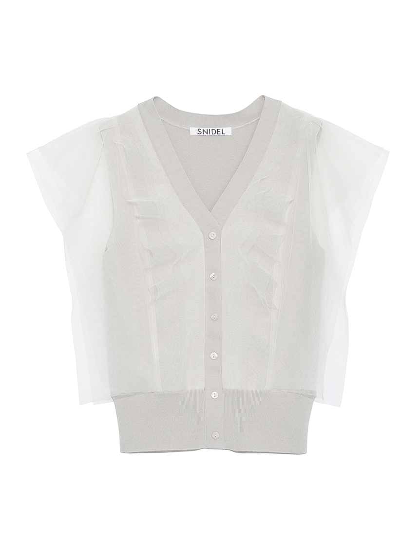 透明感とハリのあるチュールをドッキングした、モードな異素材コンビデザインのニットプルオーバー。ひらりと広がるフリル&スリーブで愛らしいルックスに仕上げています。今年らしいショート丈を採用したコンパクトなシルエット。パンツともスカートとも合わせやすく、幅広いコーディネートに活躍してくれます。