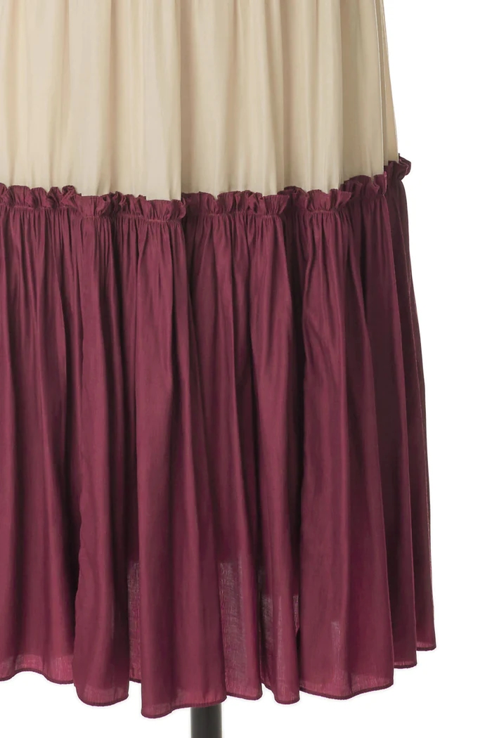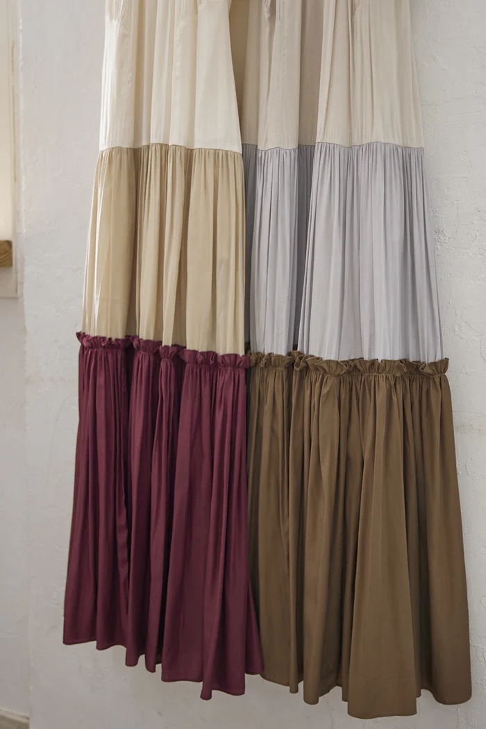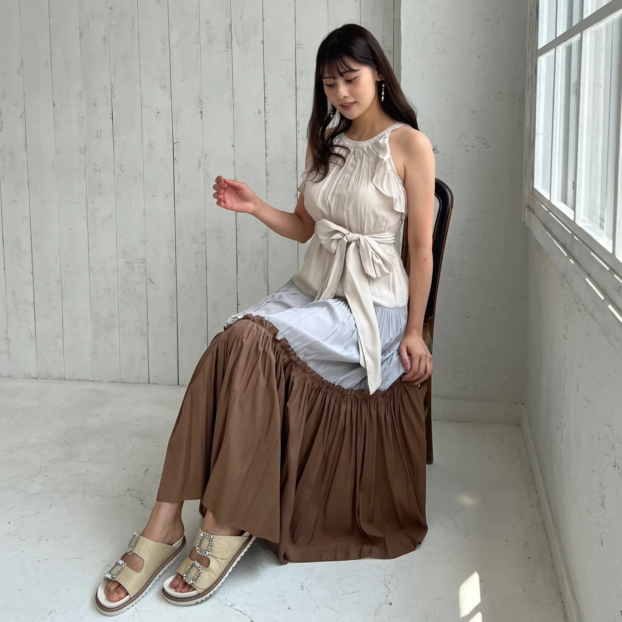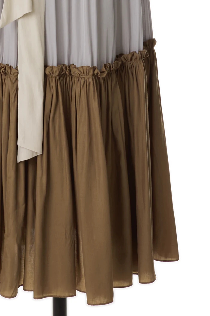 裾に向かって増えていくフレアとギャザーにより、歩く度にふわっと広がる様がとても美しいフェミニンな魅力溢れる一枚です。