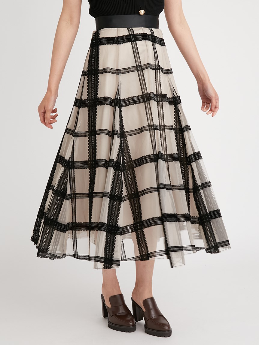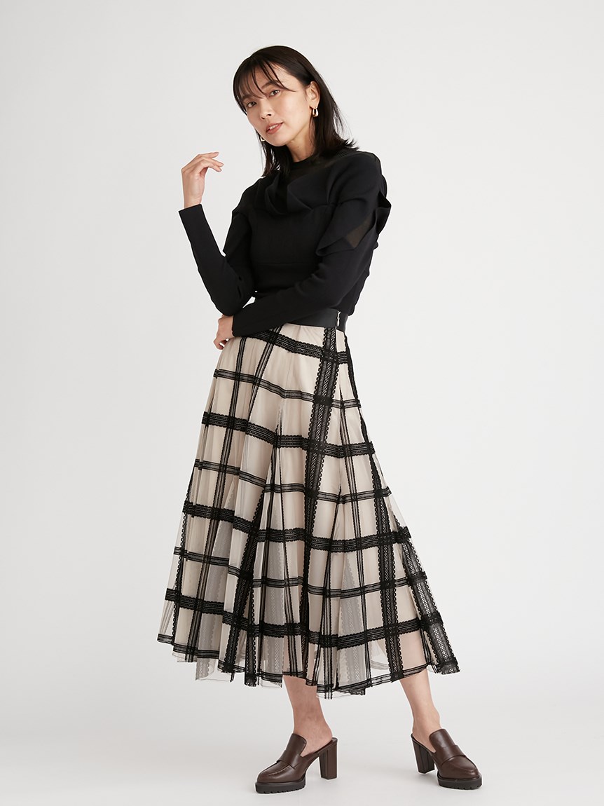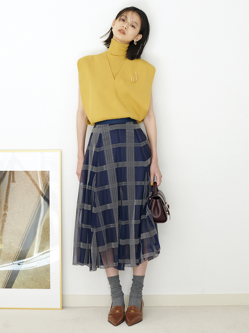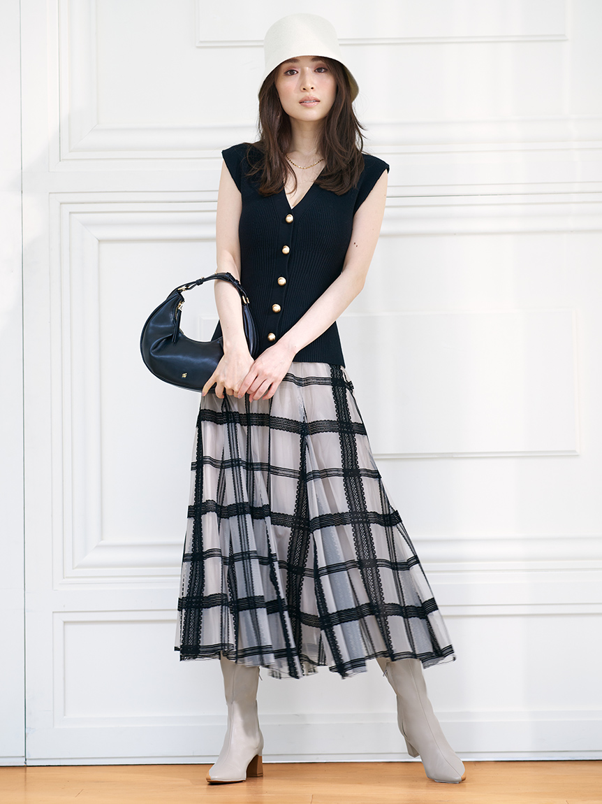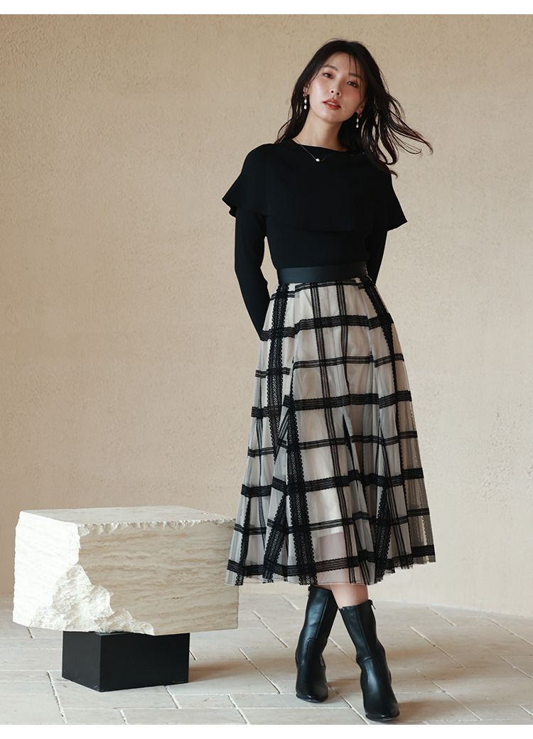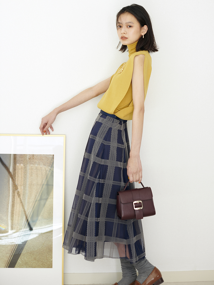 「SNIDEL」定番のエンブロイダリーチュールスカートにフロッキーデザインを加えアップデート。抜群の存在感でスタイリングを華やかに彩る1着が届きました。動作のたびに揺れ足元をセンシュアルに映し出す透け感が女性らしさを高める秘訣。ボリュームのあるフレアシルエットなので、トップスはシンプルなニットなどを合わせてコンパクトにまとめるのがオススメです。