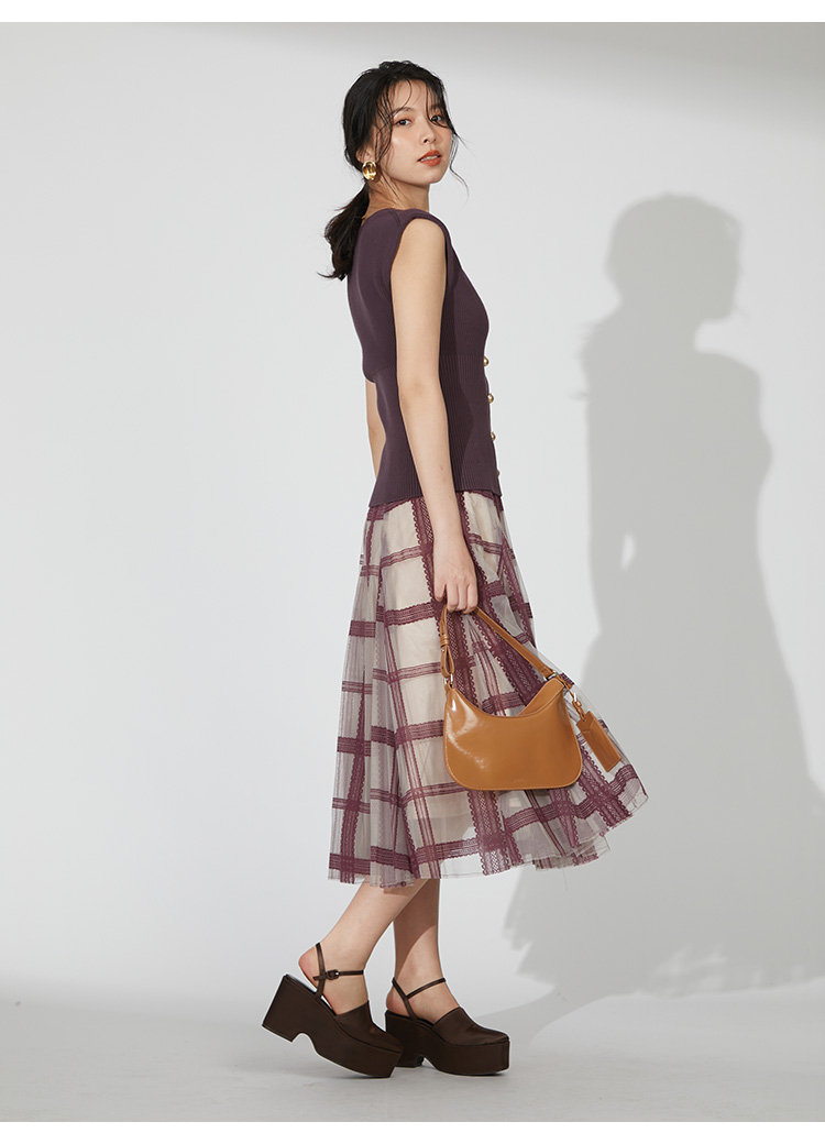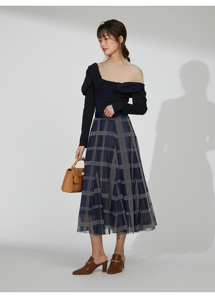 優しい透け感のあるエアリーなチュールをたっぷりと使用しました。リサイクルペットボトルを使用したサステナブルな商品です。バイカラーで仕上げたブラックとバーガンディ、微配色でまとめたブルーの3色展開です。