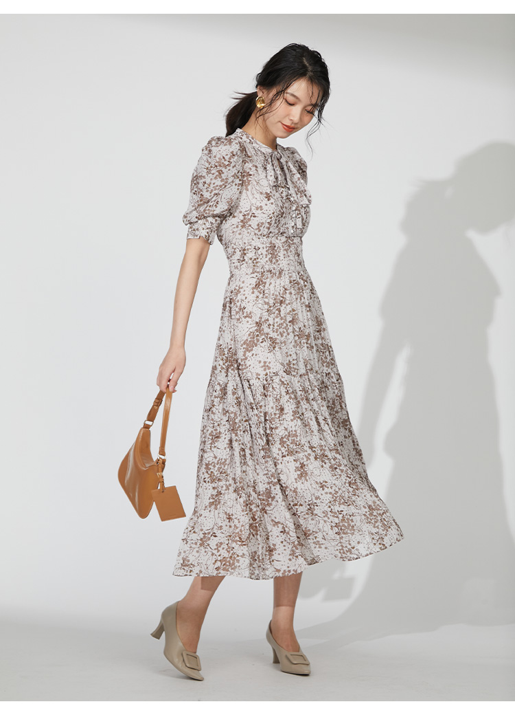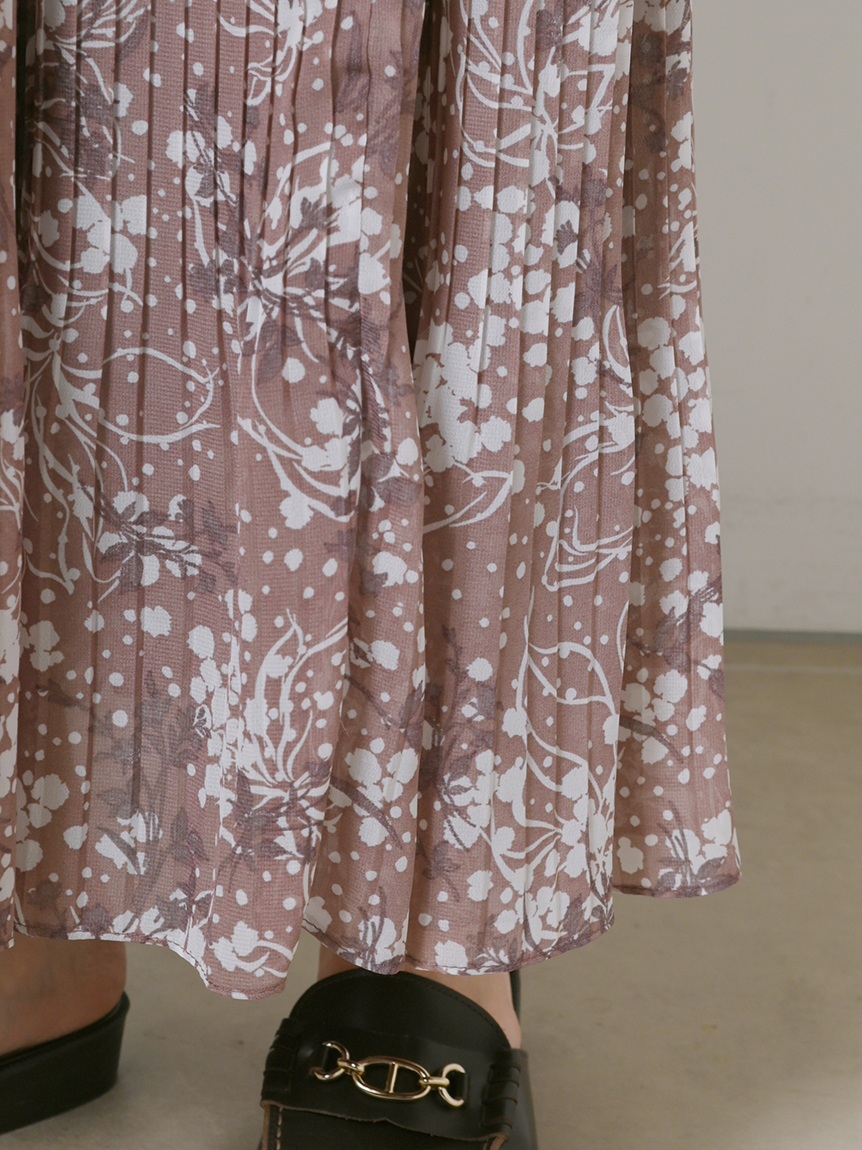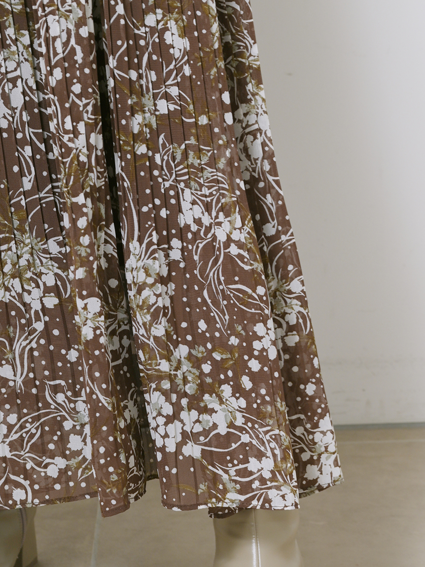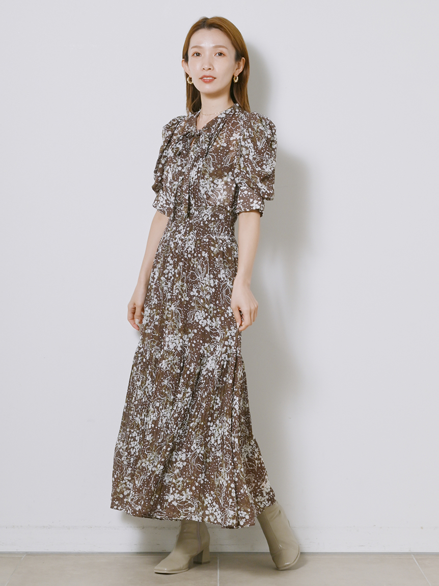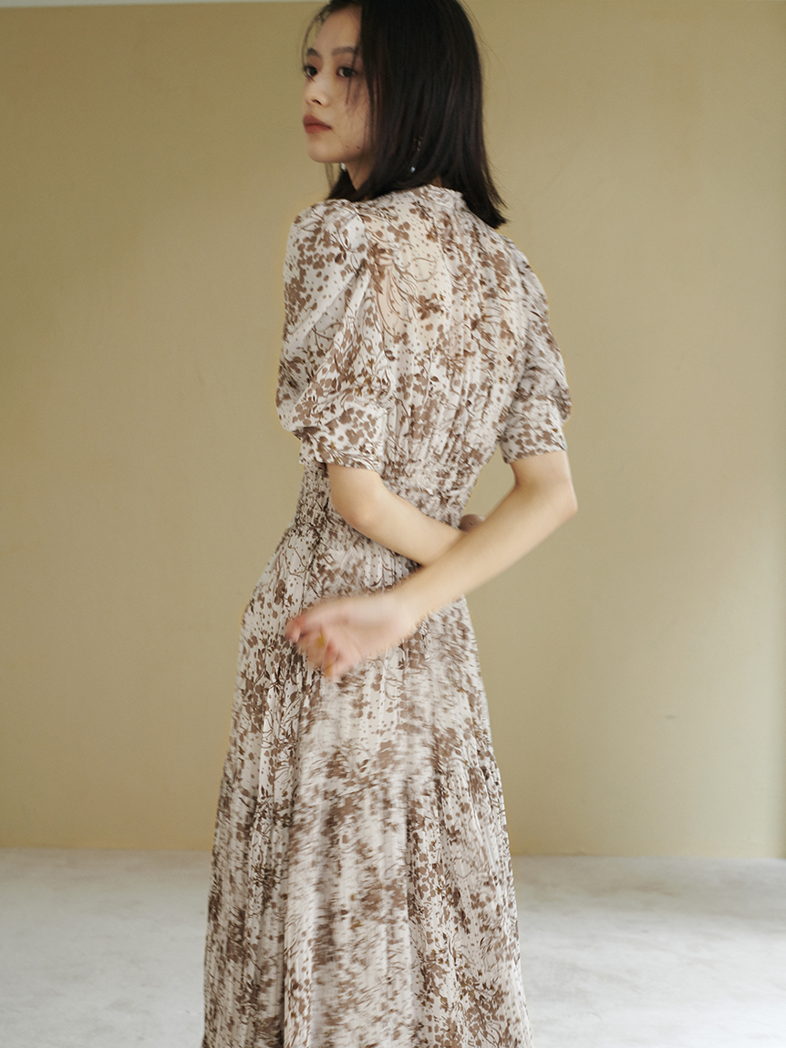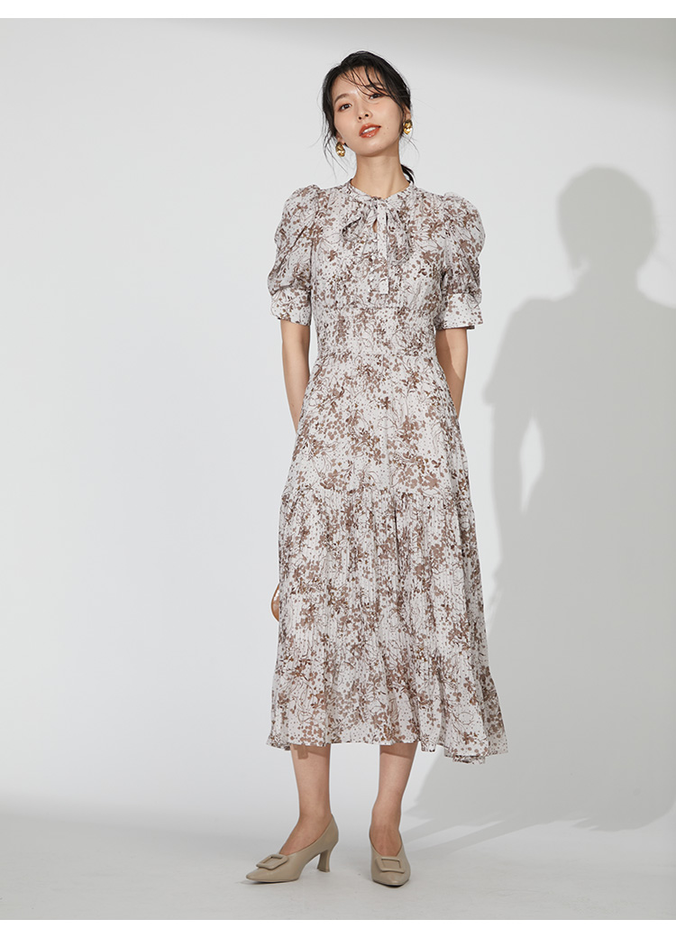 細部までこだわった線と花のシルエットが華やかなプリントを施しました。優しい印象を与えるピンクベージュ、シーズンムード薫るブラウン、トレンドライクなラベンダーの3色展開でお届けします。