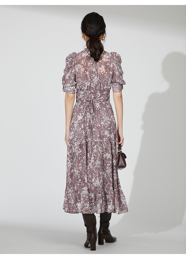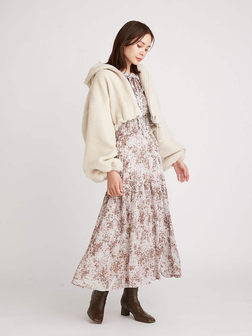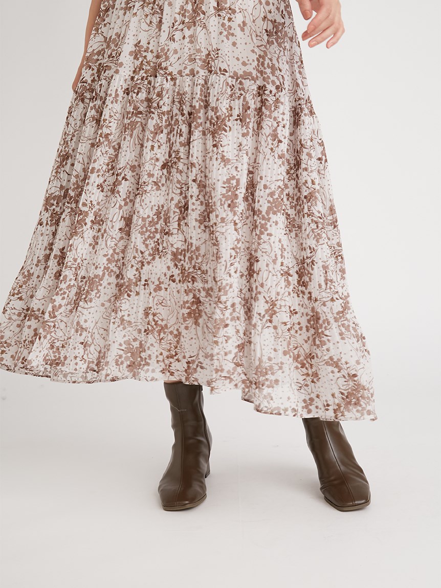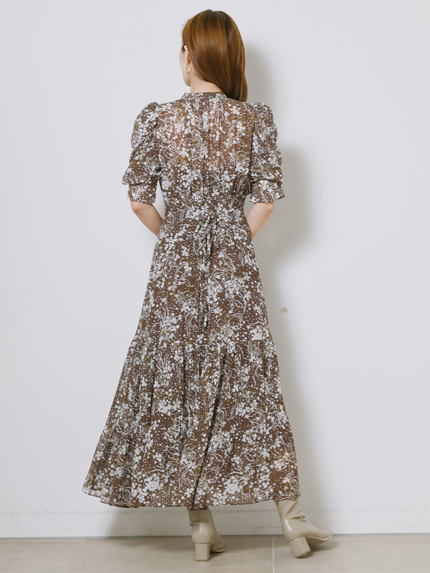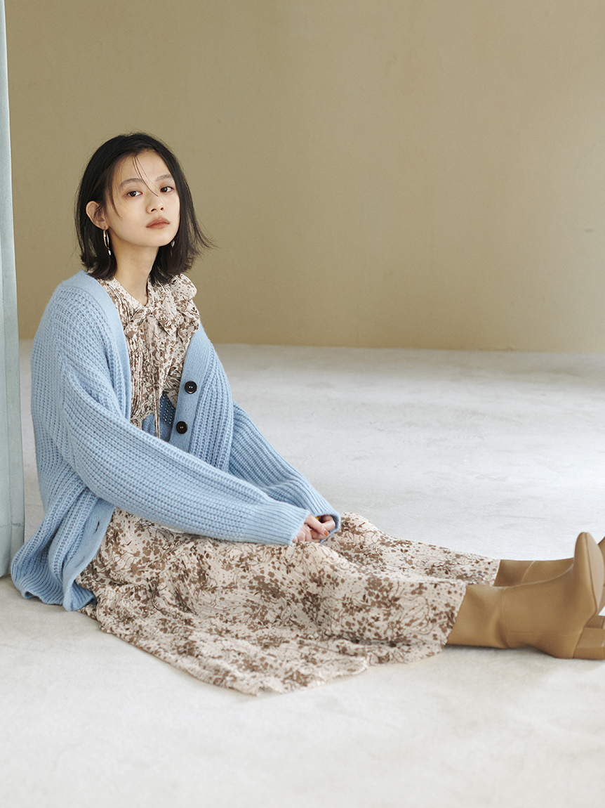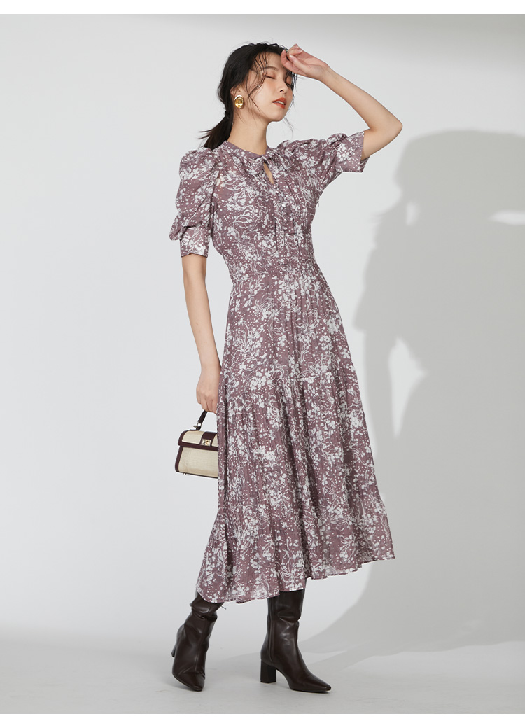 細部までこだわった線と花のシルエットが華やかなプリントを施しました。優しい印象を与えるピンクベージュ、シーズンムード薫るブラウン、トレンドライクなラベンダーの3色展開でお届けします。