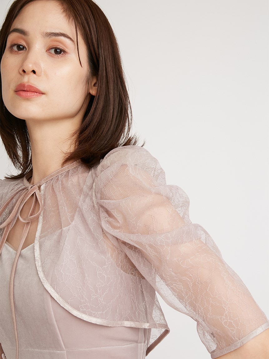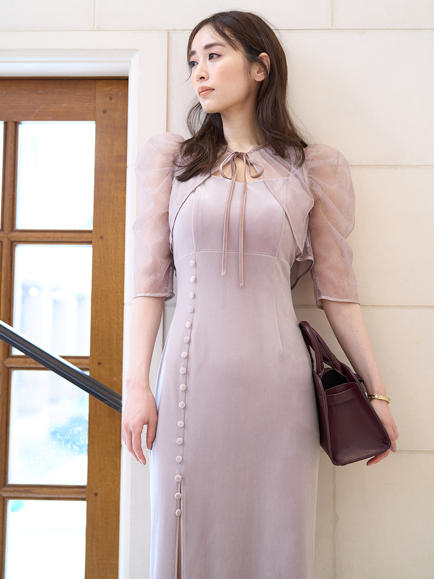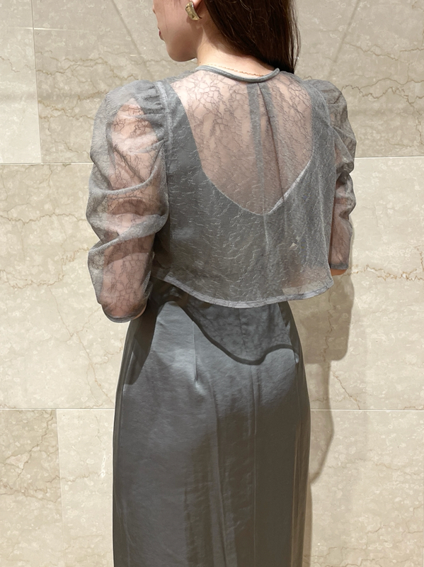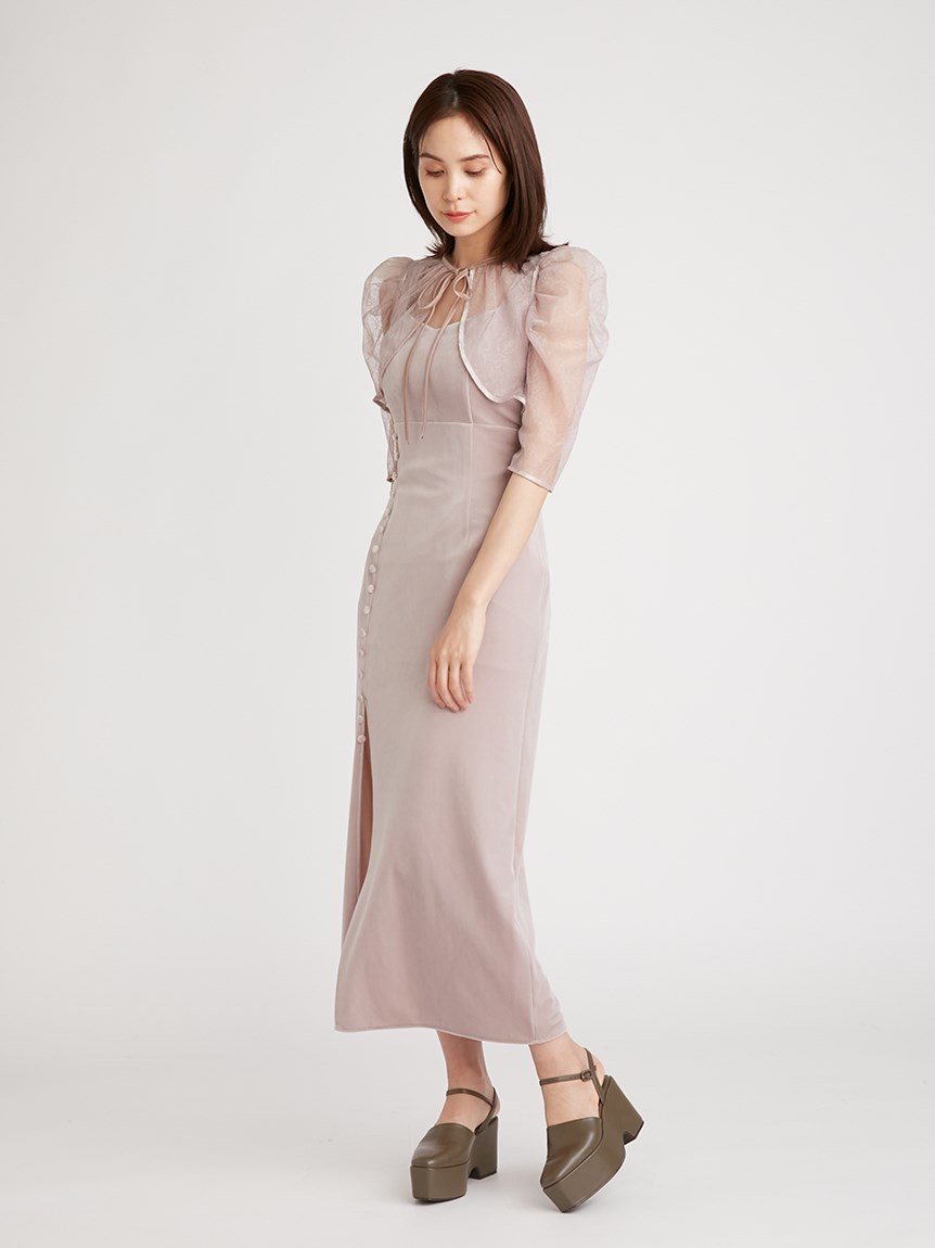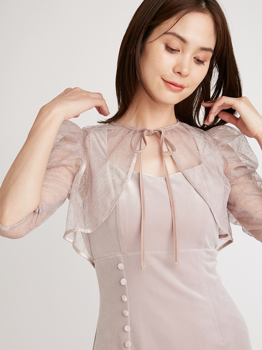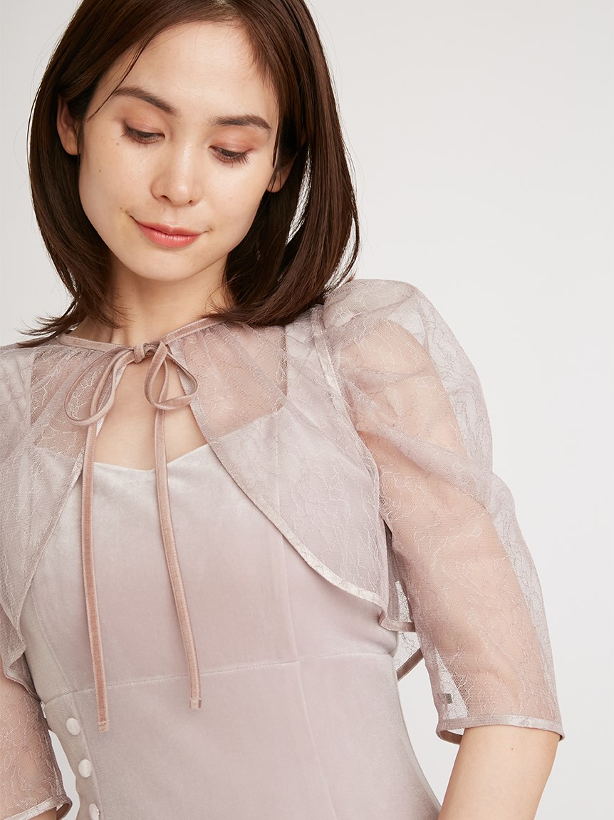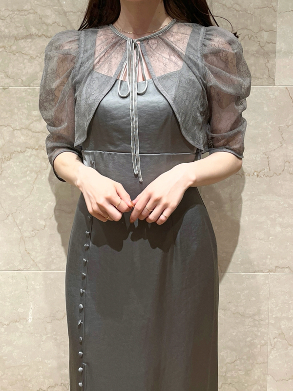 繊細なレースのショートボレロがセットになったノースリーブワンピース。ワンピースは巧みな切り替えが光るタイトシルエットで女性らしさ溢れる仕上がりに。サイドには深めにスリットをあしらい、色香漂うセンシュアルな肌見せを演出しています。