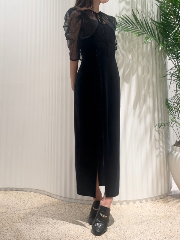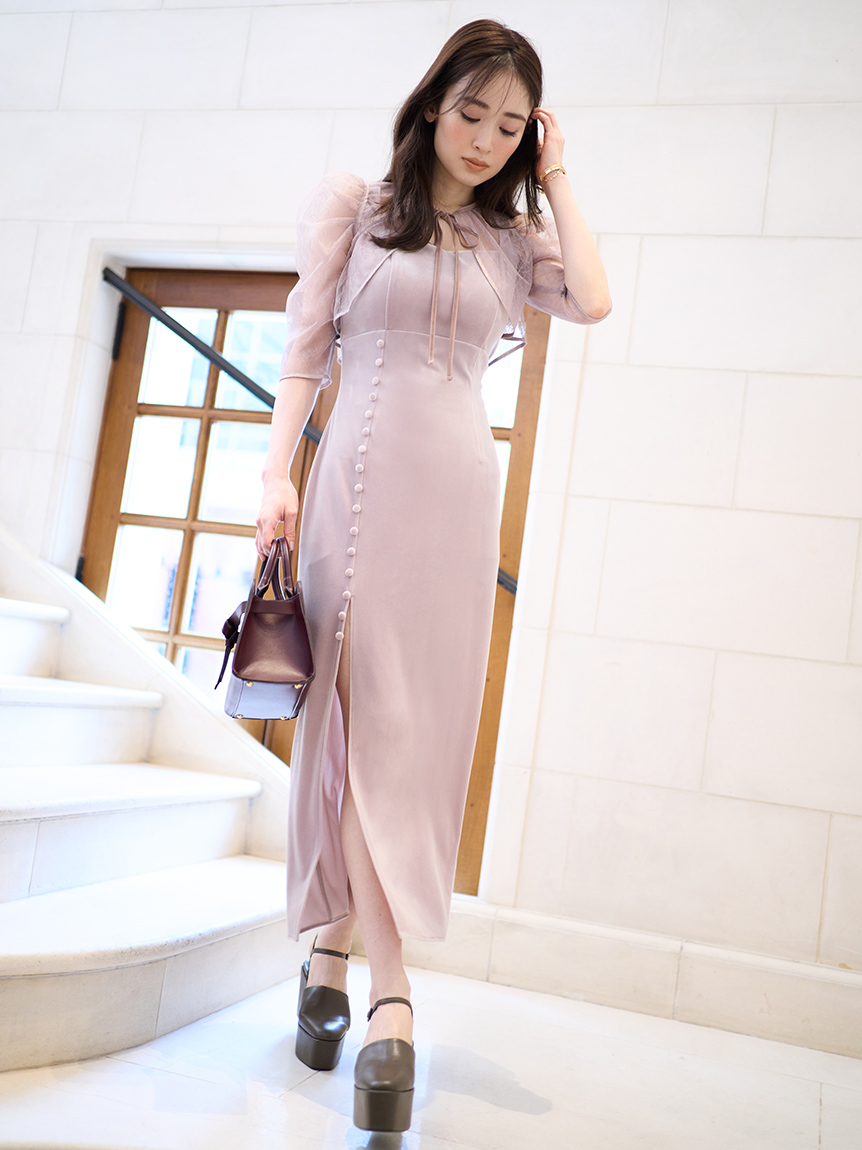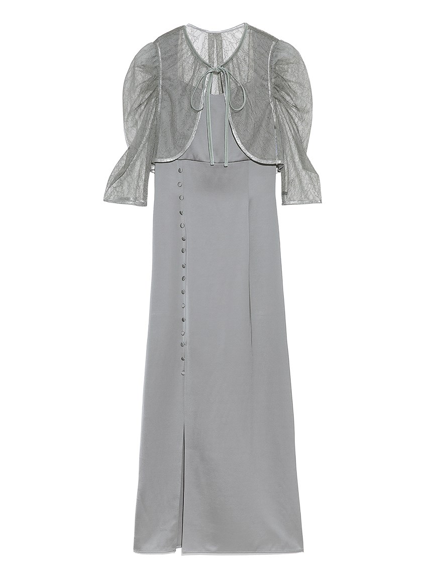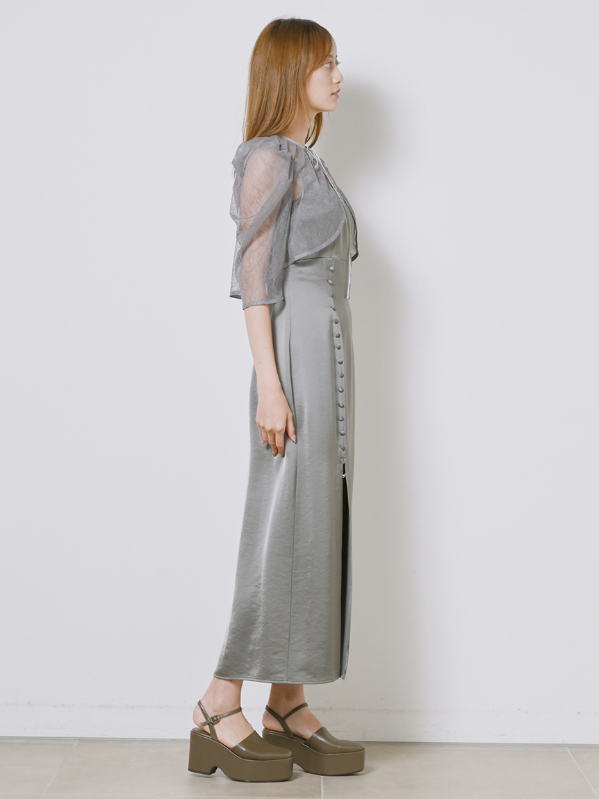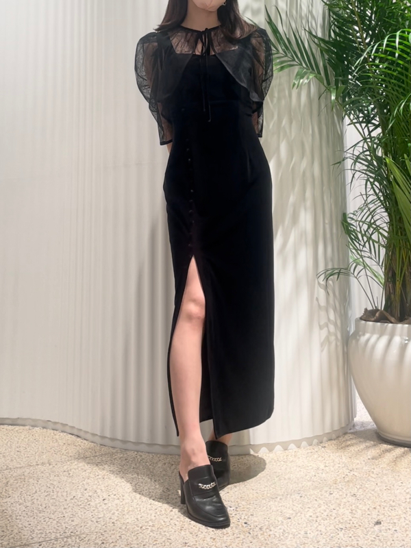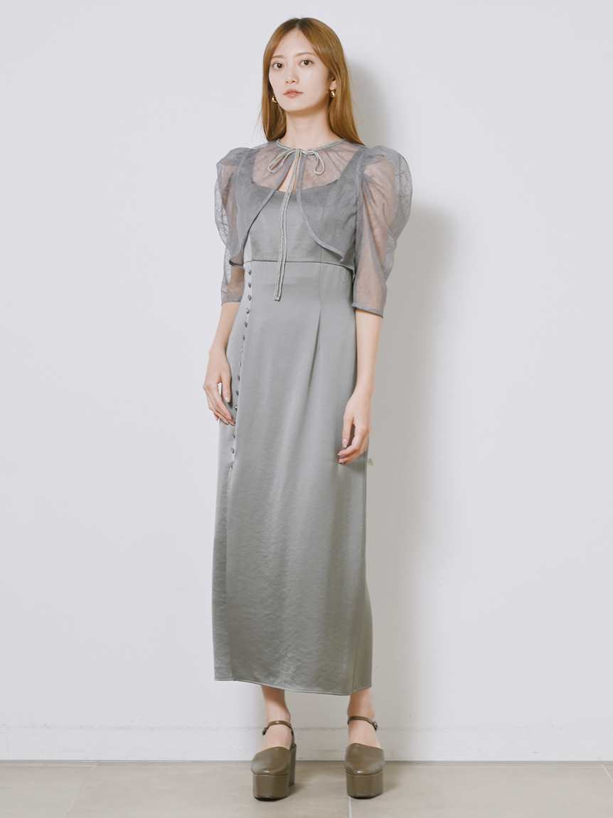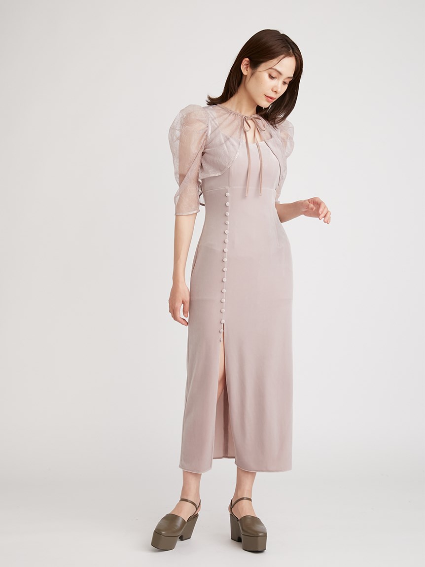 繊細なレースのショートボレロがセットになったノースリーブワンピース。ワンピースは巧みな切り替えが光るタイトシルエットで女性らしさ溢れる仕上がりに。サイドには深めにスリットをあしらい、色香漂うセンシュアルな肌見せを演出しています。