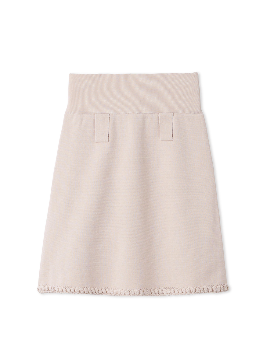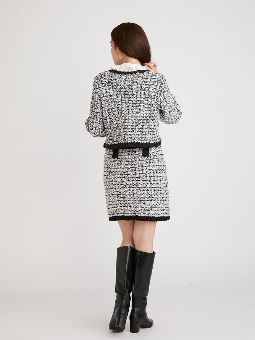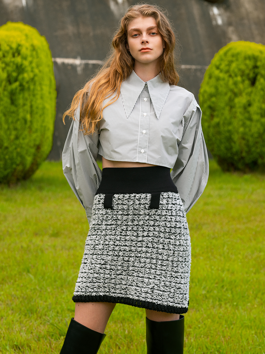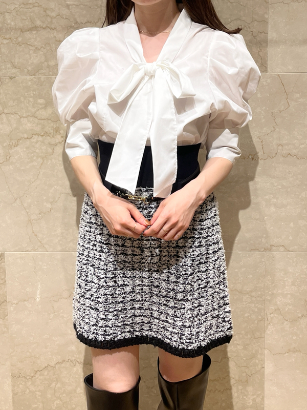 ボディラインにフィットするタイトシルエットが印象的な、女性らしい着こなしを叶えるミニスカート。ややローウエストの位置にあしらわれたベルトループがトレンド感を高めるキーポイント。お手持ちのベルトでマークすれば、スタイリングの完成度が一気に高まります。ブラウスやニットなど様々なトップスと合わせやすく、同素材を用いたニットジャケット(SWNT224112)とセットでスタイリングするのもオススメです。