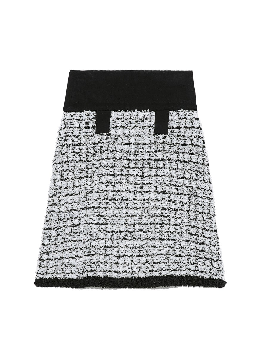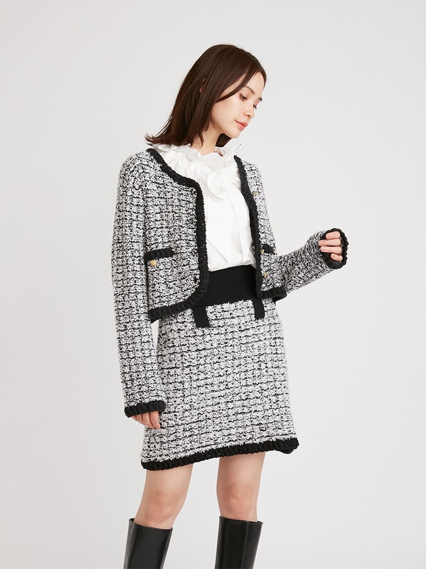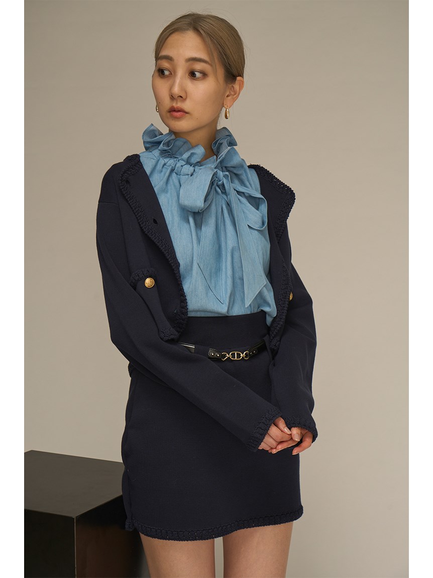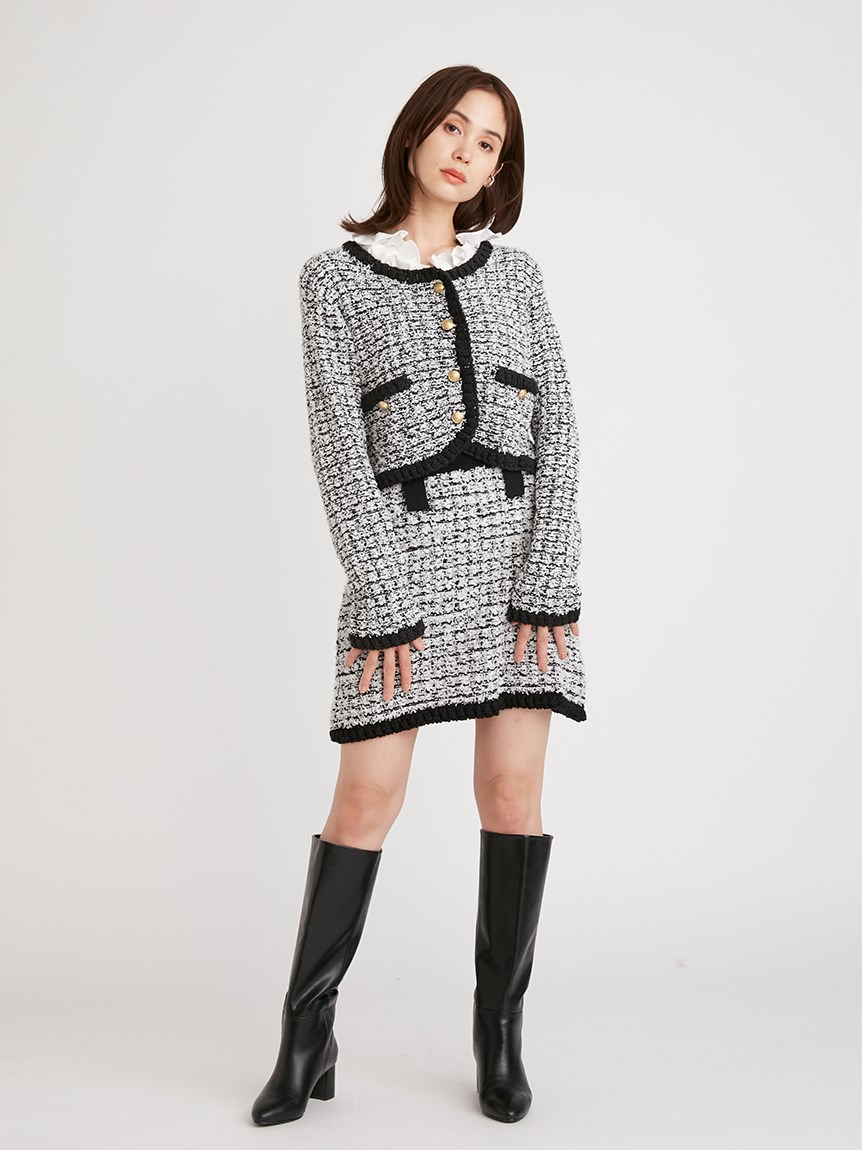 ボディラインにフィットするタイトシルエットが印象的な、女性らしい着こなしを叶えるミニスカート。ややローウエストの位置にあしらわれたベルトループがトレンド感を高めるキーポイント。お手持ちのベルトでマークすれば、スタイリングの完成度が一気に高まります。ブラウスやニットなど様々なトップスと合わせやすく、同素材を用いたニットジャケット(SWNT224112)とセットでスタイリングするのもオススメです。