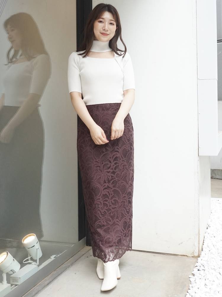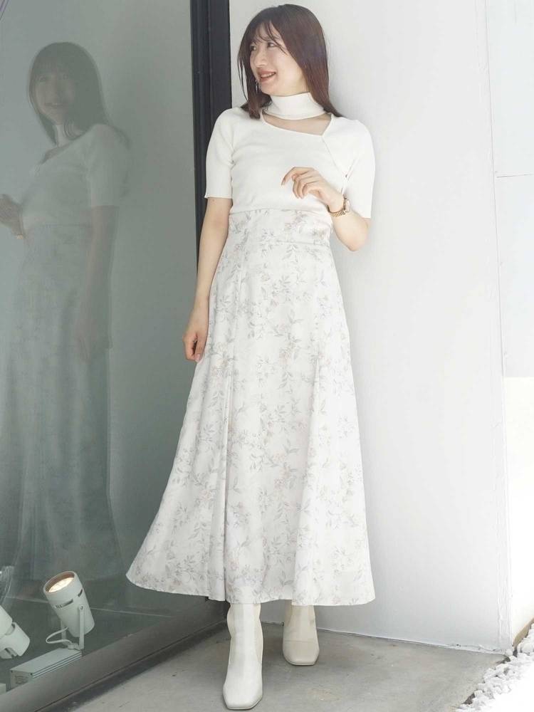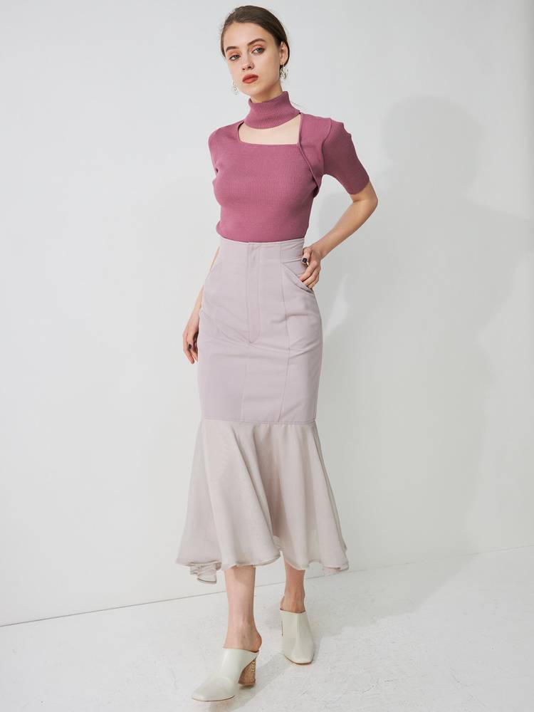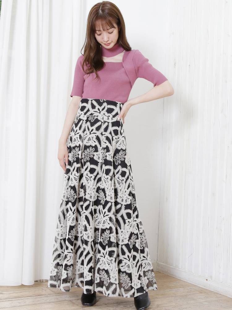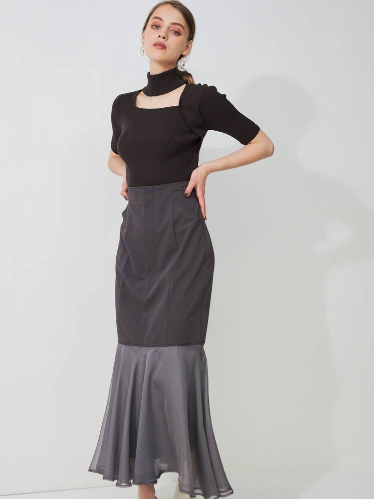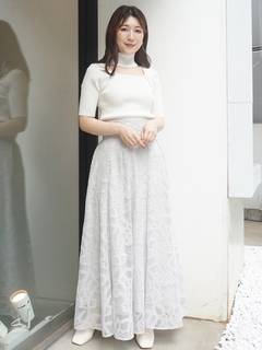レースや刺繍スカートとの甘辛なスタイリングから、デニムやパンツスタイルでカジュアルなスタイルまで、着回し抜群のアイテム◎ドッキングツイルマーメイドフレアスカートと、トーン×トーンのカラースタイリングもお勧めです。