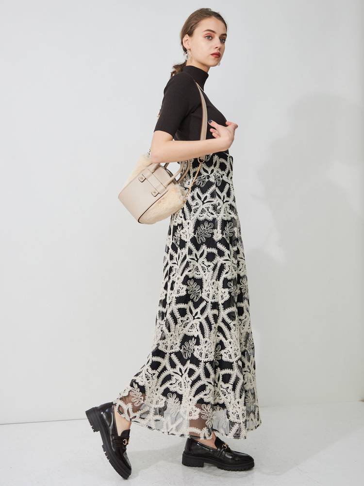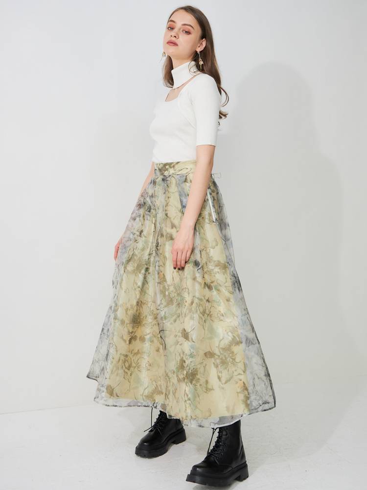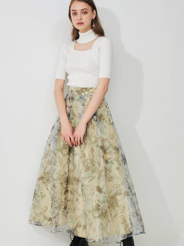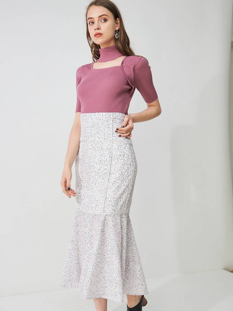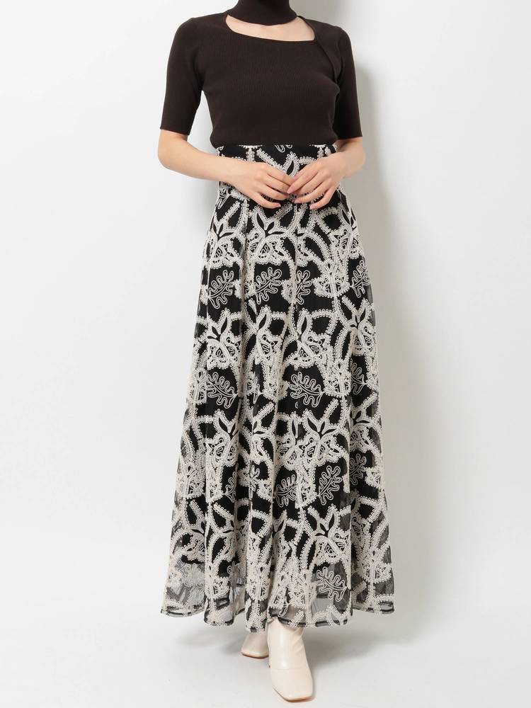 レースや刺繍スカートとの甘辛なスタイリングから、デニムやパンツスタイルでカジュアルなスタイルまで、着回し抜群のアイテム◎ドッキングツイルマーメイドフレアスカートと、トーン×トーンのカラースタイリングもお勧めです。