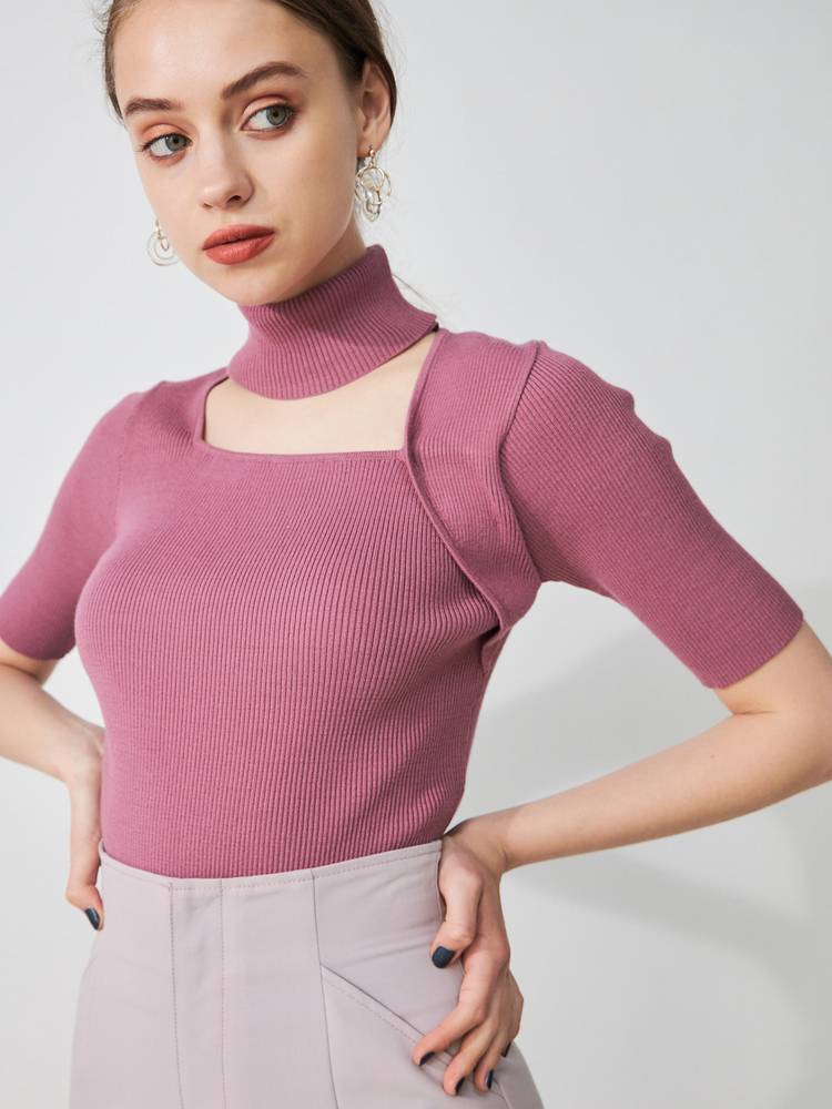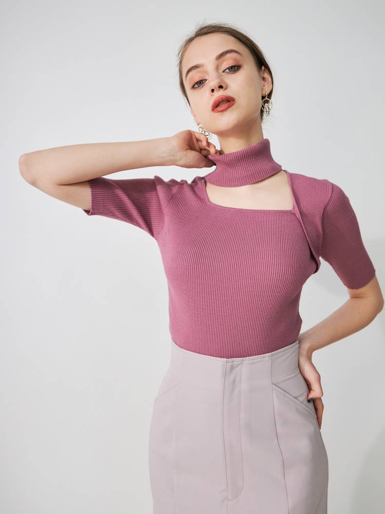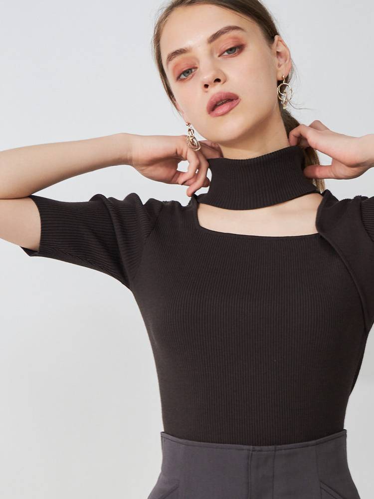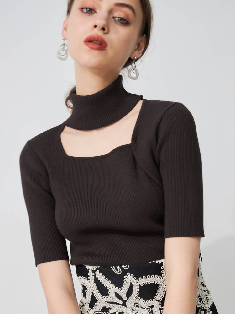 デコルテを綺麗に見せる開きと、折り返しのハイネックが大人っぽい印象です。