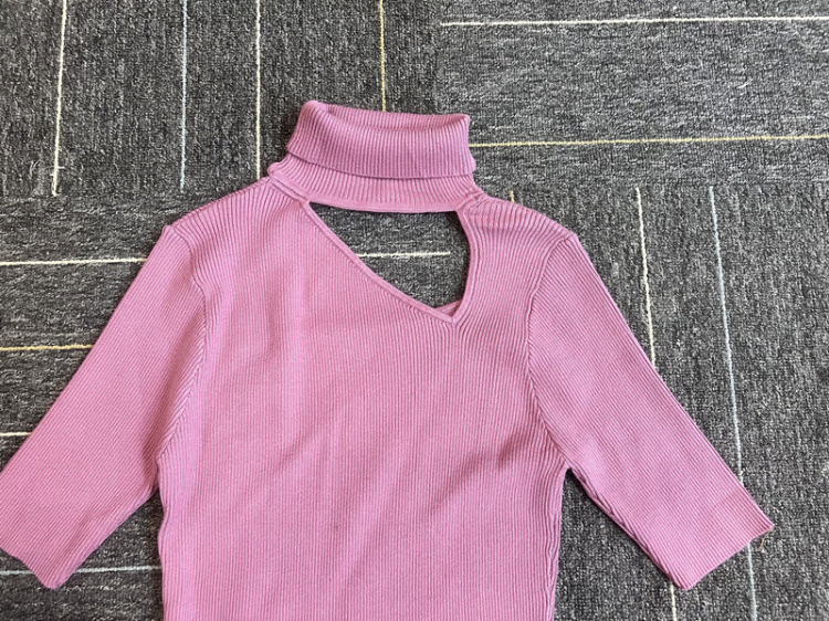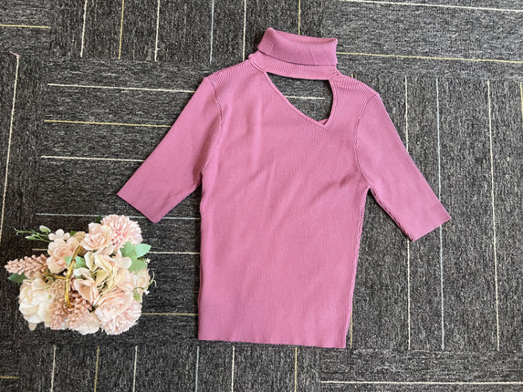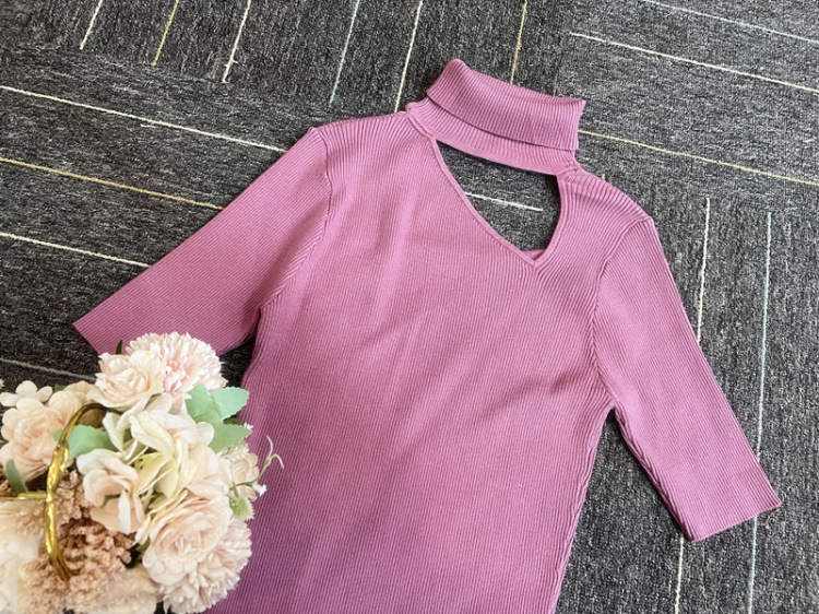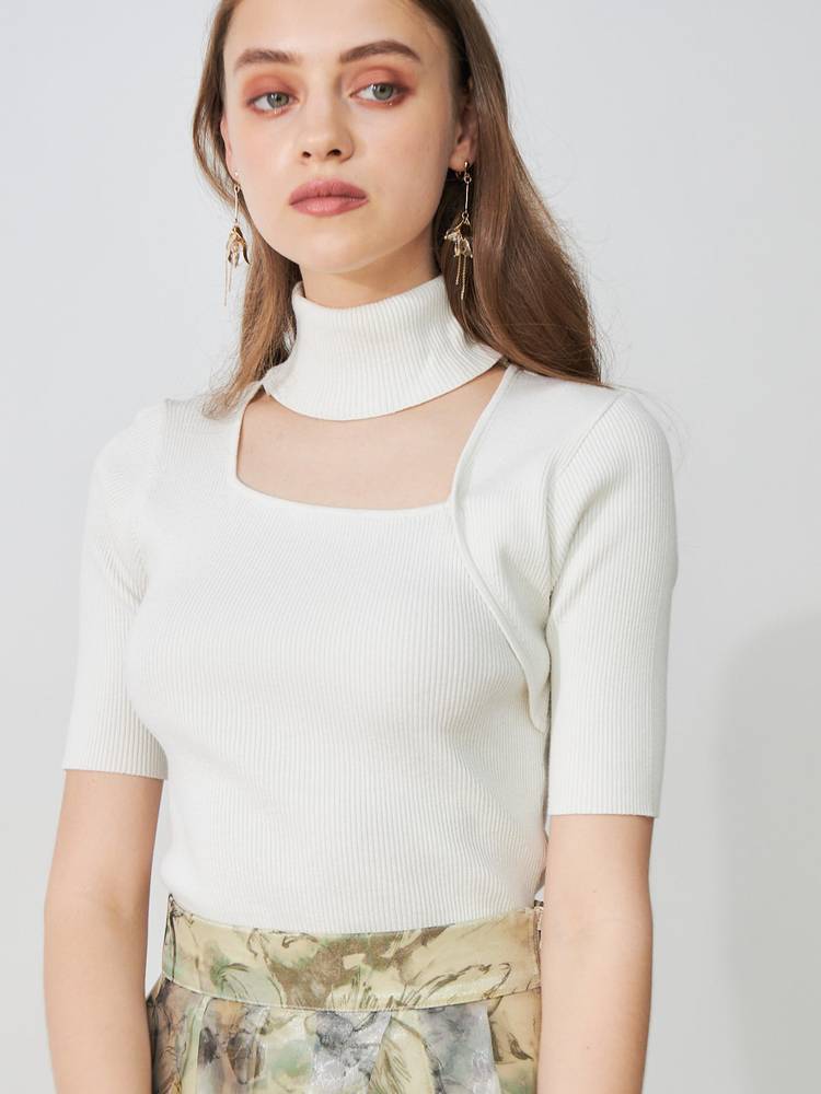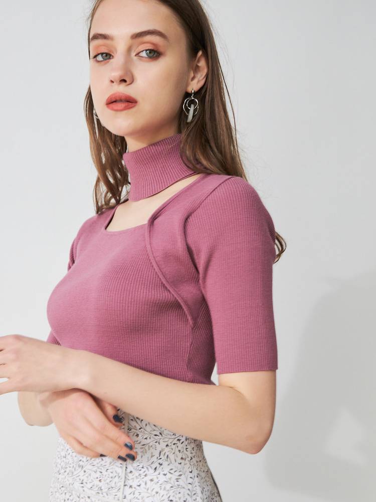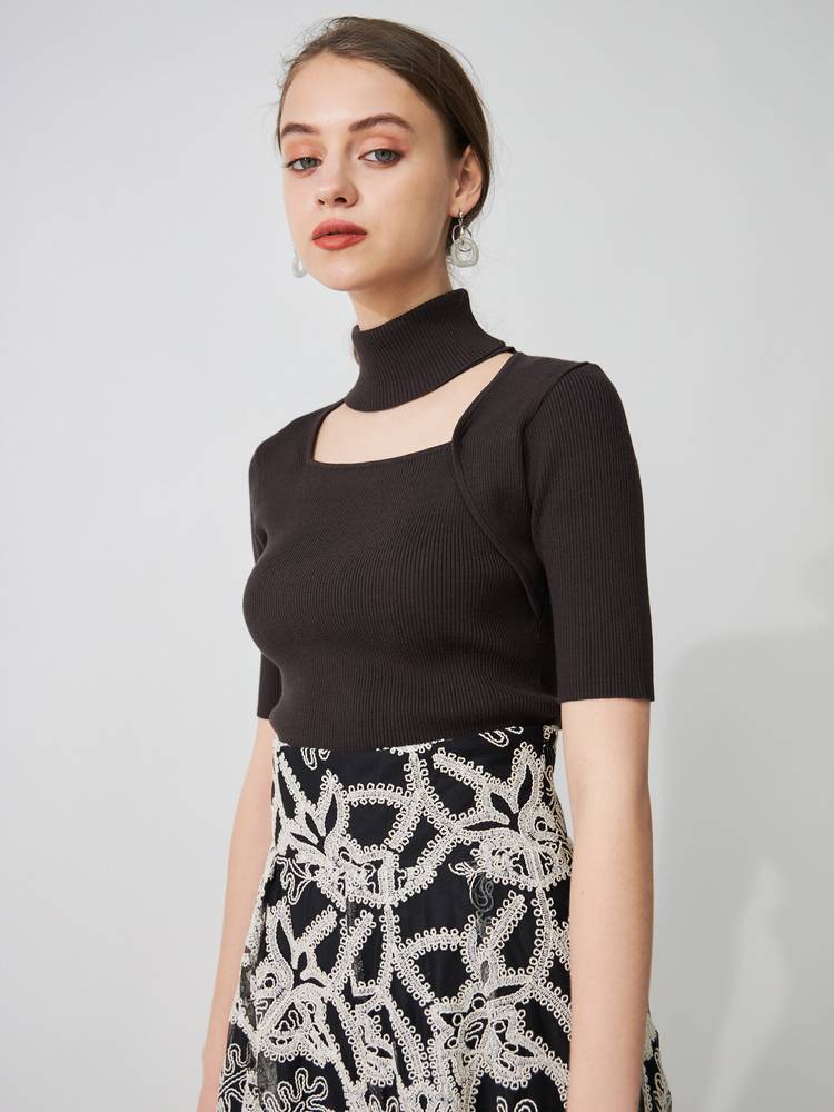 デコルテを綺麗に見せる開きと、折り返しのハイネックが大人っぽい印象です。