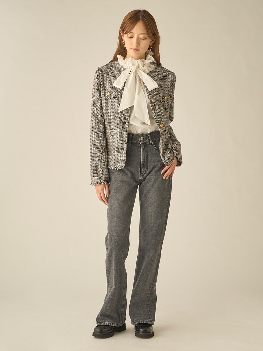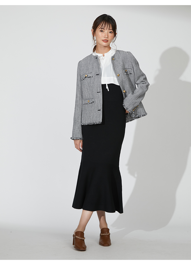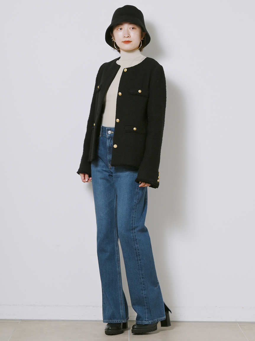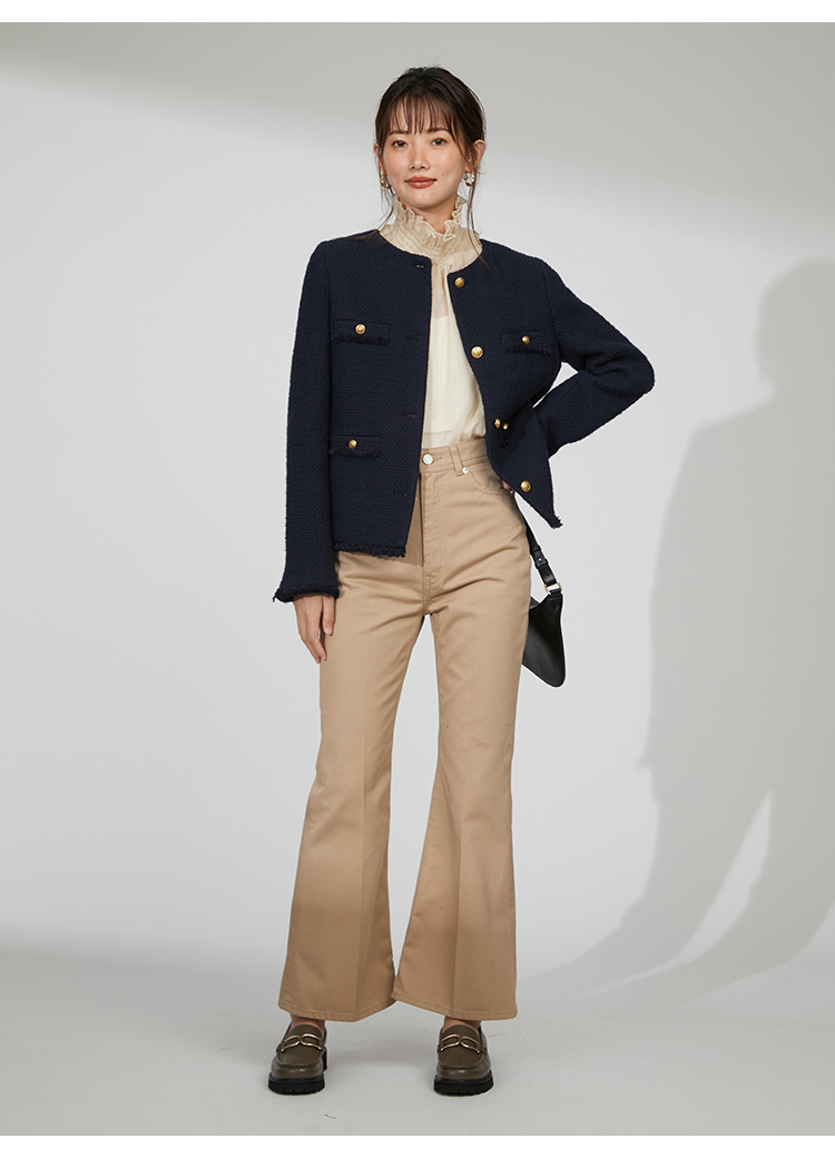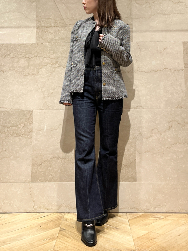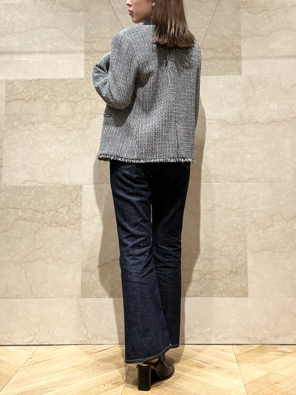 存在感のあるゴールドボタンやフラップポケットなどの王道ディテールを落とし込んだ、スタンダードなデザインのツイードジャケット。今季のワードローブに欠かせないトレンド感溢れる1着です。シルエットはゆる過ぎずタイト過ぎない絶妙なバランスに。女性らしいスカートからカジュアルなデニムまで様々なアイテムと合わせやすく、幅広いスタイリングに重宝します。