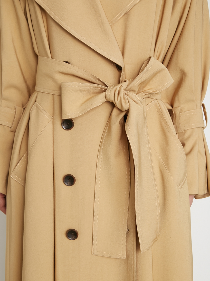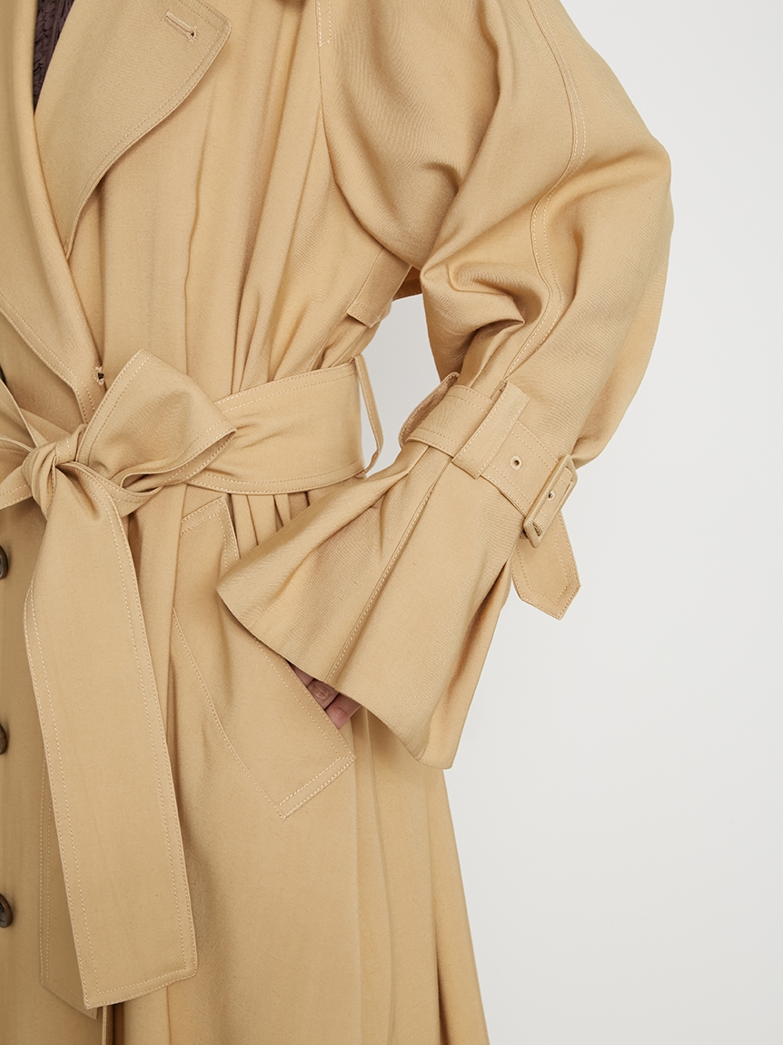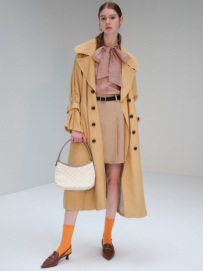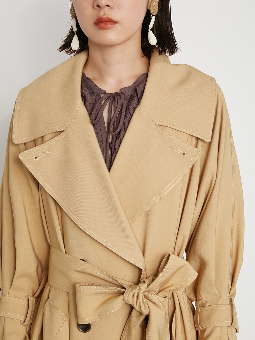 トレンド感のあるビッグカラーがポイントになったクラシカルなトレンチコート。顔回りがすっきり見えるように襟を少し抜き、天幅から前下がりまでを計算して美しいラインを演出しています。共布ベルトでウエストをきゅっと結べば、女性らしいメリハリのあるシルエットに。袖口はタックを寄せ、そこから広がるフレアなフォルムでエレガントさが高まります。少し袖を上げて着ると袖がくしゅっとし、ボリュームが出て手首が細見えするのもポイント。襟のシルエット、ステッチ、ベルト巾など細かなディテールはヴィンテージのトレンチコートからオマージュしたデザインで仕上げています。