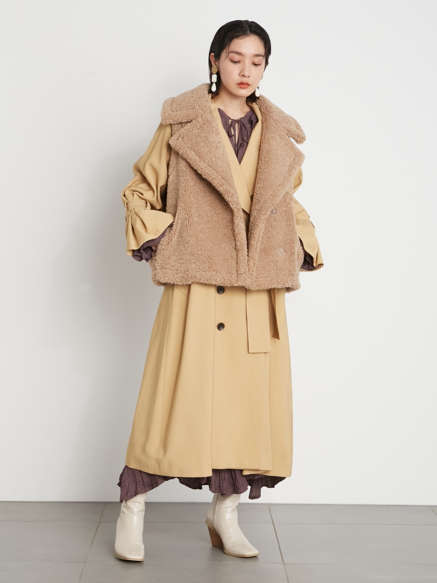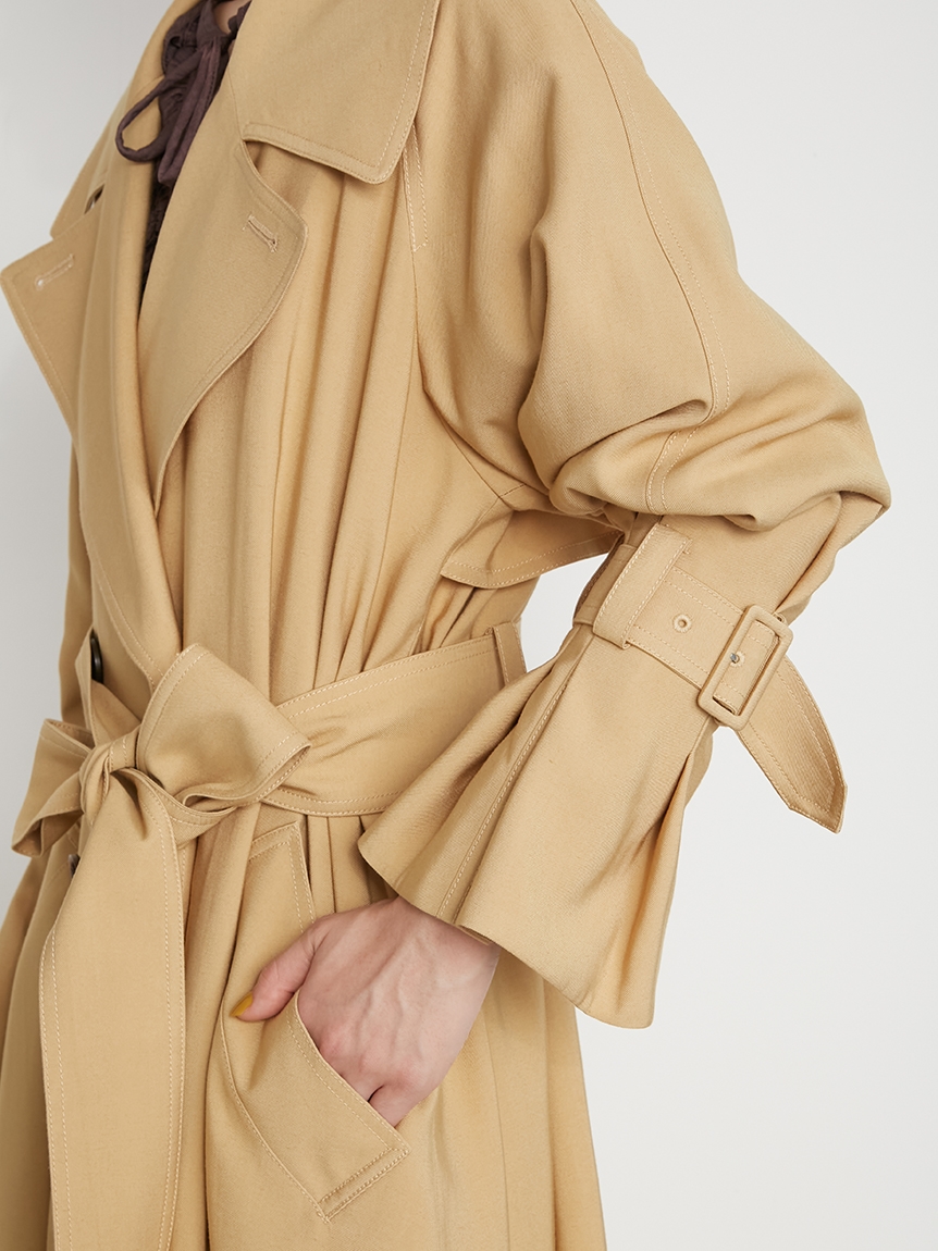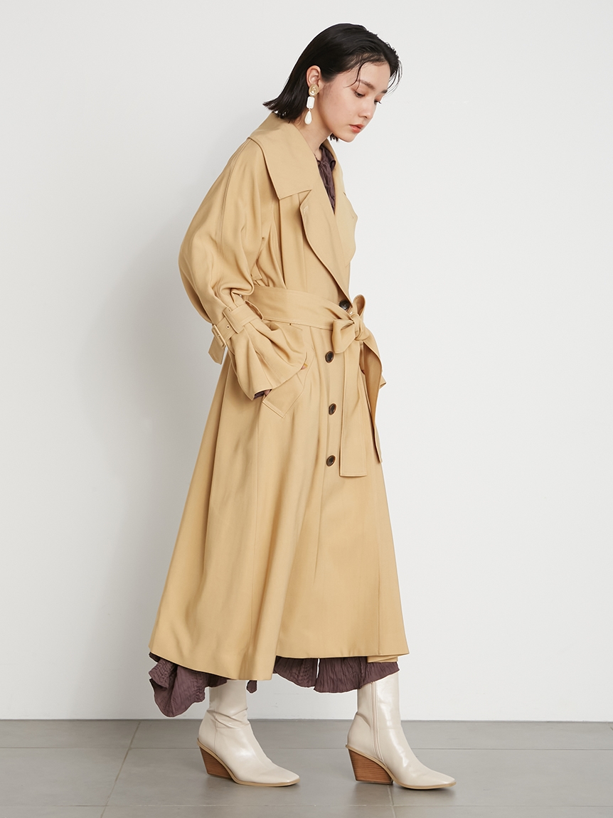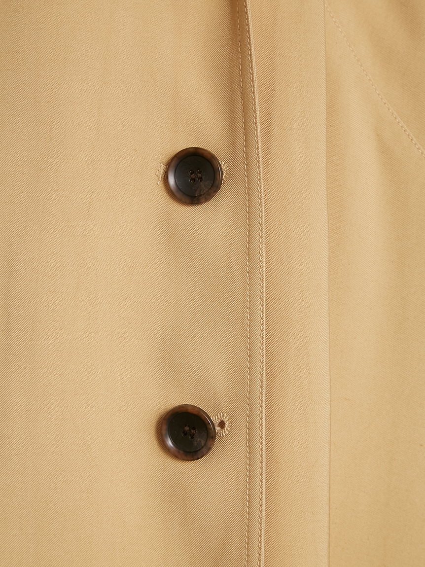 トレンド感のあるビッグカラーがポイントになったクラシカルなトレンチコート。顔回りがすっきり見えるように襟を少し抜き、天幅から前下がりまでを計算して美しいラインを演出しています。共布ベルトでウエストをきゅっと結べば、女性らしいメリハリのあるシルエットに。袖口はタックを寄せ、そこから広がるフレアなフォルムでエレガントさが高まります。少し袖を上げて着ると袖がくしゅっとし、ボリュームが出て手首が細見えするのもポイント。襟のシルエット、ステッチ、ベルト巾など細かなディテールはヴィンテージのトレンチコートからオマージュしたデザインで仕上げています。