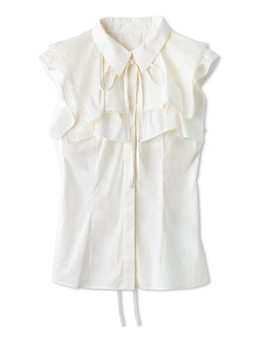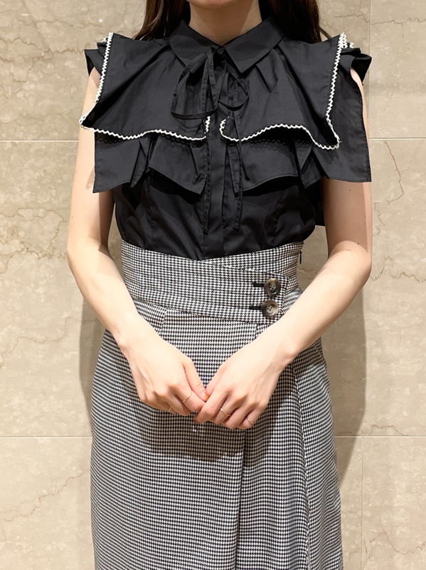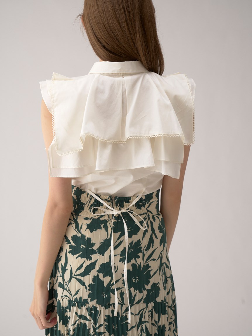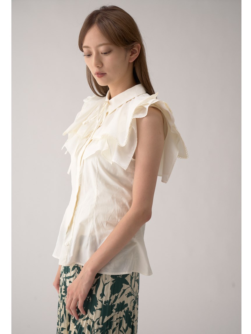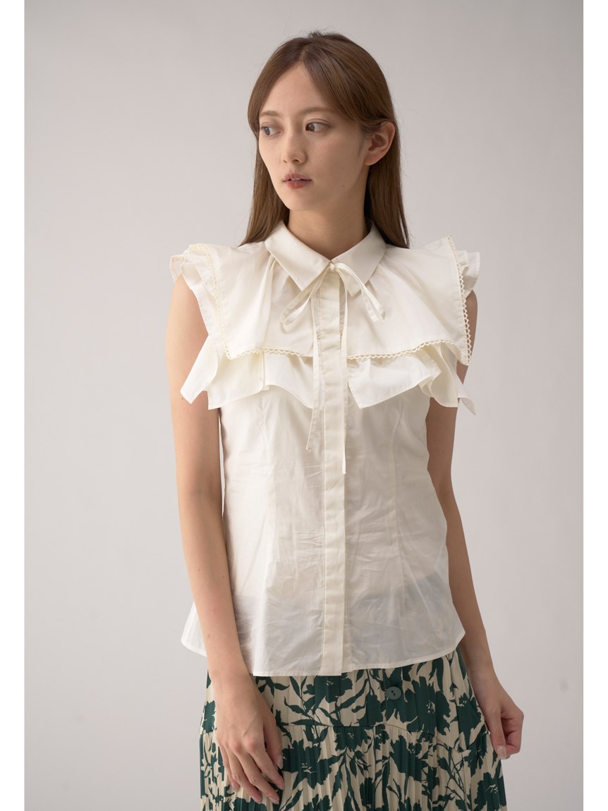 ひらりと軽やかに揺れるティアードフリルが印象的な、華やかな雰囲気のノースリーブブラウス。スクエア型にすることで甘さを程よく抑え、トレンドライクに仕上げました。さり気なく施されたレースのトリミングが女性らしさを高めるポイント。ボディラインに沿うすっきりとしたシルエットなので、ボトムにインしてもアウトでもバランス良く合わせられます。