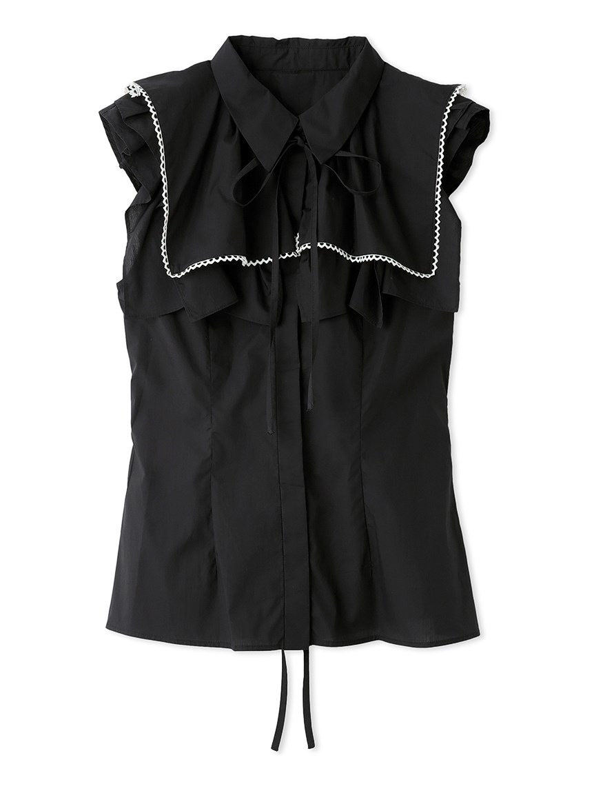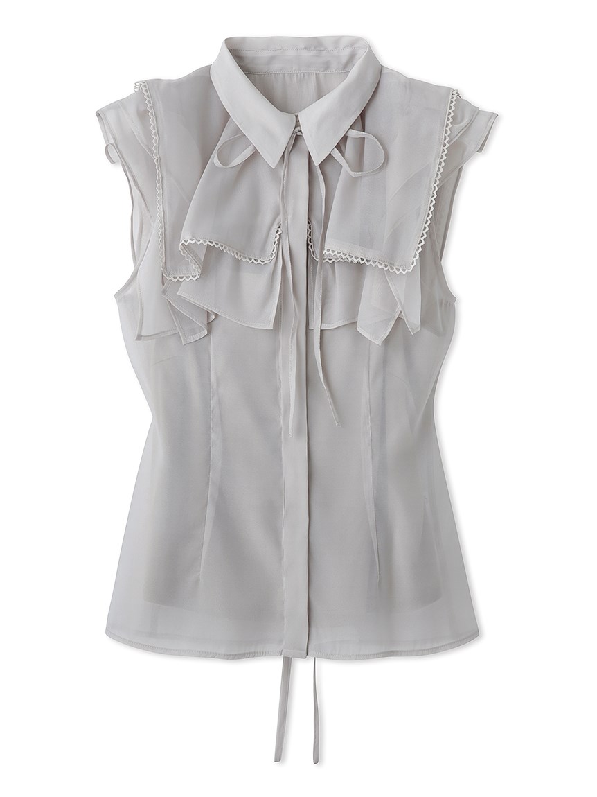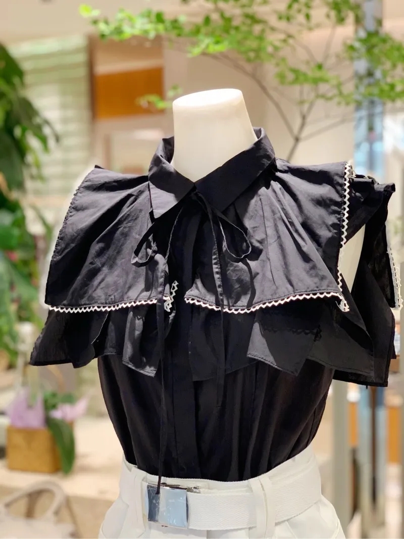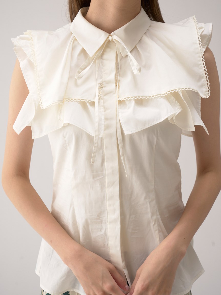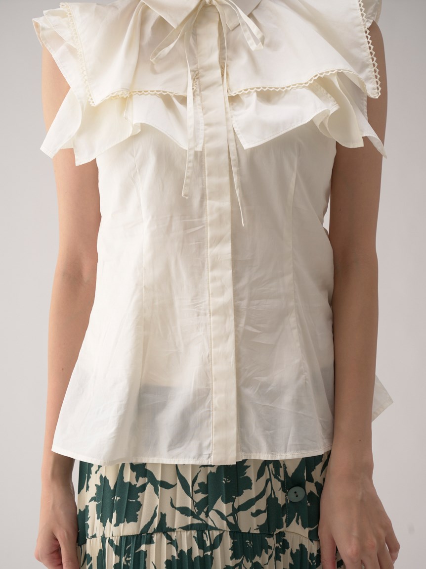 ひらりと軽やかに揺れるティアードフリルが印象的な、華やかな雰囲気のノースリーブブラウス。スクエア型にすることで甘さを程よく抑え、トレンドライクに仕上げました。さり気なく施されたレースのトリミングが女性らしさを高めるポイント。ボディラインに沿うすっきりとしたシルエットなので、ボトムにインしてもアウトでもバランス良く合わせられます。