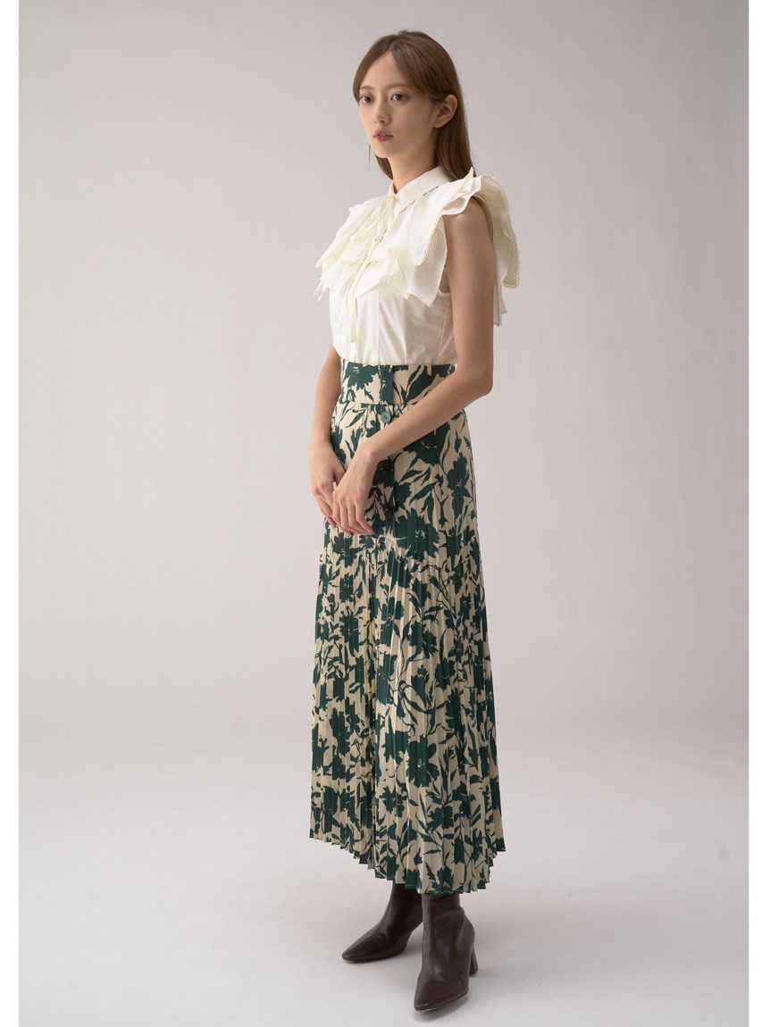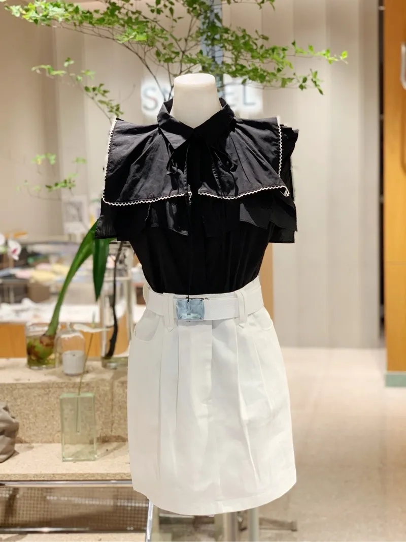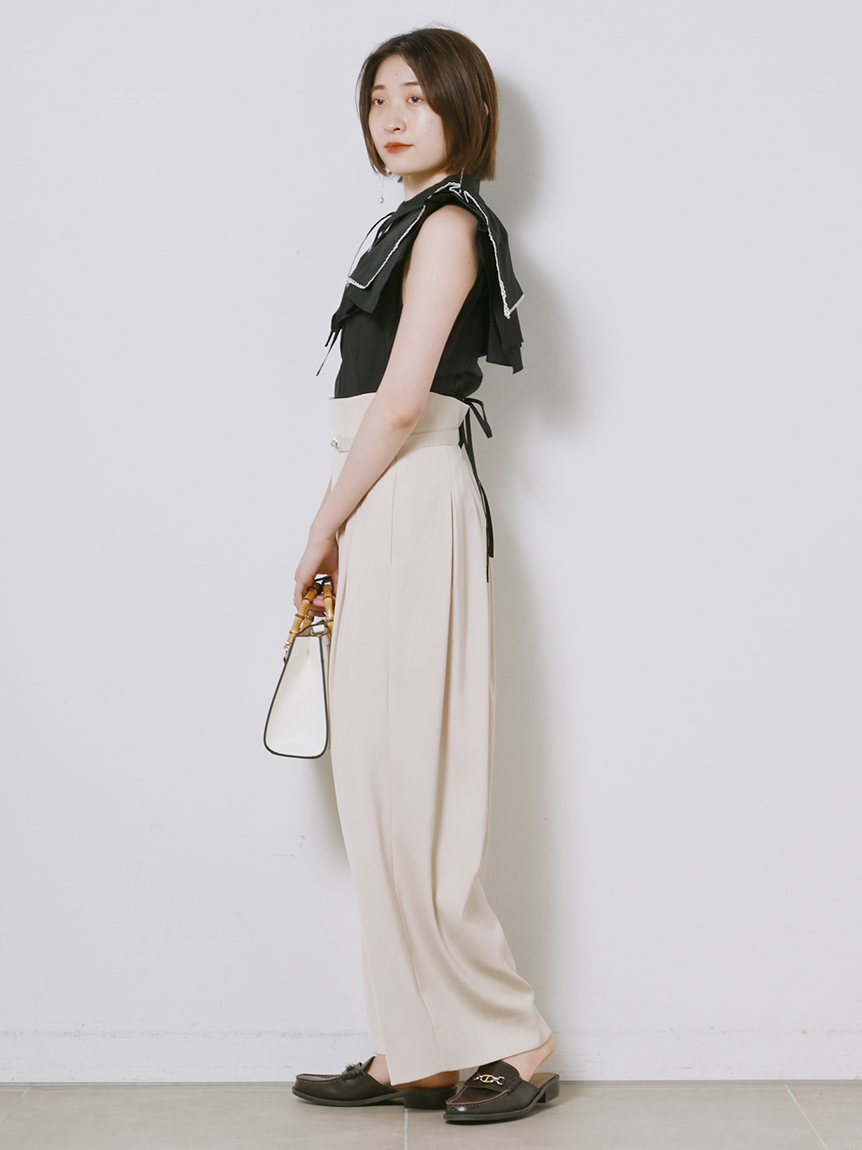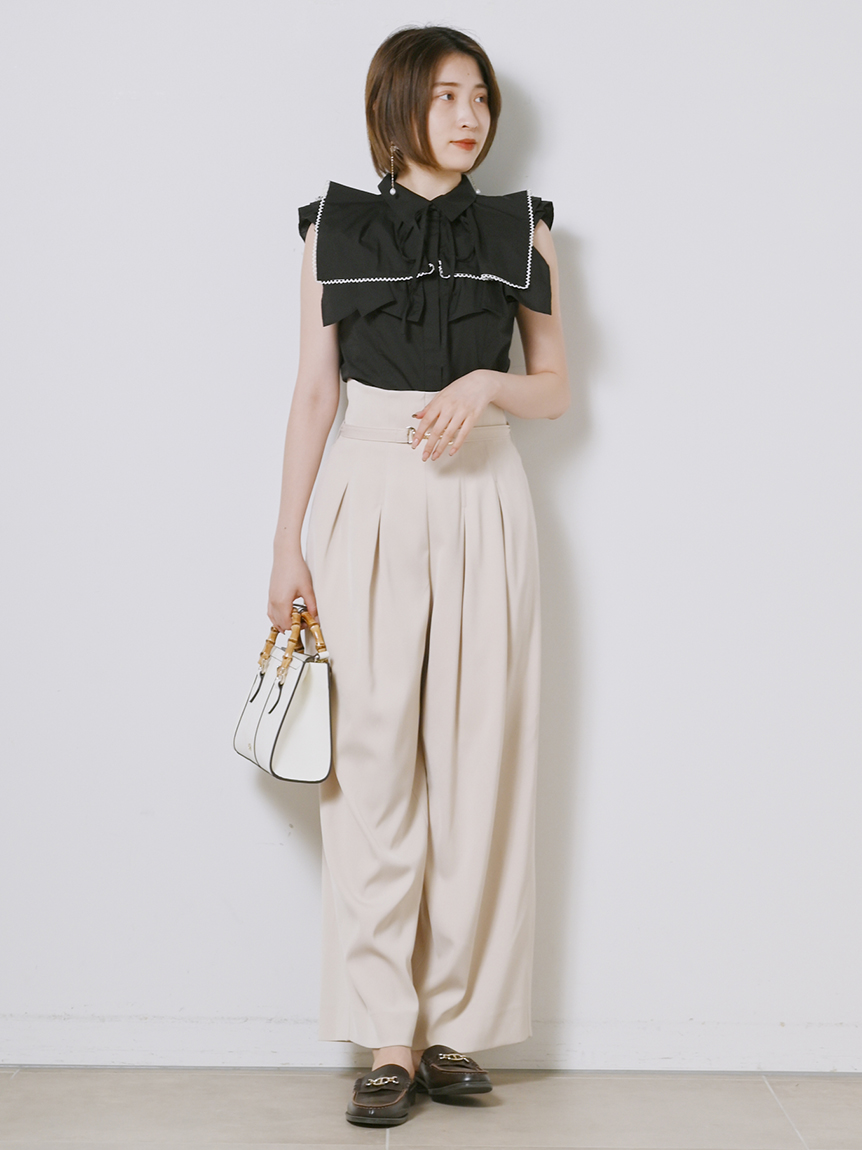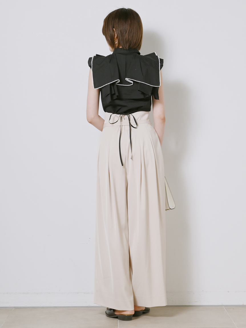 ひらりと軽やかに揺れるティアードフリルが印象的な、華やかな雰囲気のノースリーブブラウス。スクエア型にすることで甘さを程よく抑え、トレンドライクに仕上げました。さり気なく施されたレースのトリミングが女性らしさを高めるポイント。ボディラインに沿うすっきりとしたシルエットなので、ボトムにインしてもアウトでもバランス良く合わせられます。