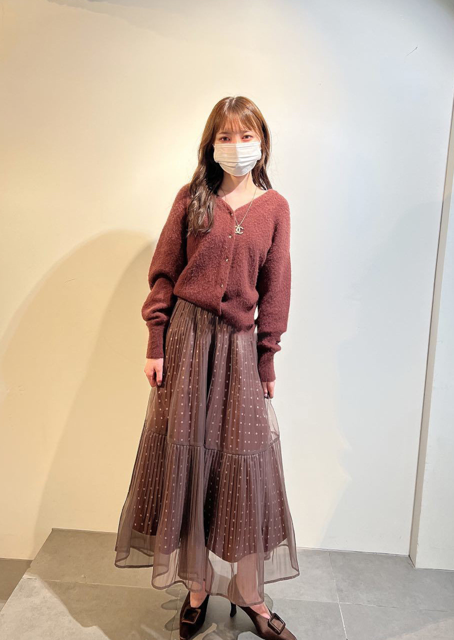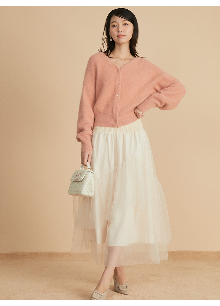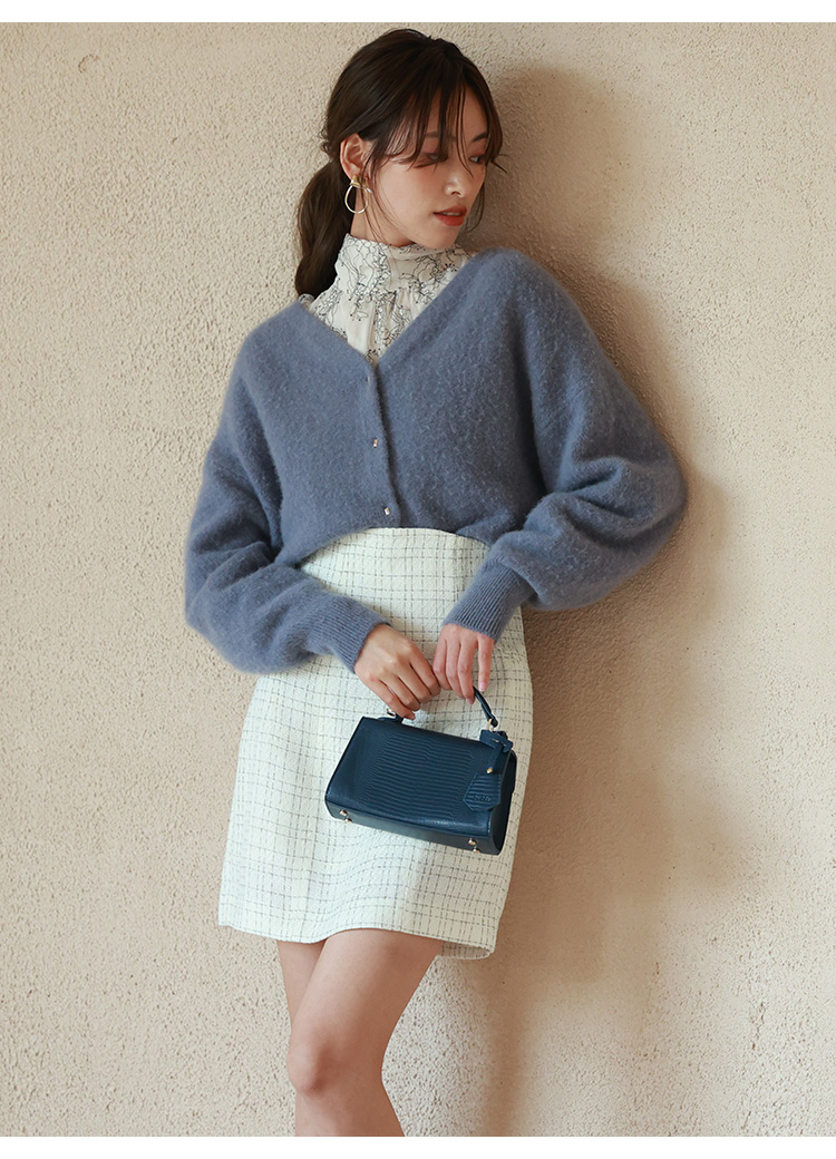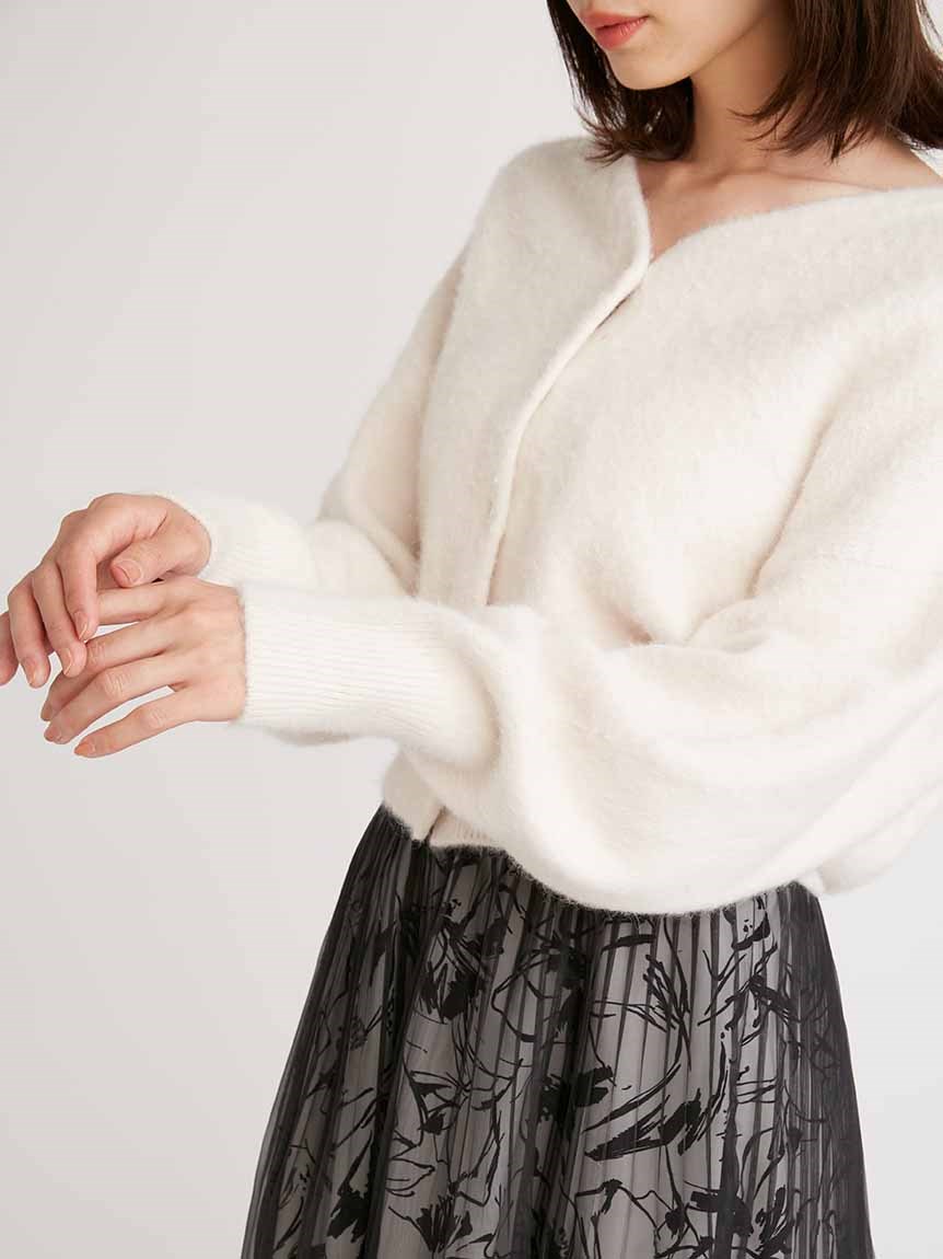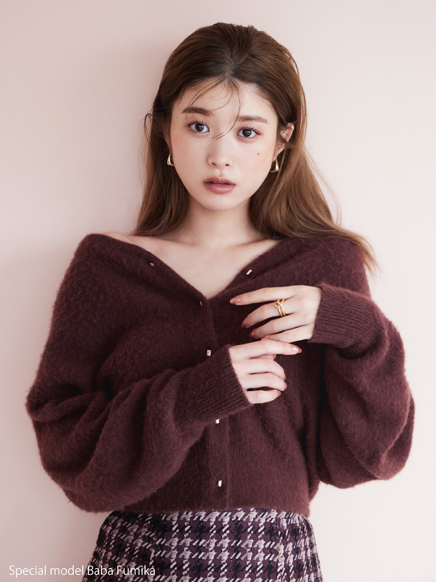 ラクーン混の柔らかく暖かなニット素材を使用しました。ベーシックカラーのアイボリーとブラウン、差し色にぴったりなコーラルとブルーの豊富なカラーバリエーションでお届けします。