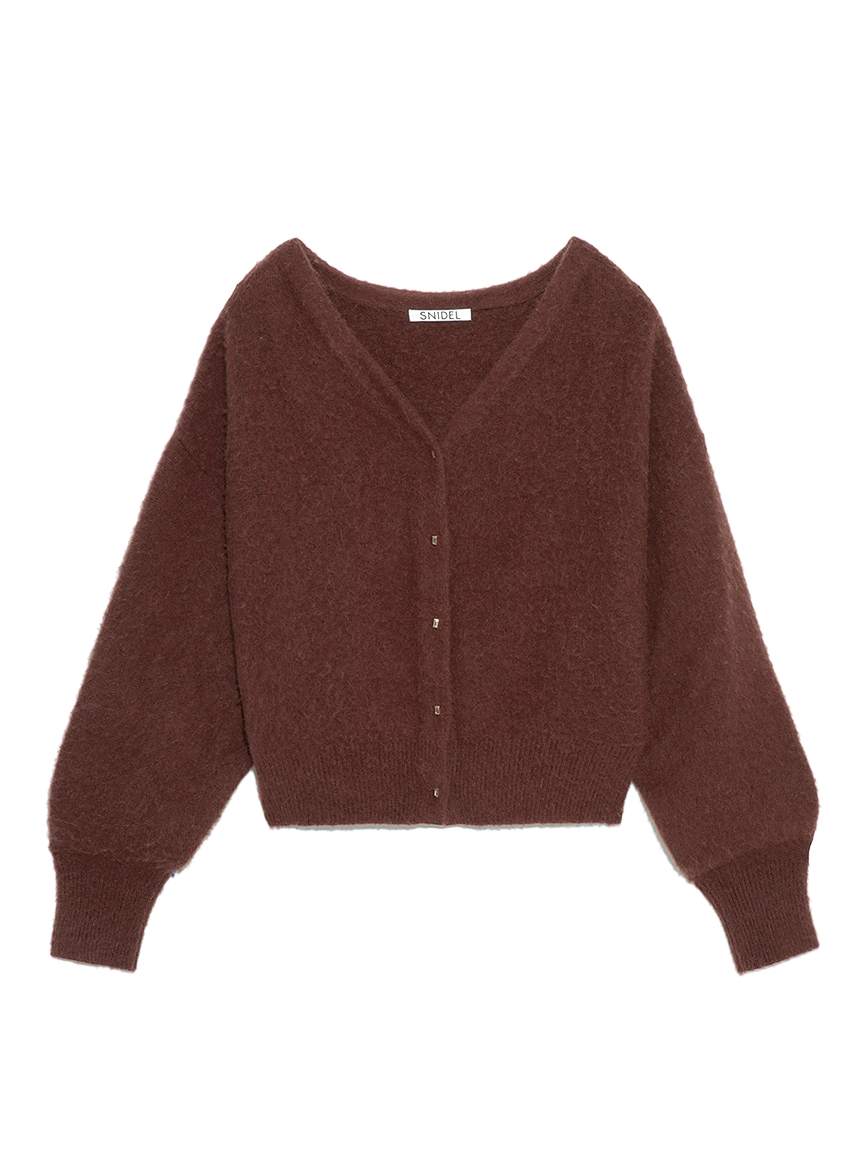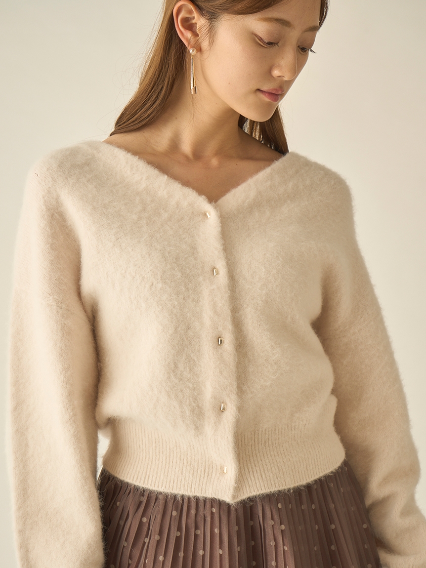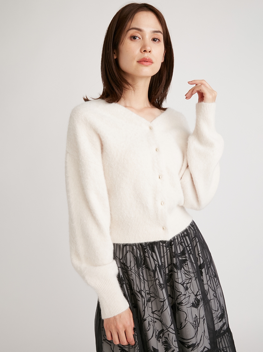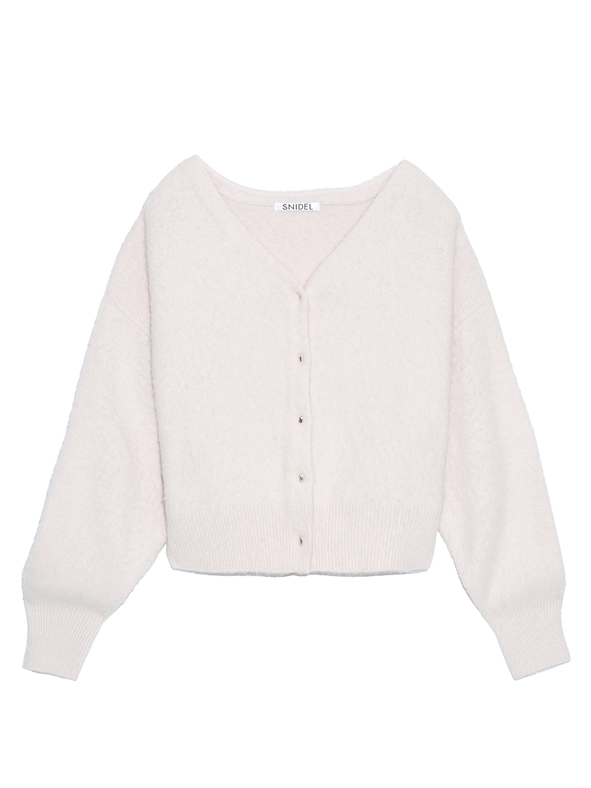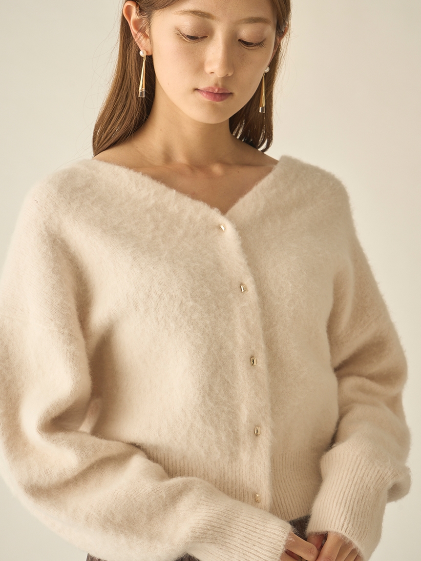 ふわふわと起毛感のある柔らかなニット素材を使用した、見た目も着心地もあたたかなカーディガン。フロントにあしらわれた小さな金ボタンがクラス感を高めるさり気ないアクセントに。シルエットはすっきりとしてシンプルなので、合わせるボトムを選ばず幅広く活躍してくれます。カーディガンとしてはもちろん、フロントボタンをすべて閉めてトップスとして着こなすのもおすすめ。