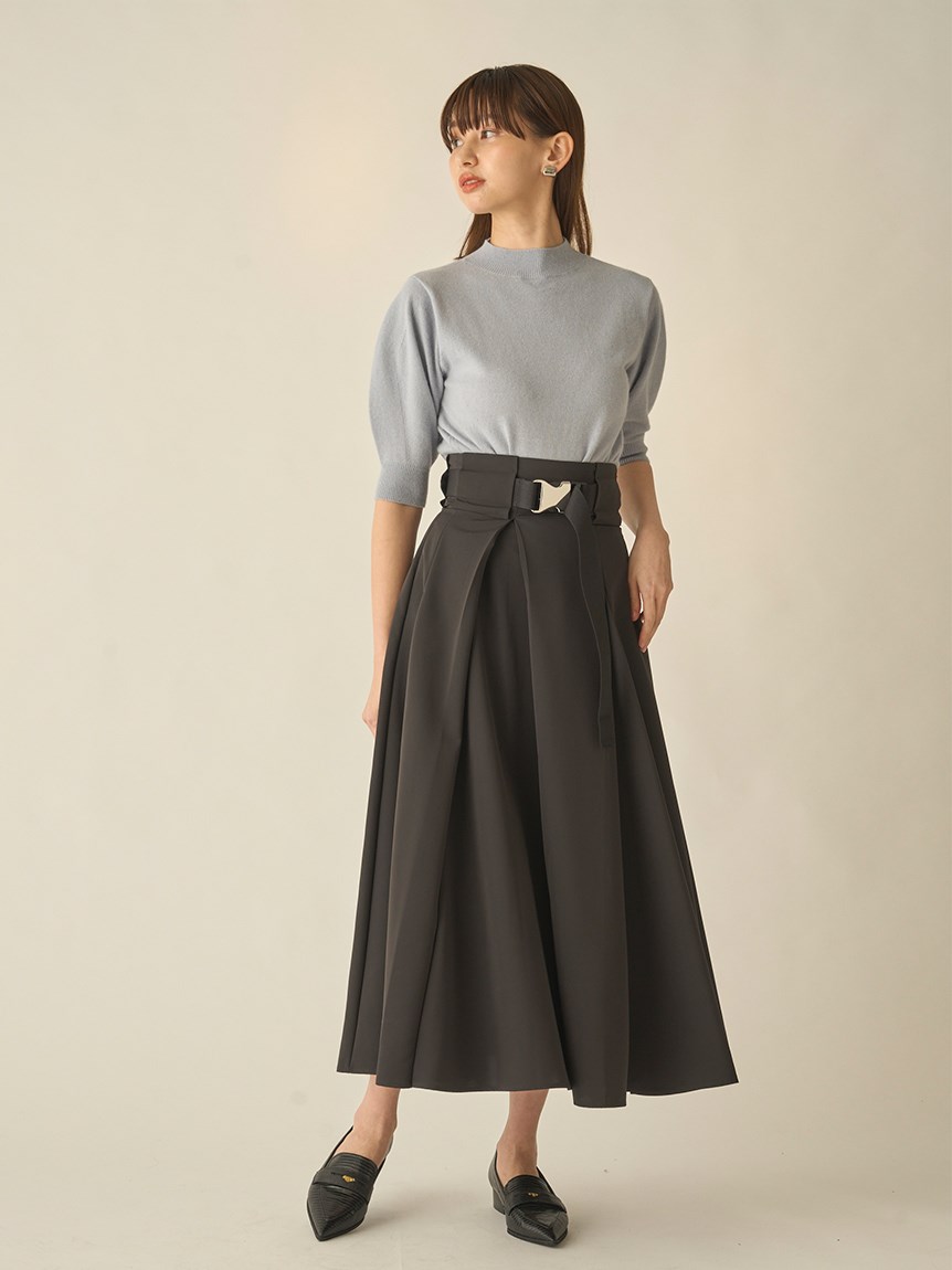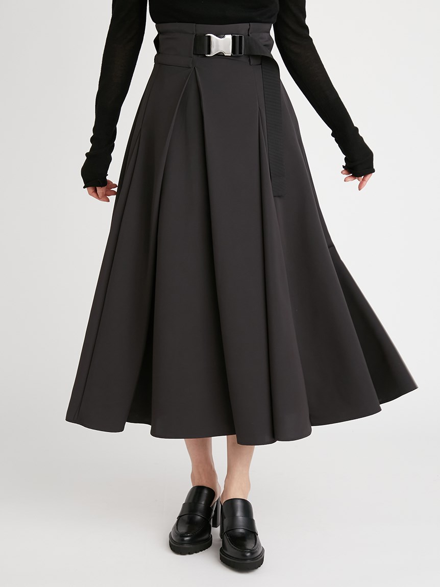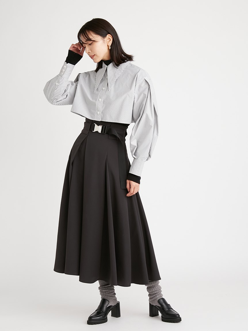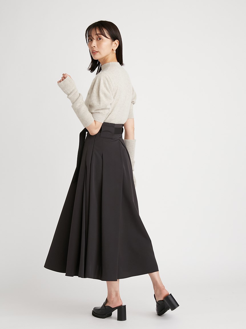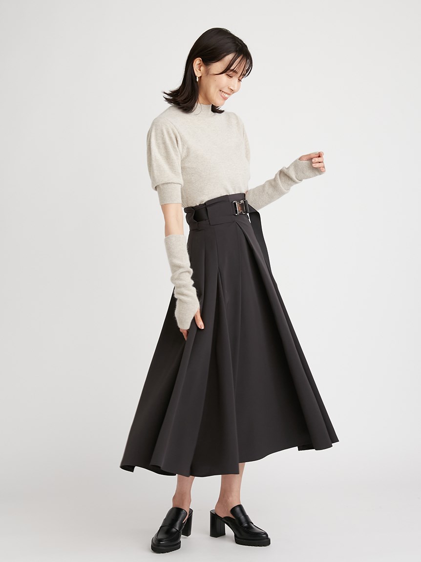 タックをふんだんに取り入れたボリュームのあるフレアシルエットが印象的な、女性らしさとモード感が絶妙に絡み合うロングスカート。ハイウエストの位置にベルトでマークすることでメリハリ感が生まれ、重さがありながらもスマートに着こなせます。ウエストデザインを活かすようトップスはインしてコンパクトにまとめるのがおすすめ。トレンドのショート丈トップスともバランス良く合わせられます。