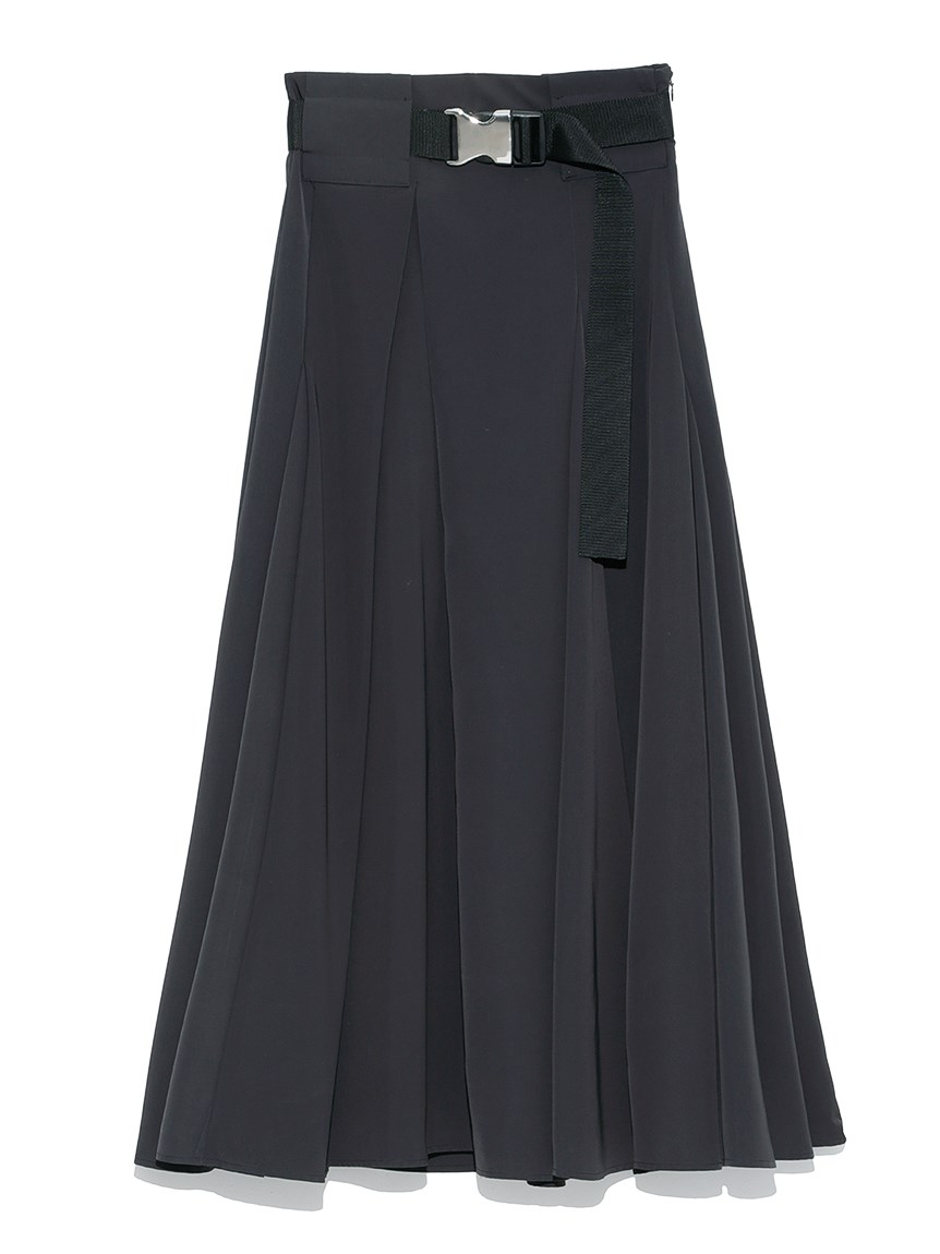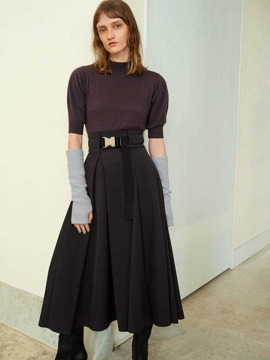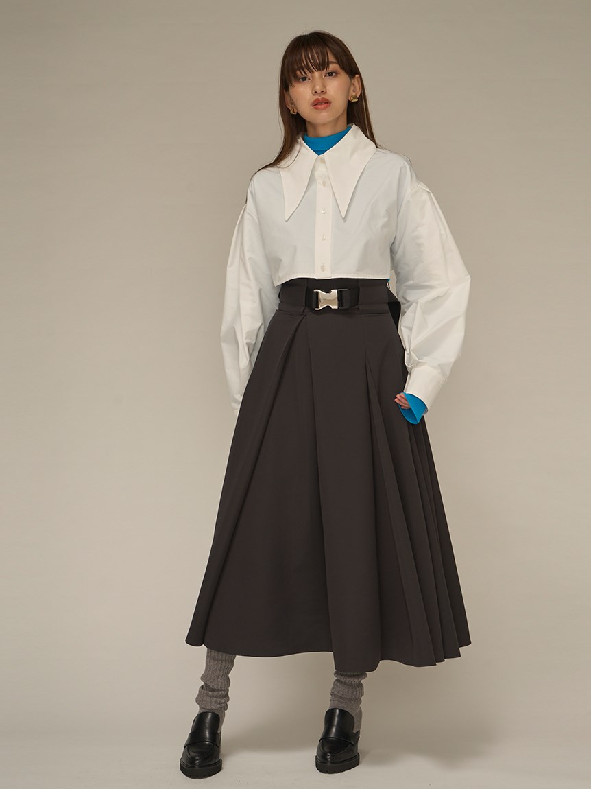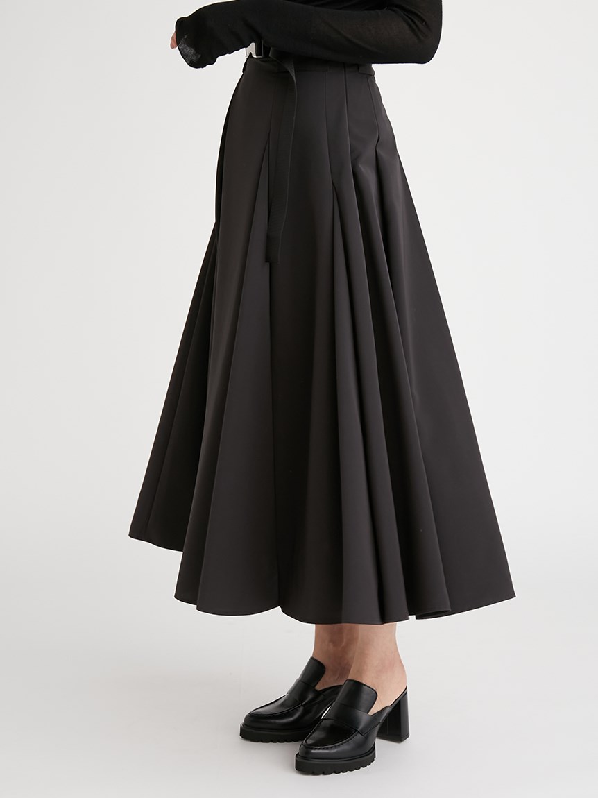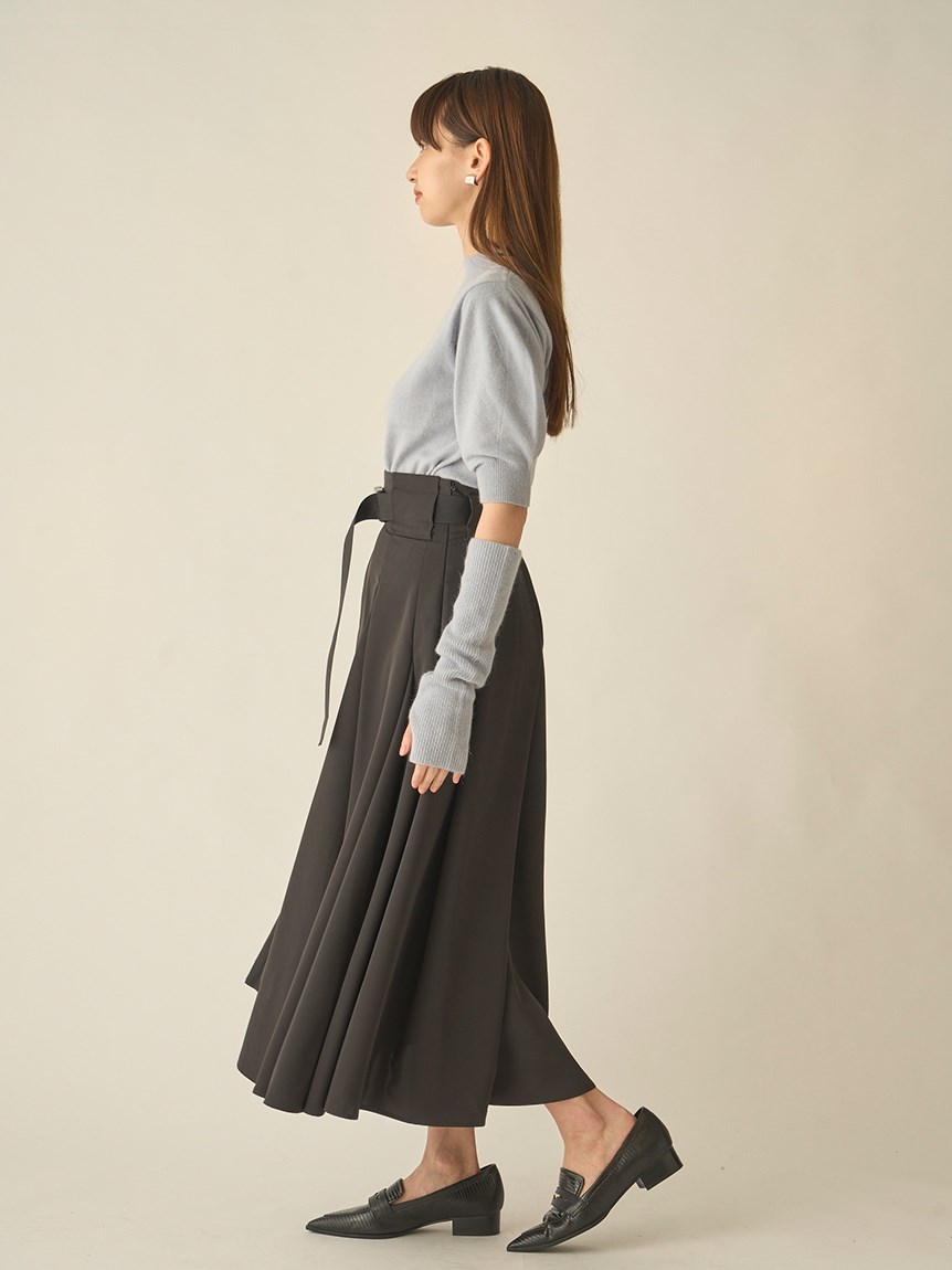 タックをふんだんに取り入れたボリュームのあるフレアシルエットが印象的な、女性らしさとモード感が絶妙に絡み合うロングスカート。ハイウエストの位置にベルトでマークすることでメリハリ感が生まれ、重さがありながらもスマートに着こなせます。ウエストデザインを活かすようトップスはインしてコンパクトにまとめるのがおすすめ。トレンドのショート丈トップスともバランス良く合わせられます。