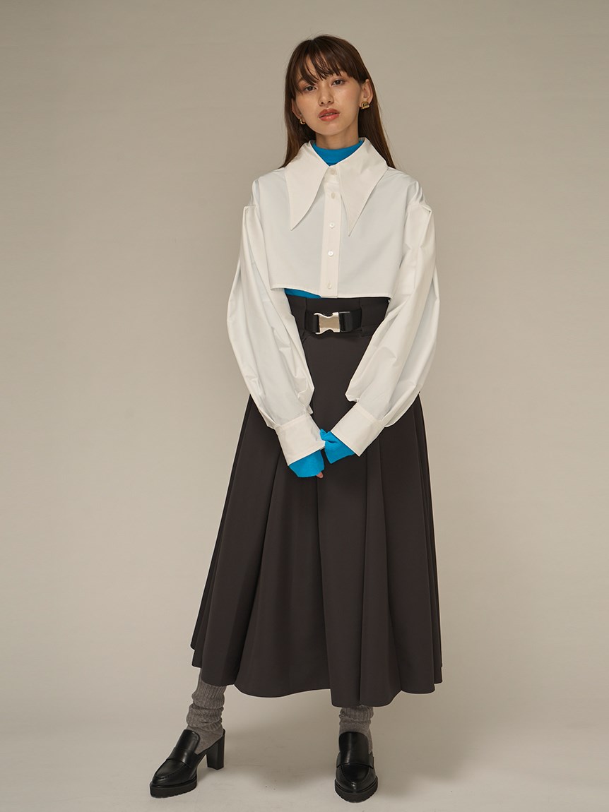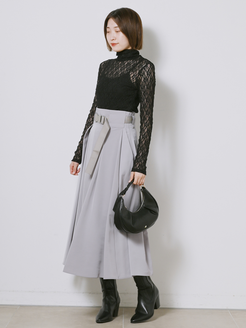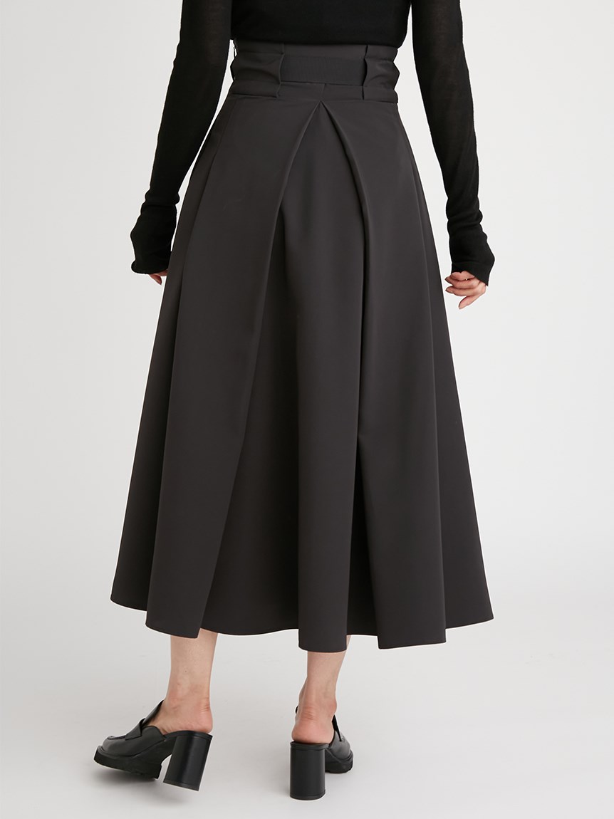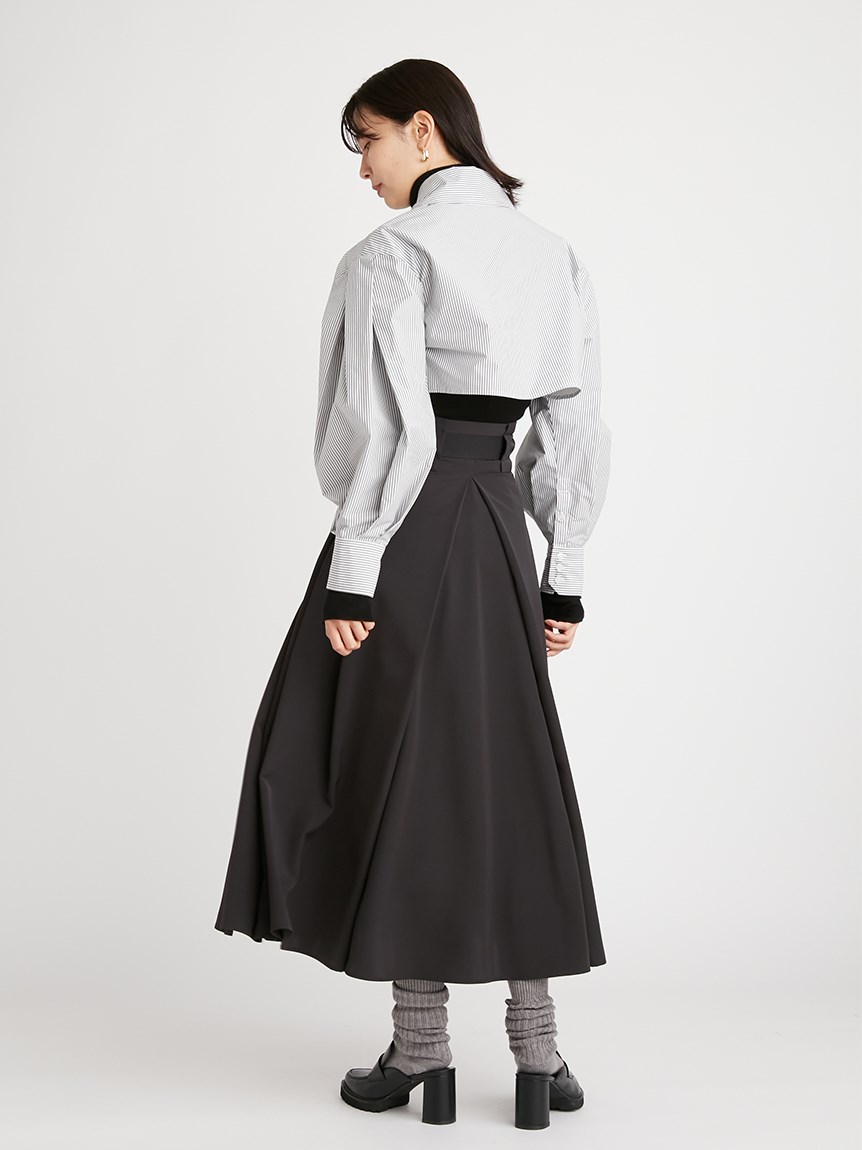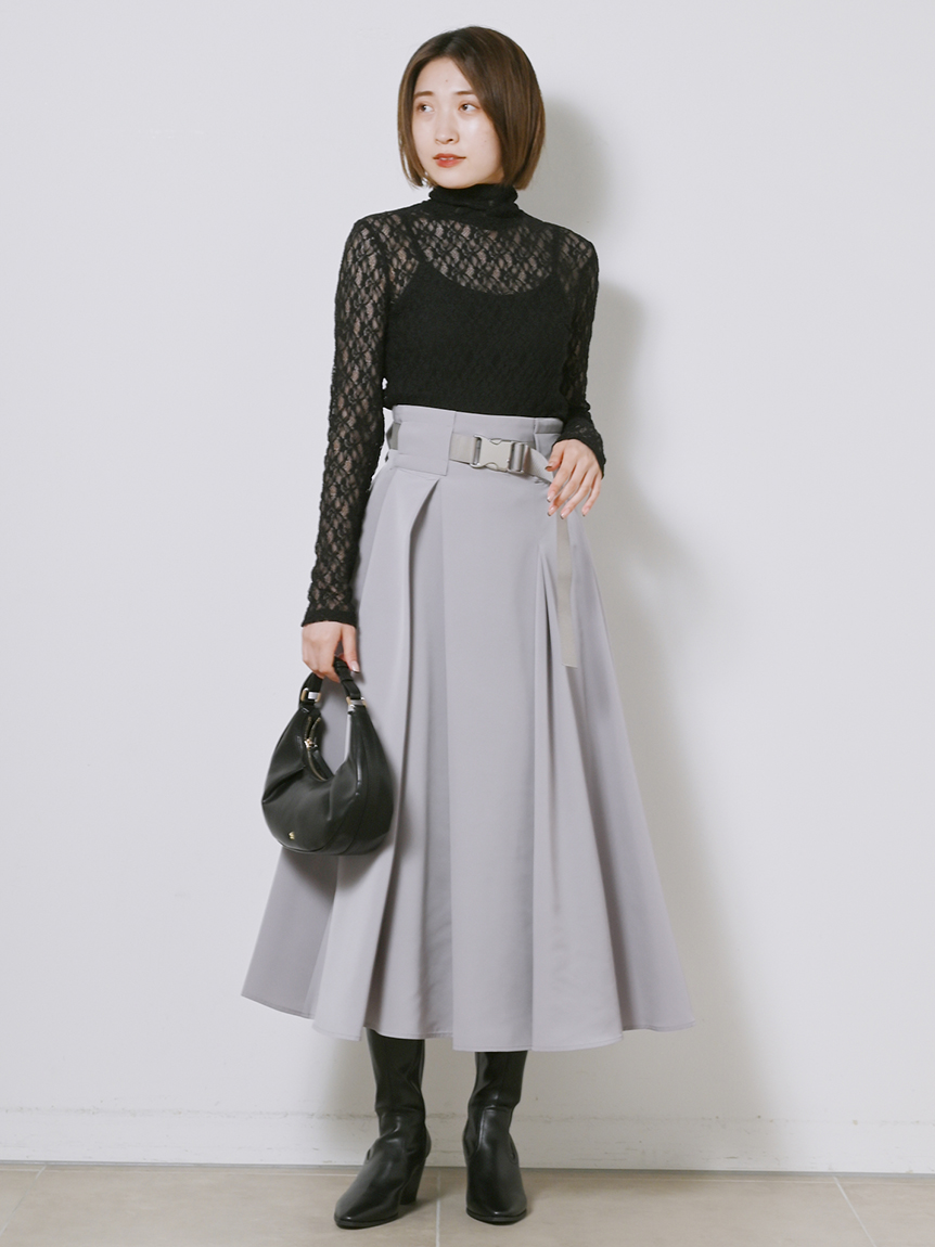 タックをふんだんに取り入れたボリュームのあるフレアシルエットが印象的な、女性らしさとモード感が絶妙に絡み合うロングスカート。ハイウエストの位置にベルトでマークすることでメリハリ感が生まれ、重さがありながらもスマートに着こなせます。ウエストデザインを活かすようトップスはインしてコンパクトにまとめるのがおすすめ。トレンドのショート丈トップスともバランス良く合わせられます。