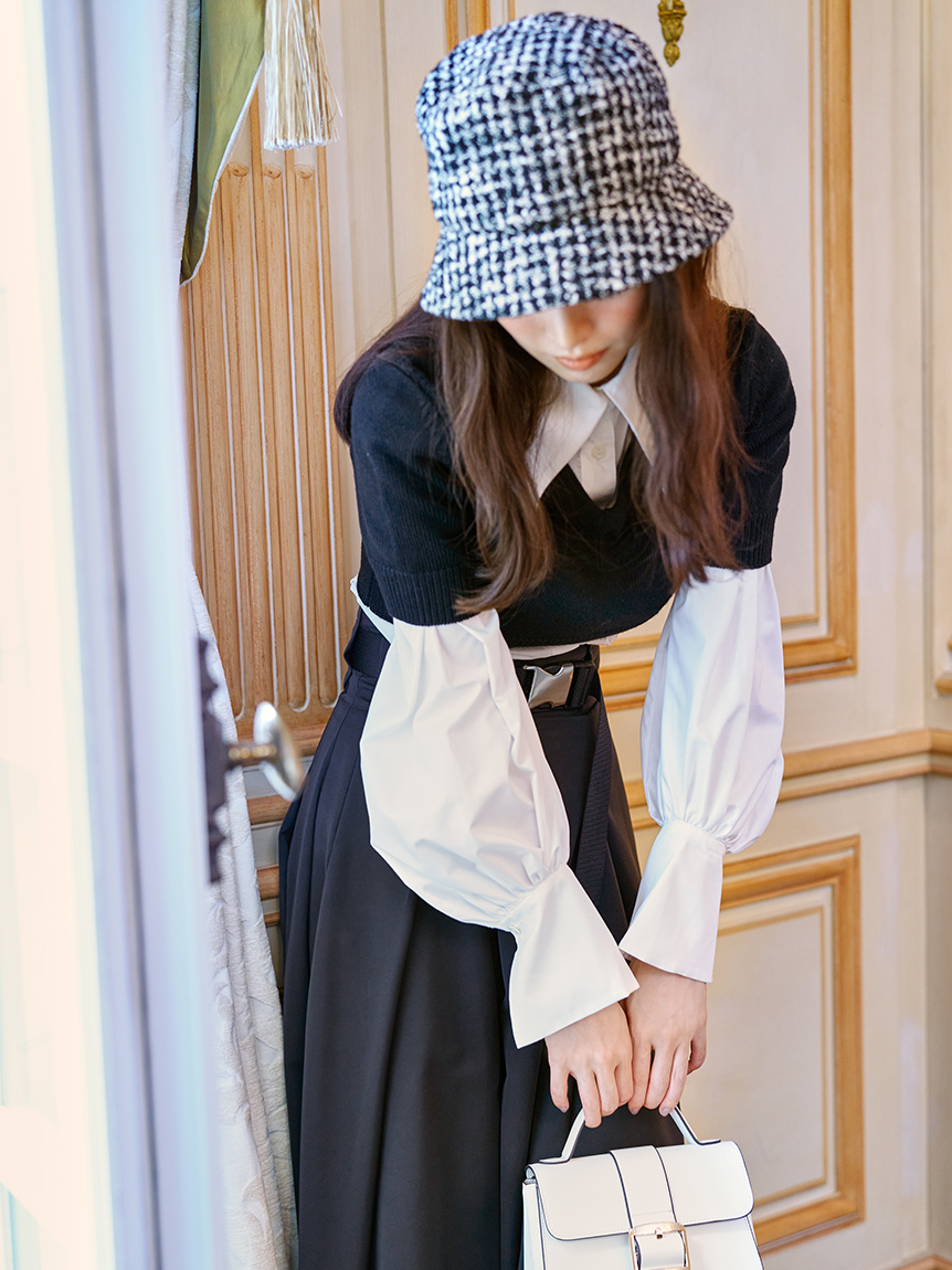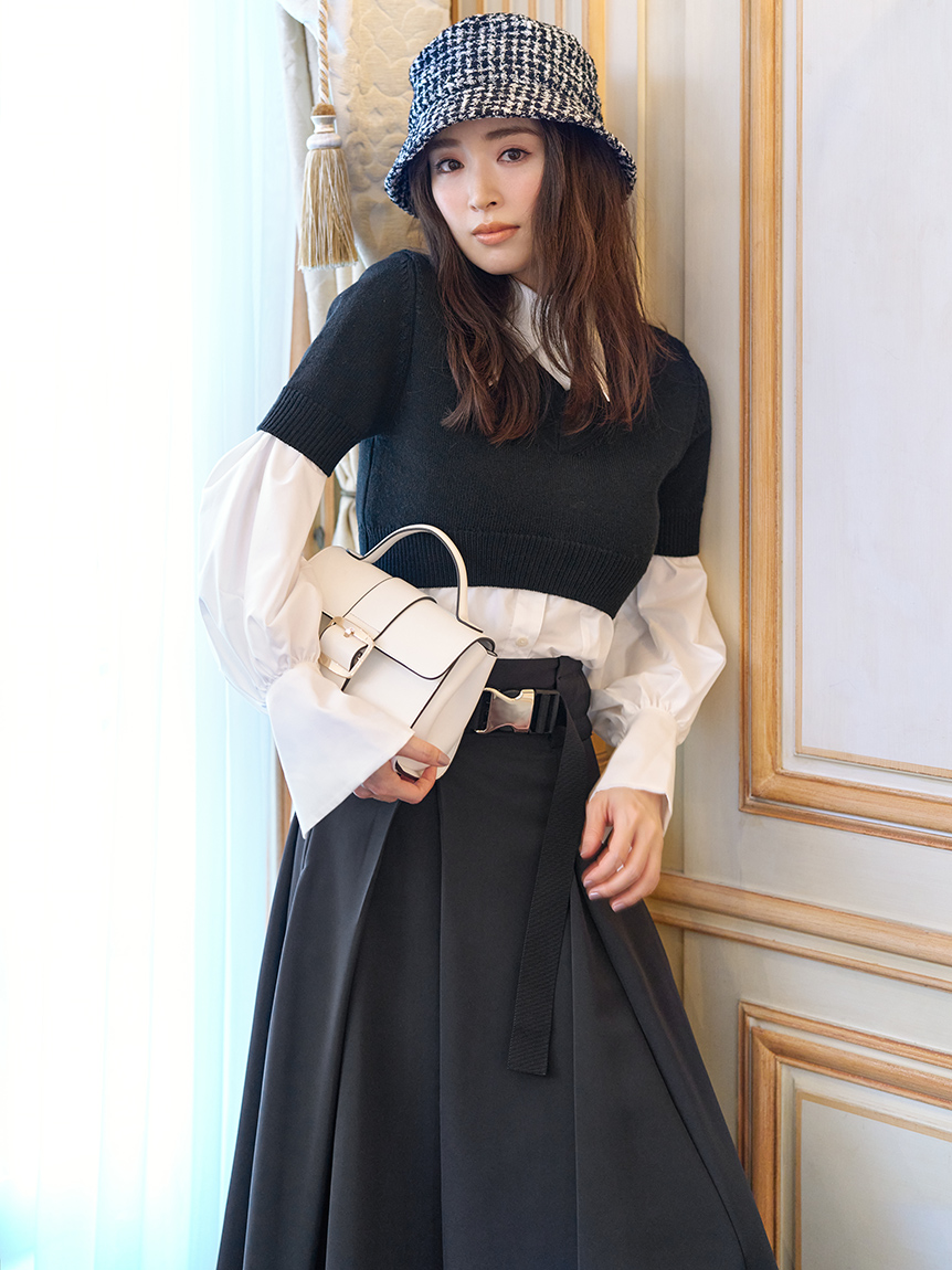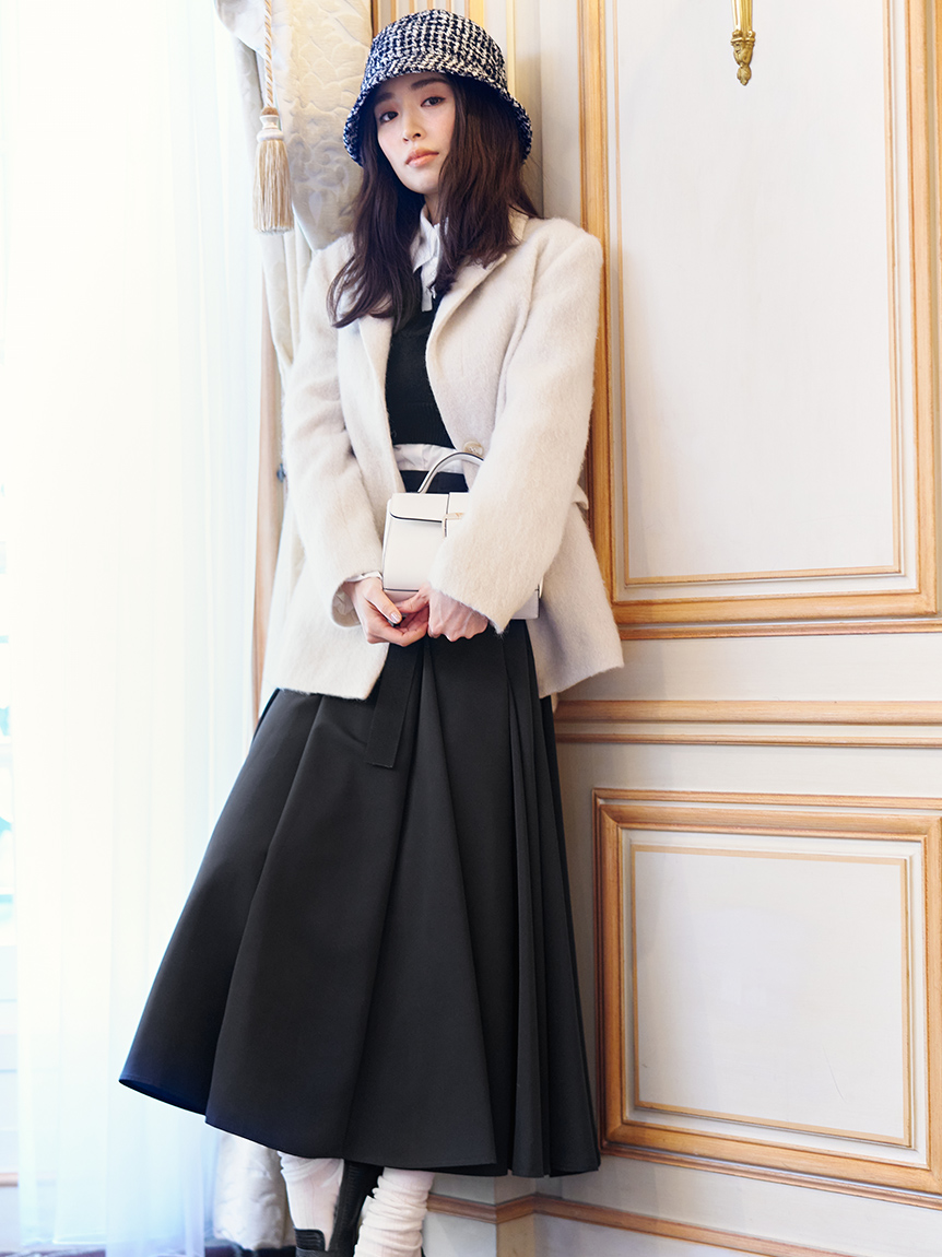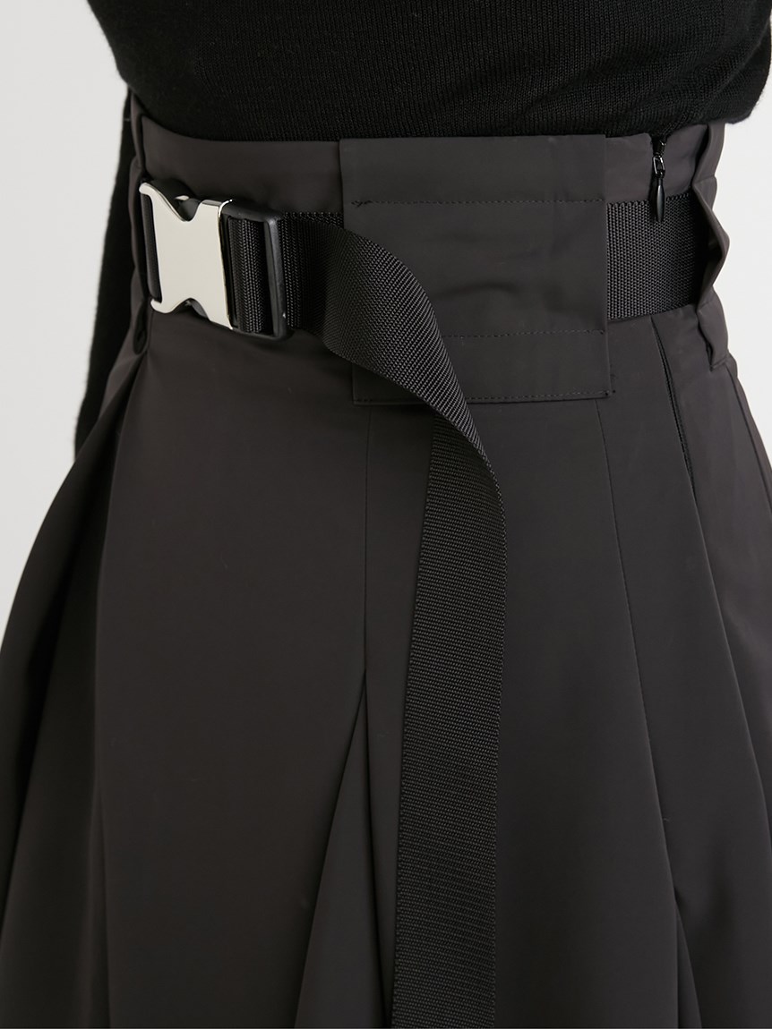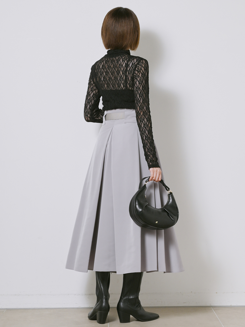 タックをふんだんに取り入れたボリュームのあるフレアシルエットが印象的な、女性らしさとモード感が絶妙に絡み合うロングスカート。ハイウエストの位置にベルトでマークすることでメリハリ感が生まれ、重さがありながらもスマートに着こなせます。ウエストデザインを活かすようトップスはインしてコンパクトにまとめるのがおすすめ。トレンドのショート丈トップスともバランス良く合わせられます。