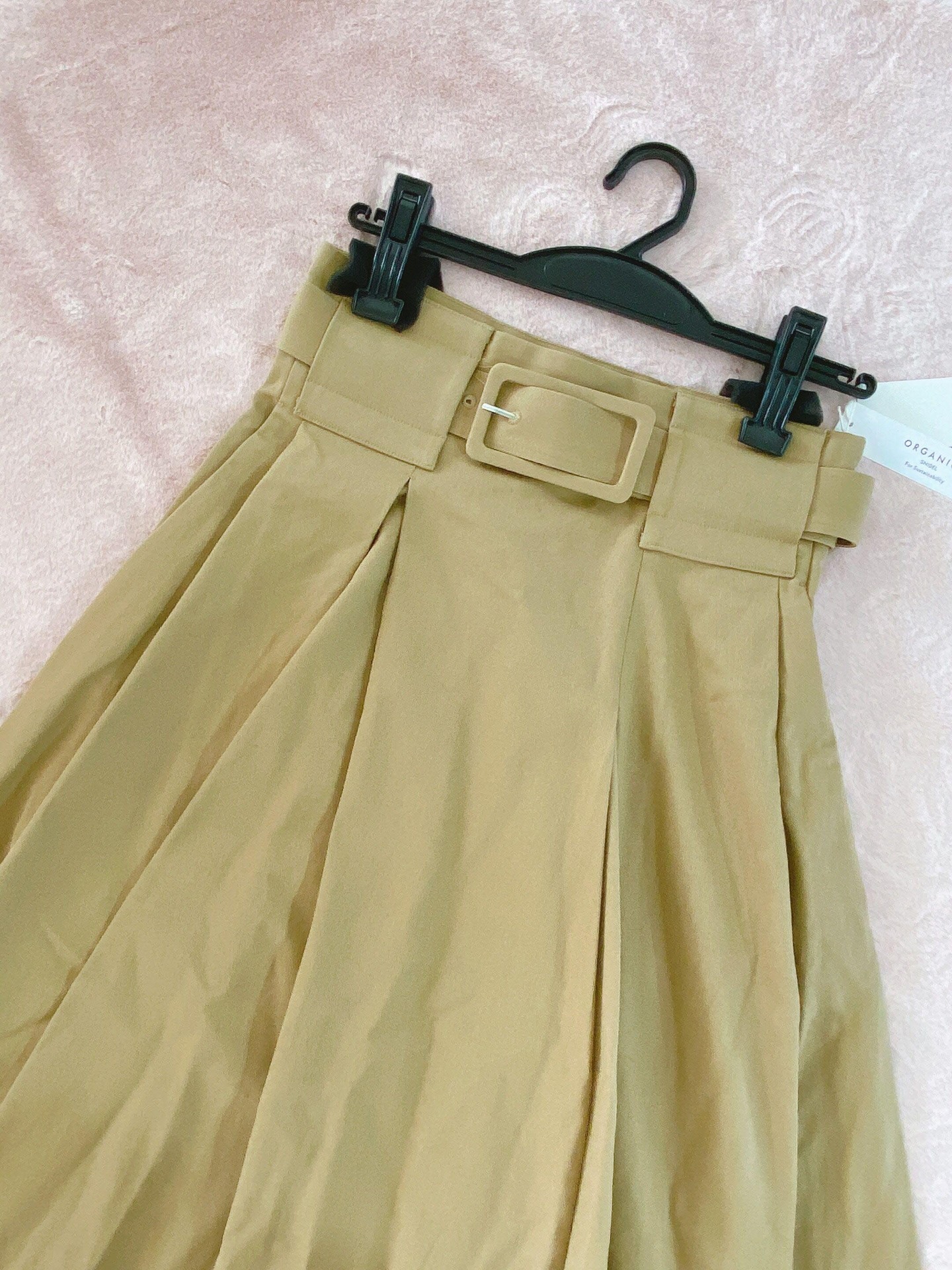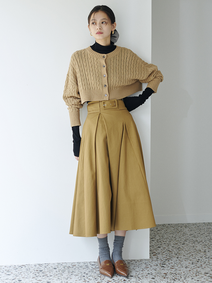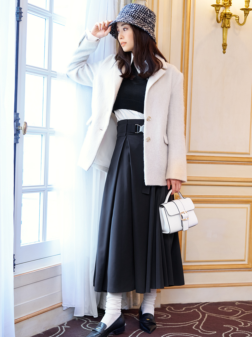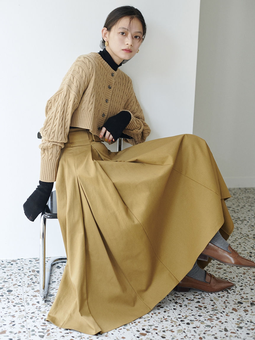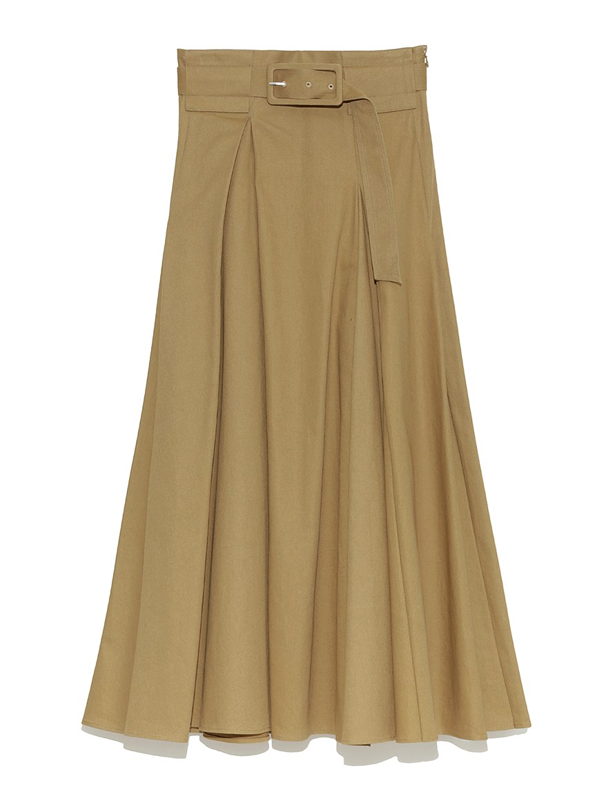 微光沢のタフタ素材のスカートにはトレンドのガチャベルトを、チノ素材のスカートには共地のくるみバックルベルトを組み合わせました。タフタにはリサイクルポリエステル素材、チノにはオーガニックコットンを使用した、サステナブルな商品です。ベーシックなブラック、深みのある色合いのグレーベージュ、秋冬ムード高まるキャメルの3色をご用意。