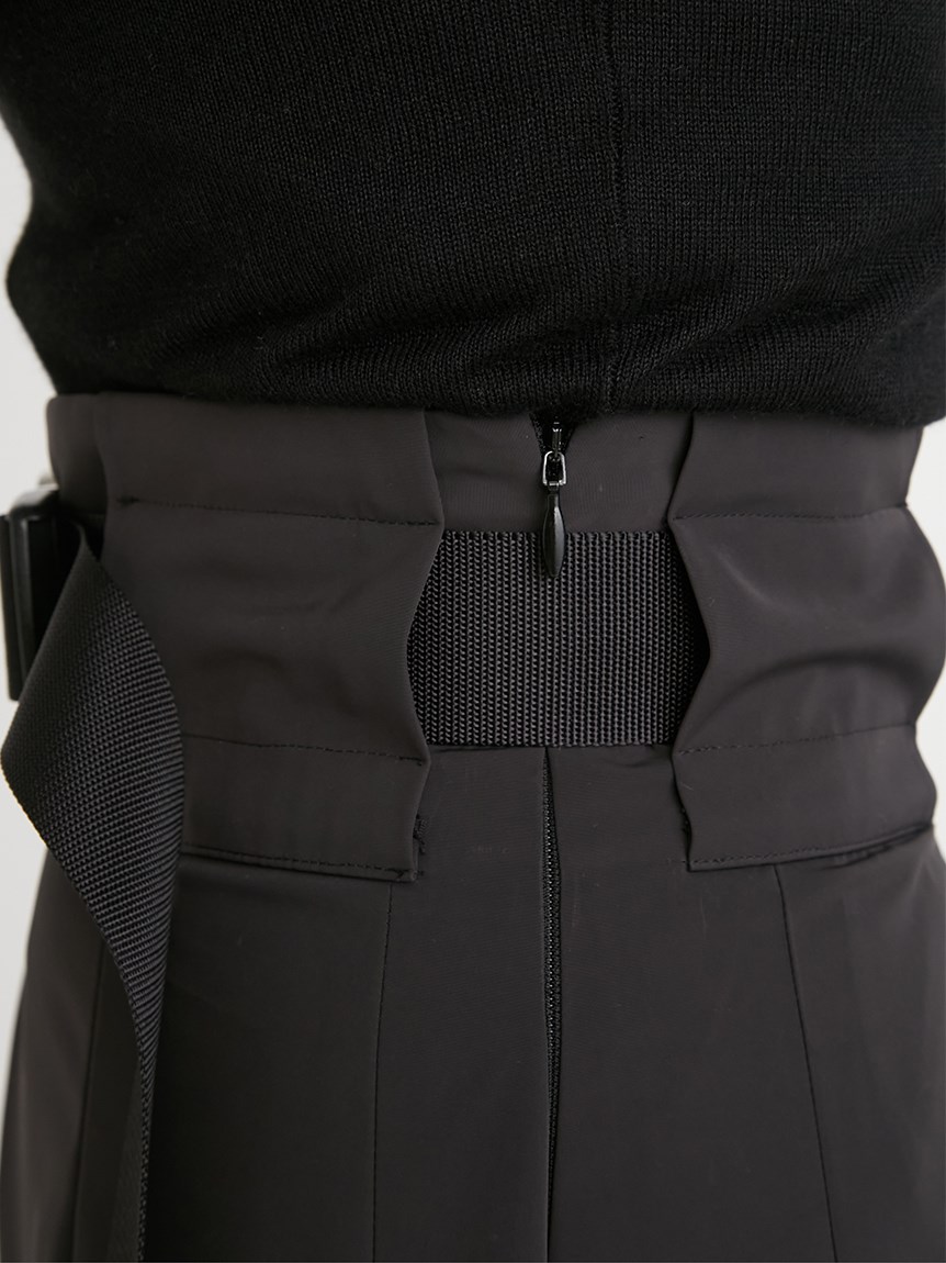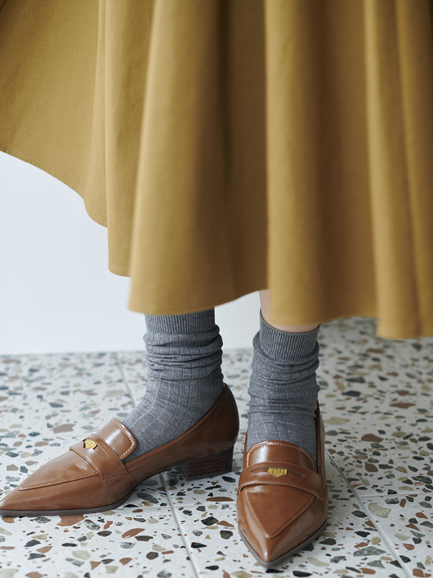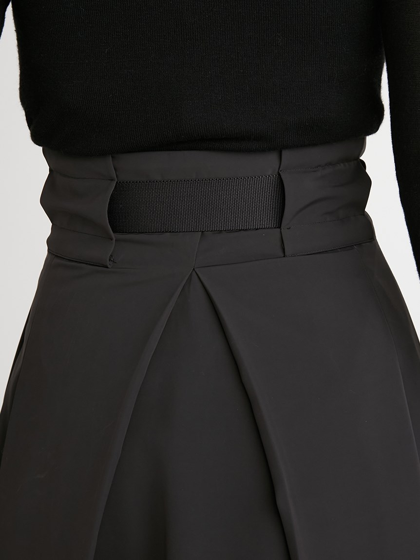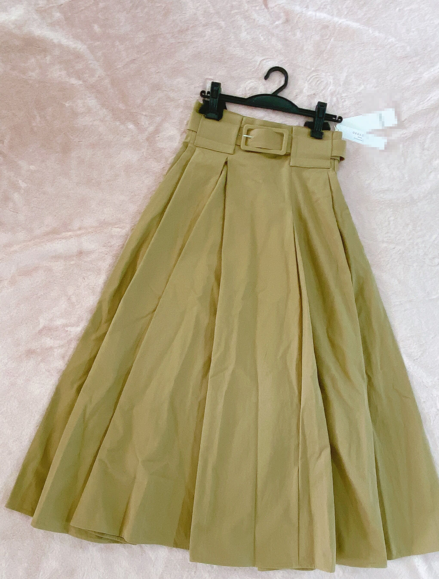 微光沢のタフタ素材のスカートにはトレンドのガチャベルトを、チノ素材のスカートには共地のくるみバックルベルトを組み合わせました。タフタにはリサイクルポリエステル素材、チノにはオーガニックコットンを使用した、サステナブルな商品です。ベーシックなブラック、深みのある色合いのグレーベージュ、秋冬ムード高まるキャメルの3色をご用意。