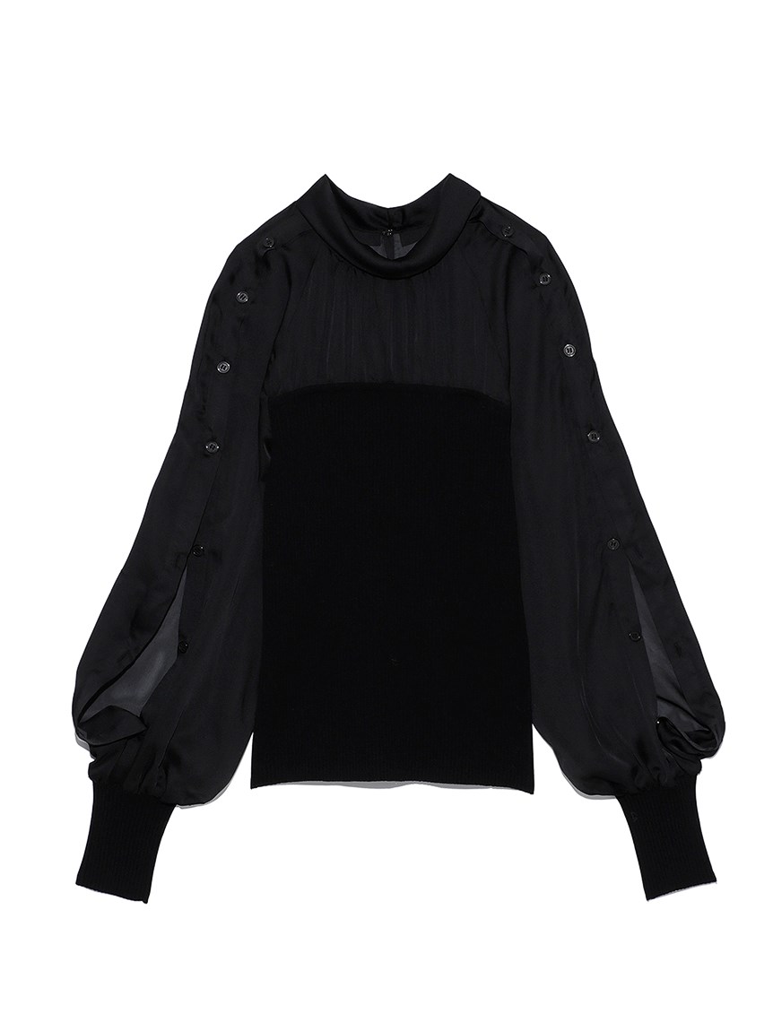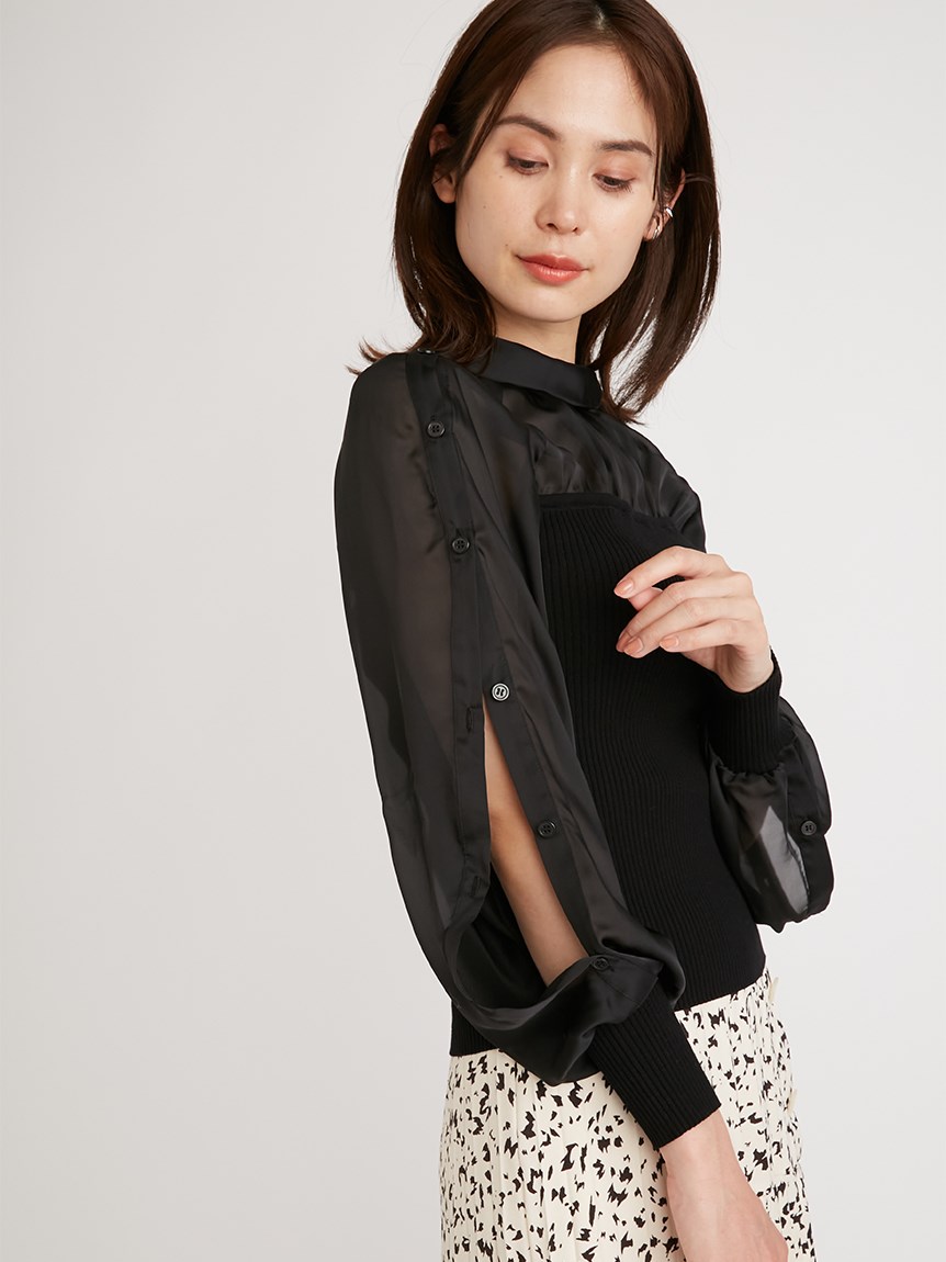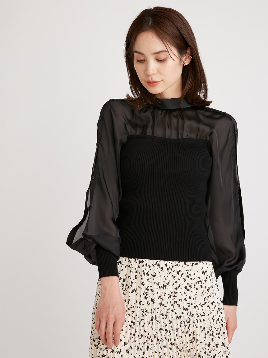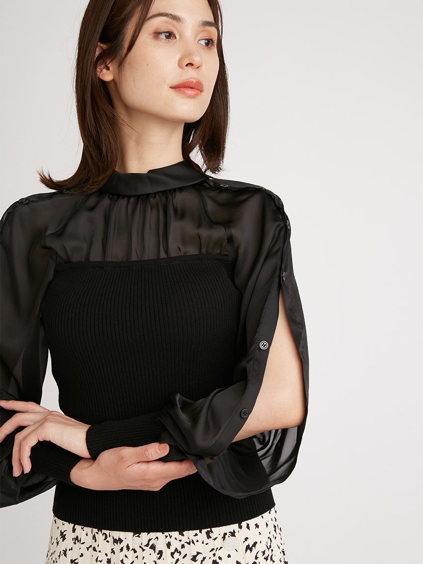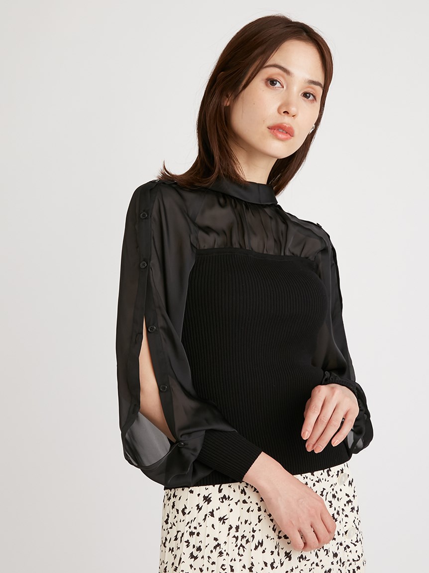 デコルテから袖にかけてシアーなシフォンで切り替えた、モードなデザインのニットトップス。袖はボタンの留め方でシルエットが変わり、センシュアルな肌見せが可能。ボディのシルエットをタイトに仕上げ、ボリュームのある袖とのメリハリバランスを考慮しています。身頃はリブニットを使用しているのでフィットしながらも楽な着心地です。