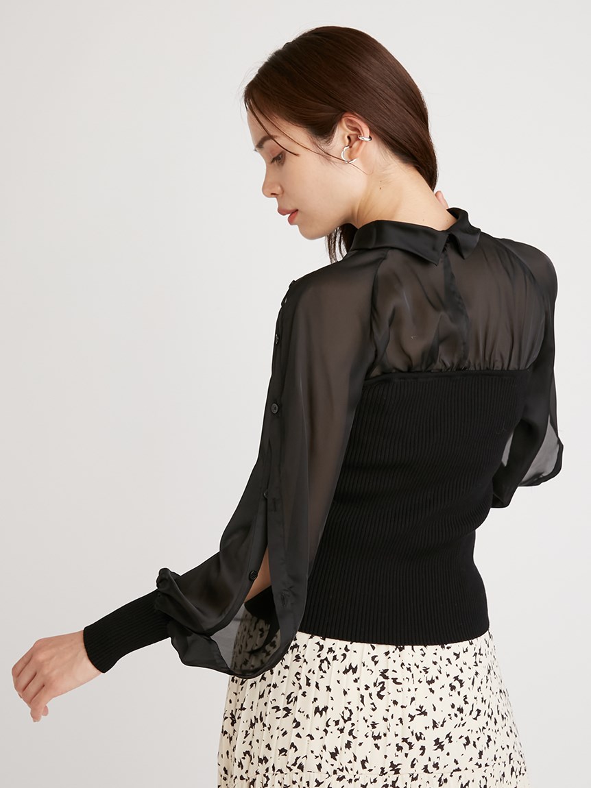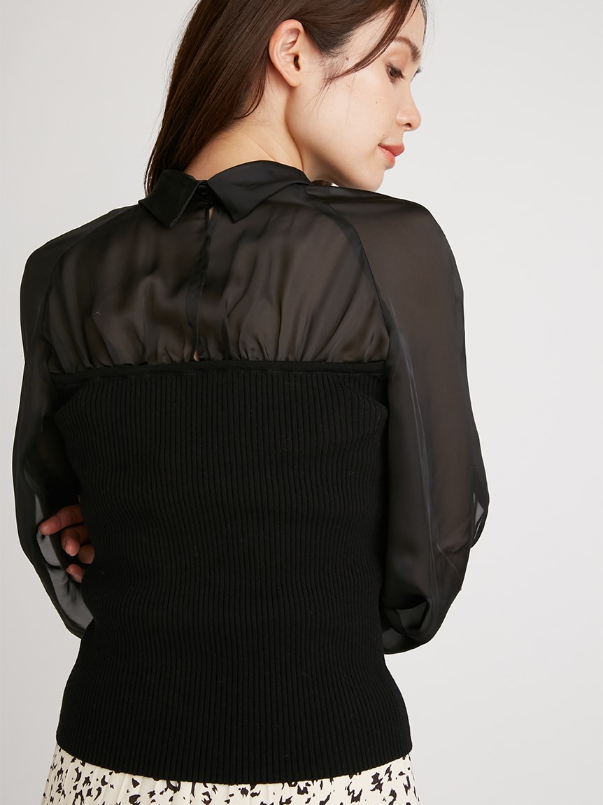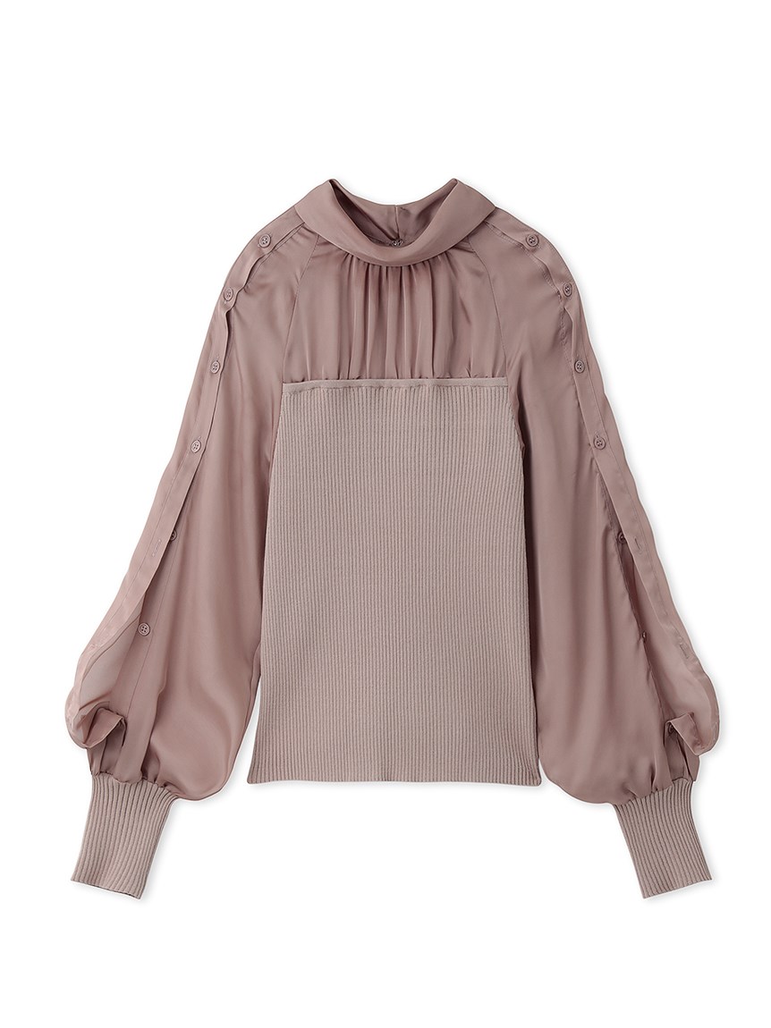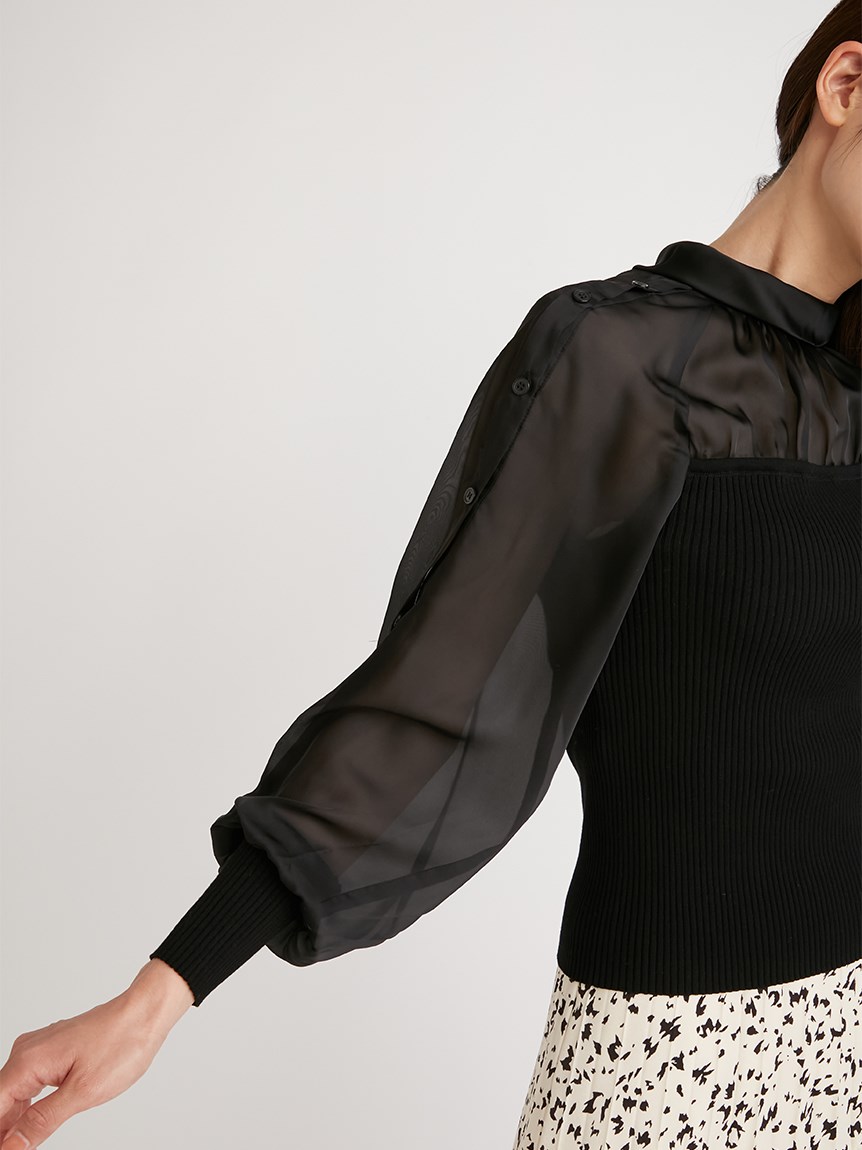 デコルテから袖にかけてシアーなシフォンで切り替えた、モードなデザインのニットトップス。袖はボタンの留め方でシルエットが変わり、センシュアルな肌見せが可能。ボディのシルエットをタイトに仕上げ、ボリュームのある袖とのメリハリバランスを考慮しています。身頃はリブニットを使用しているのでフィットしながらも楽な着心地です。