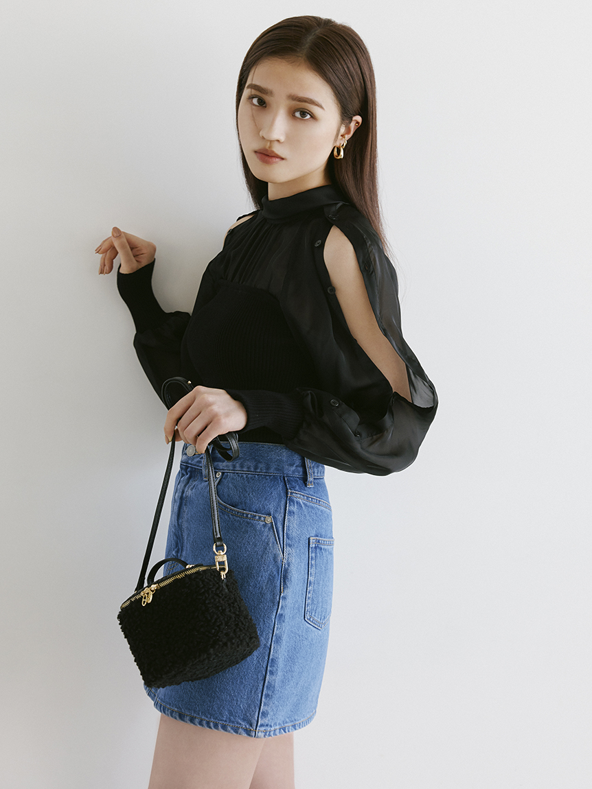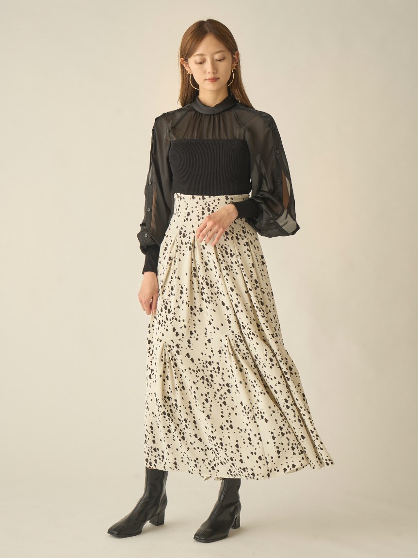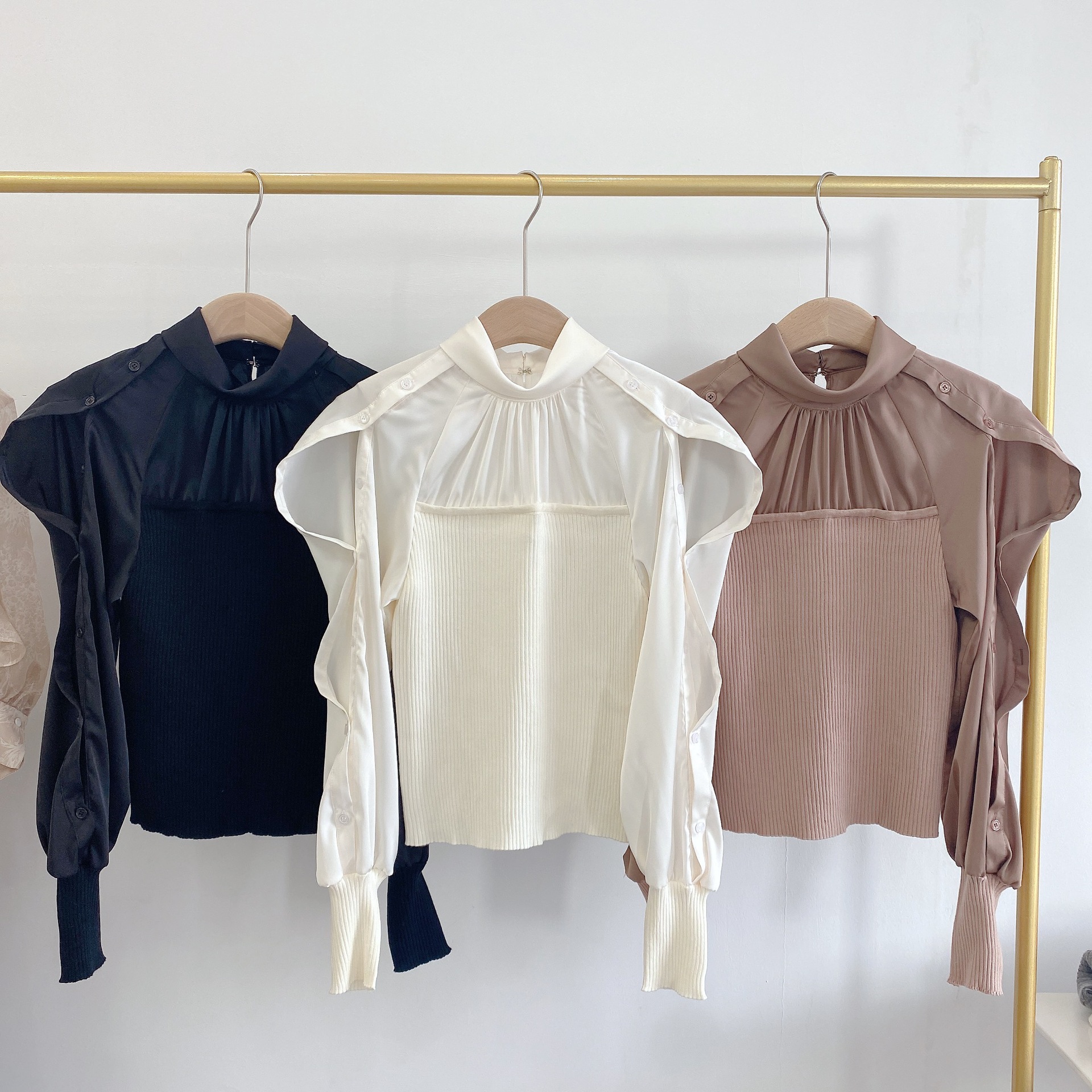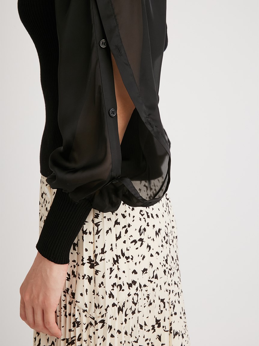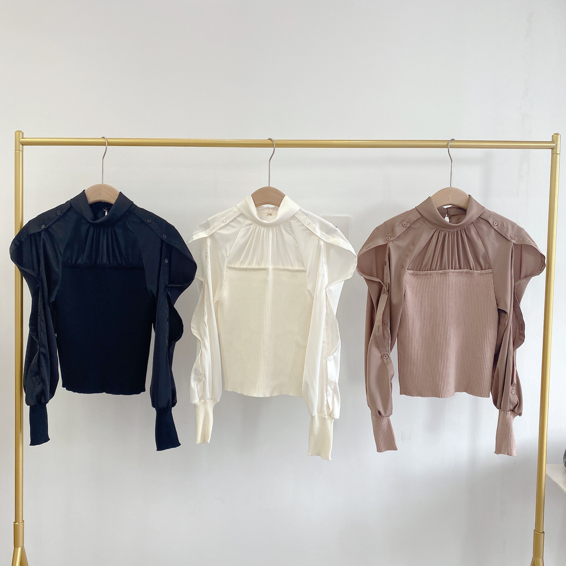 デコルテから袖にかけてシアーなシフォンで切り替えた、モードなデザインのニットトップス。袖はボタンの留め方でシルエットが変わり、センシュアルな肌見せが可能。ボディのシルエットをタイトに仕上げ、ボリュームのある袖とのメリハリバランスを考慮しています。身頃はリブニットを使用しているのでフィットしながらも楽な着心地です。