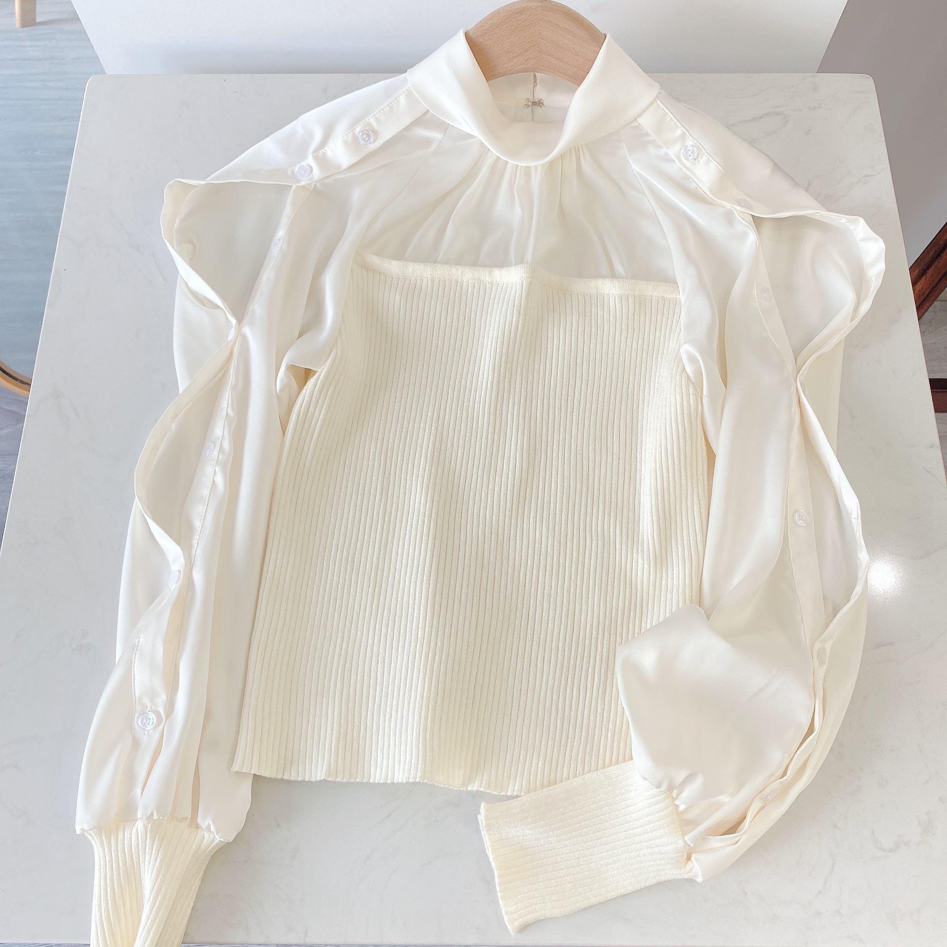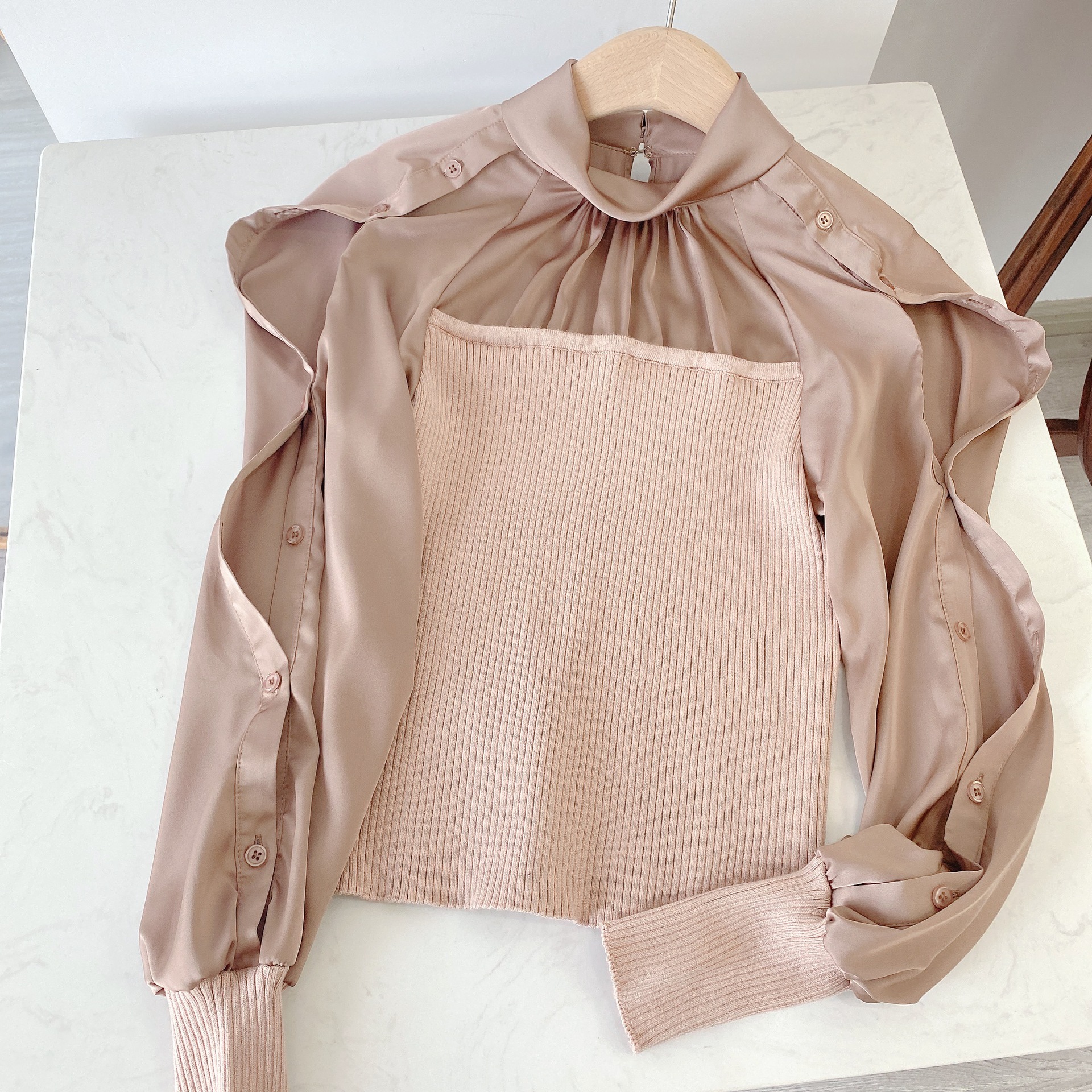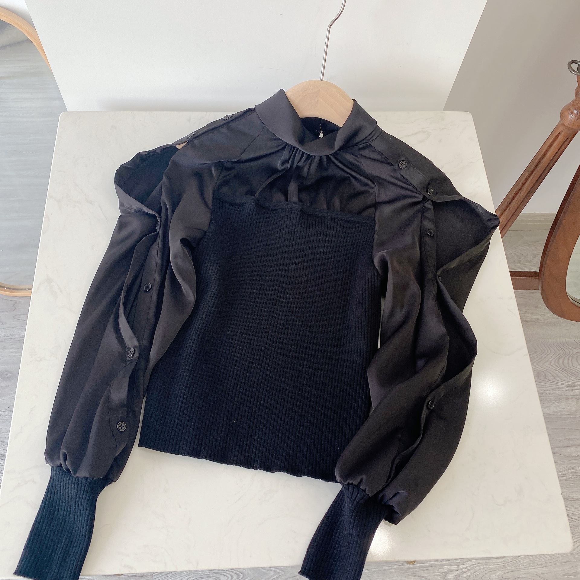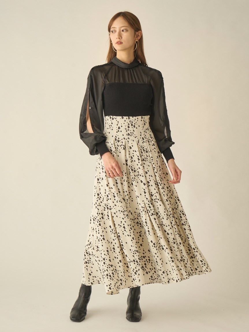 デコルテから袖にかけてシアーなシフォンで切り替えた、モードなデザインのニットトップス。袖はボタンの留め方でシルエットが変わり、センシュアルな肌見せが可能。ボディのシルエットをタイトに仕上げ、ボリュームのある袖とのメリハリバランスを考慮しています。身頃はリブニットを使用しているのでフィットしながらも楽な着心地です。