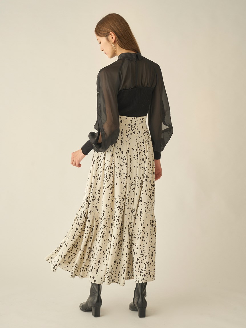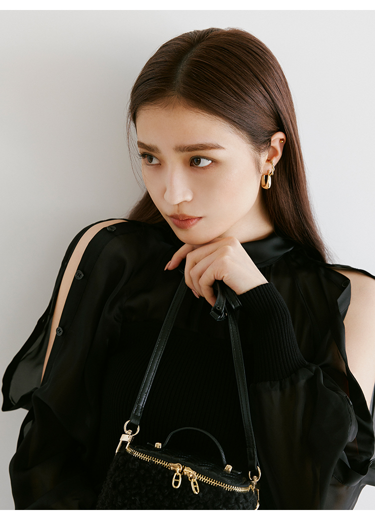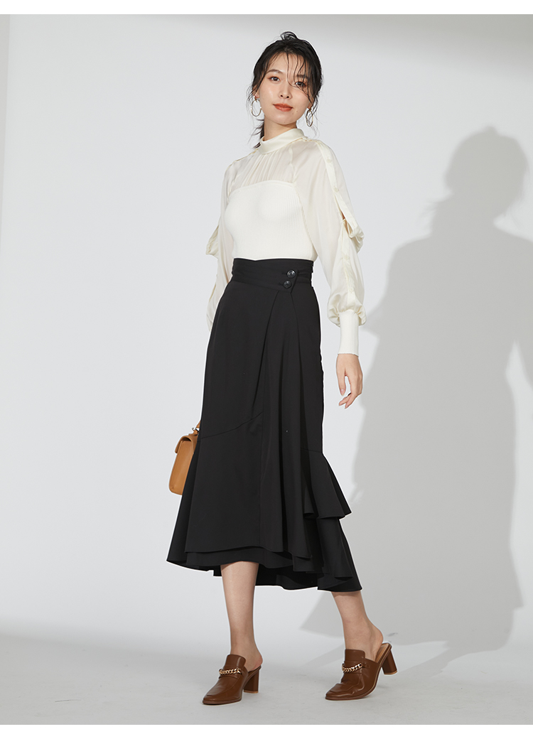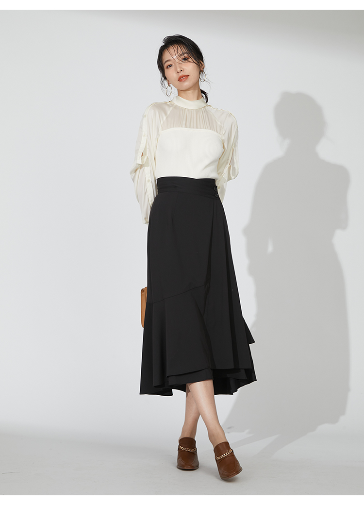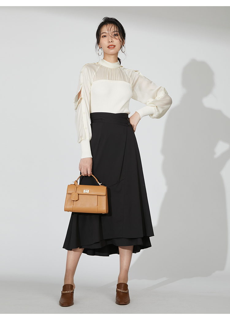 シアーなシフォンと伸縮性のあるリブニットを組み合わせました。アイボリー、ブラック、ピンクベージュの着まわしやすいカラー展開でお届けします。