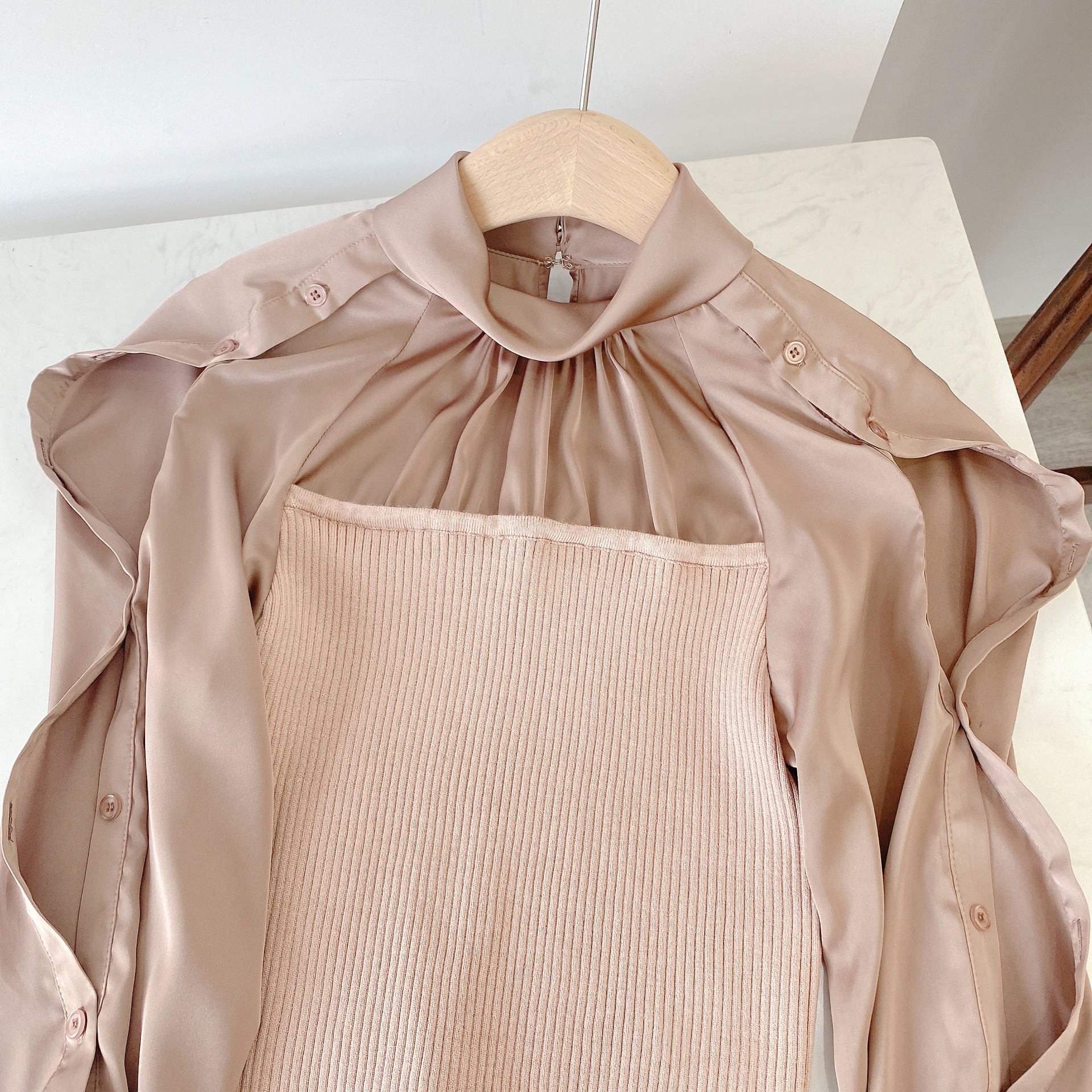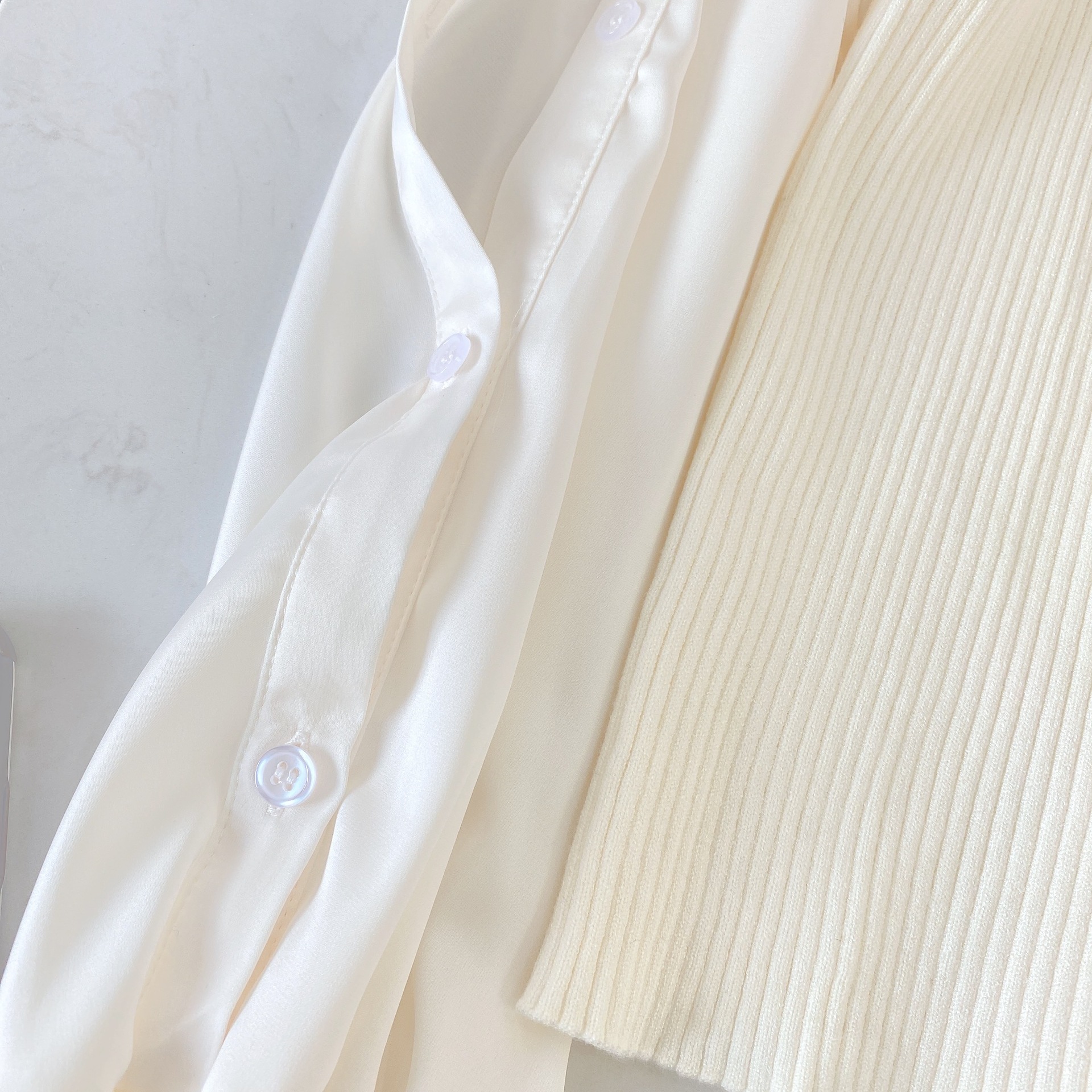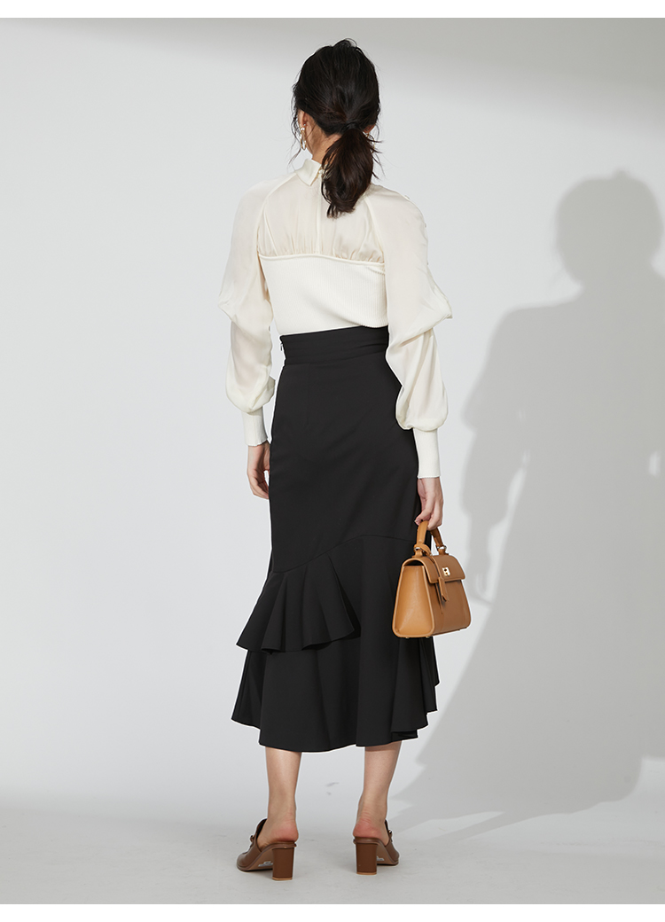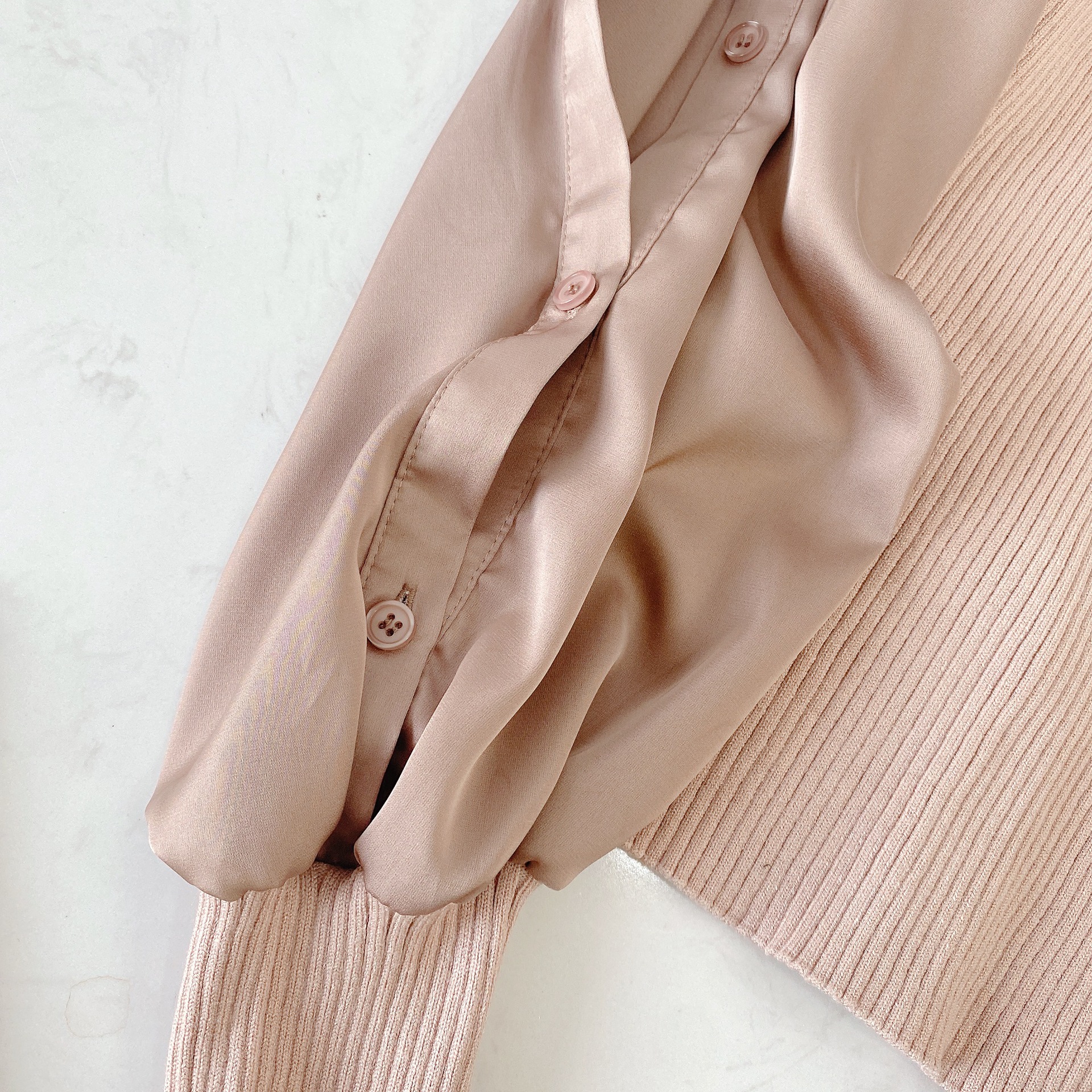 シアーなシフォンと伸縮性のあるリブニットを組み合わせました。アイボリー、ブラック、ピンクベージュの着まわしやすいカラー展開でお届けします。
