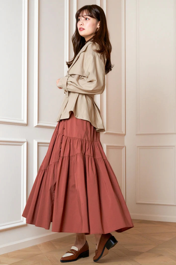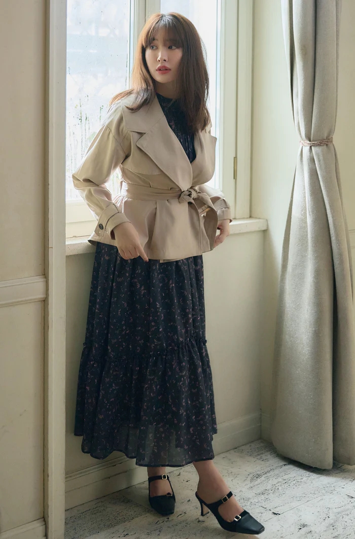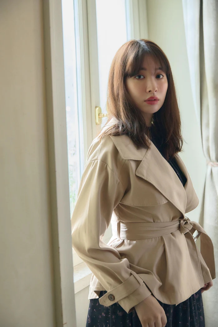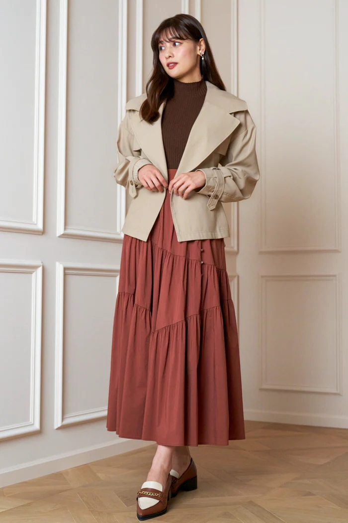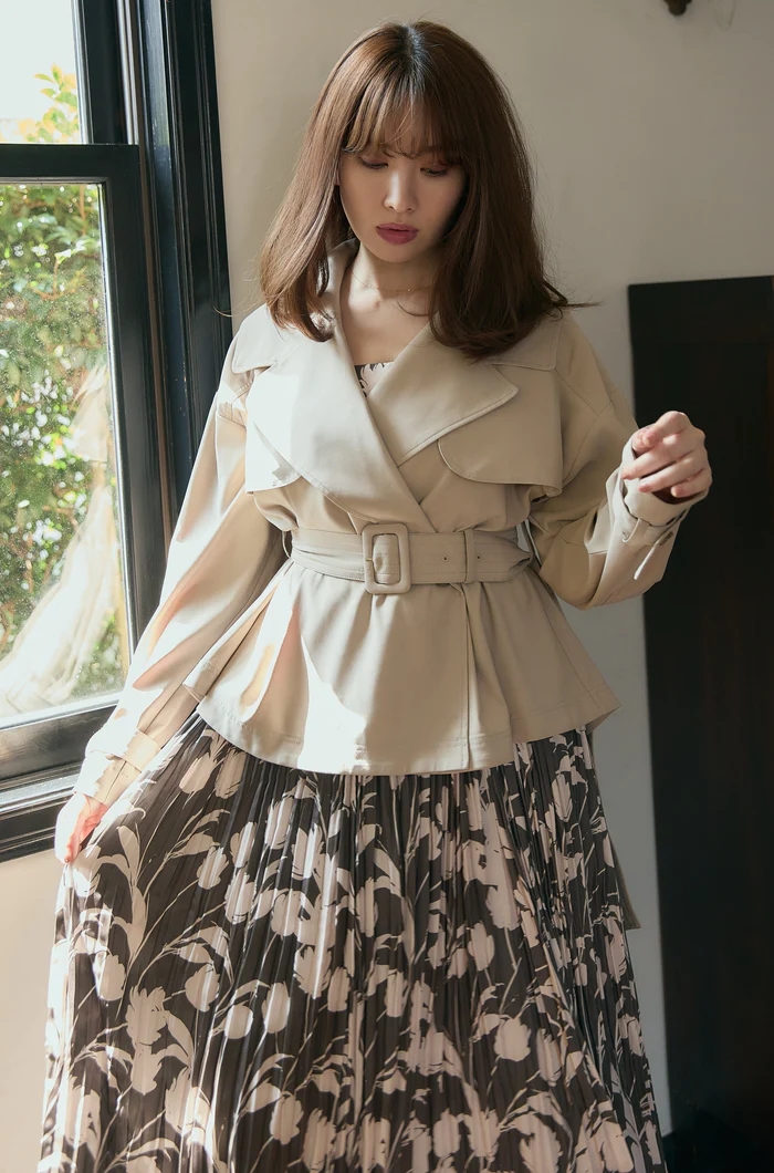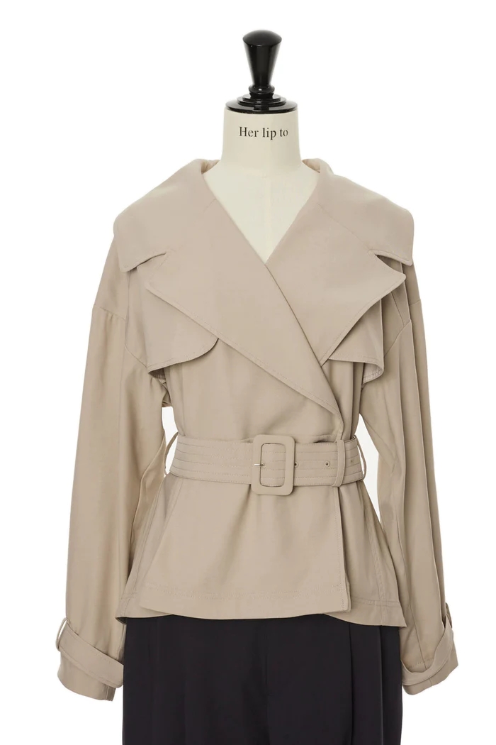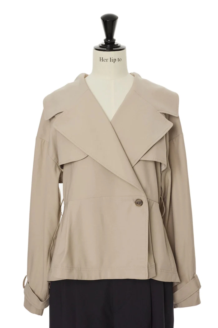 大人の女性の魅力を引き出す上品な印象のシルキーショートトレンチ。