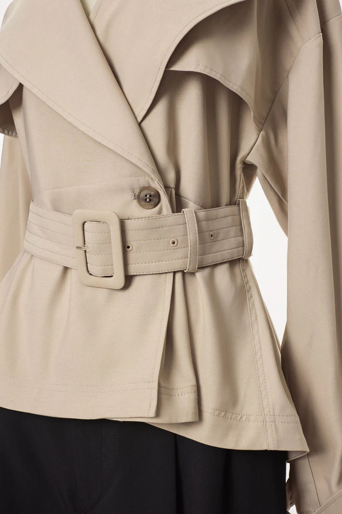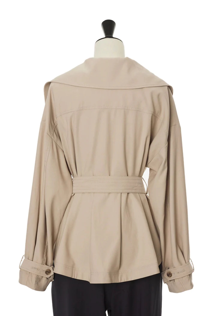 どんなコーディネートもワンランクアップした上品なスタイリングに魅せてくれる、名品のショートトレンチが出来上がりました。