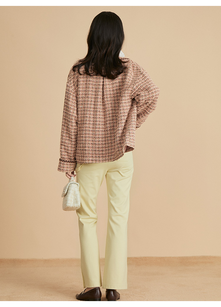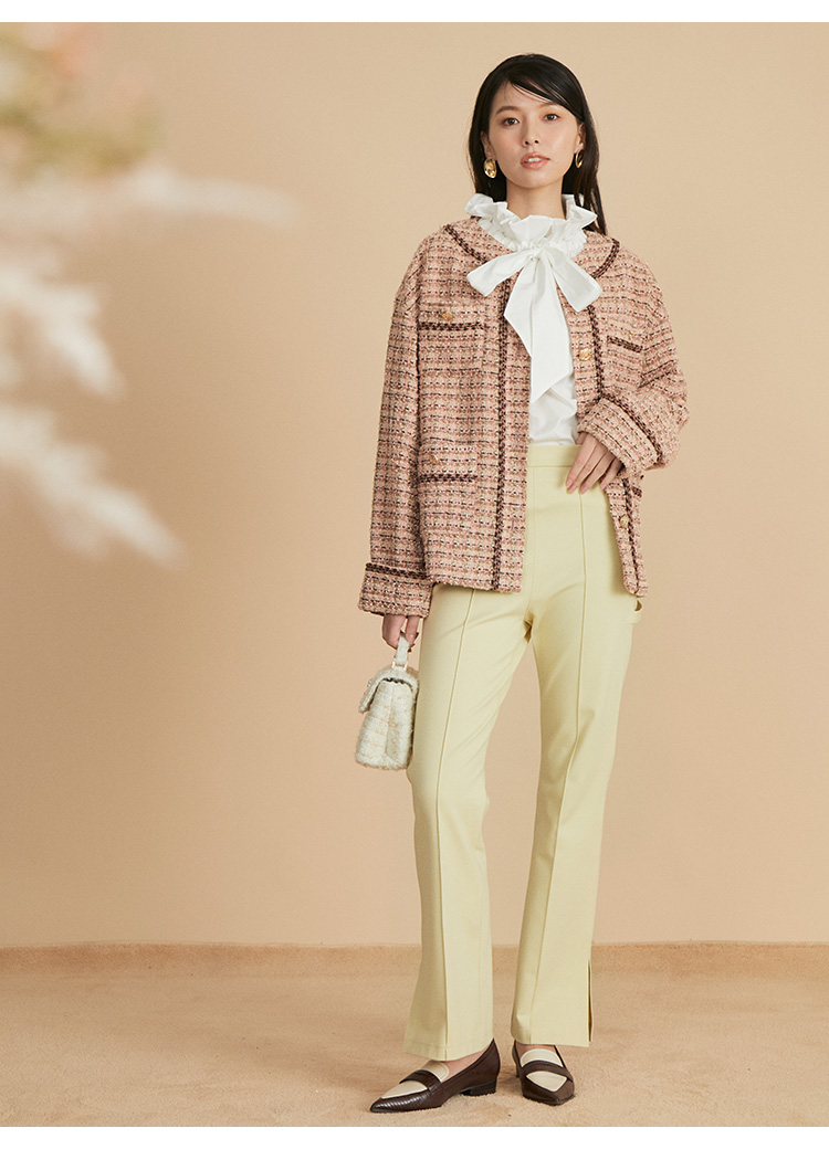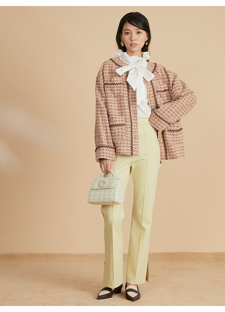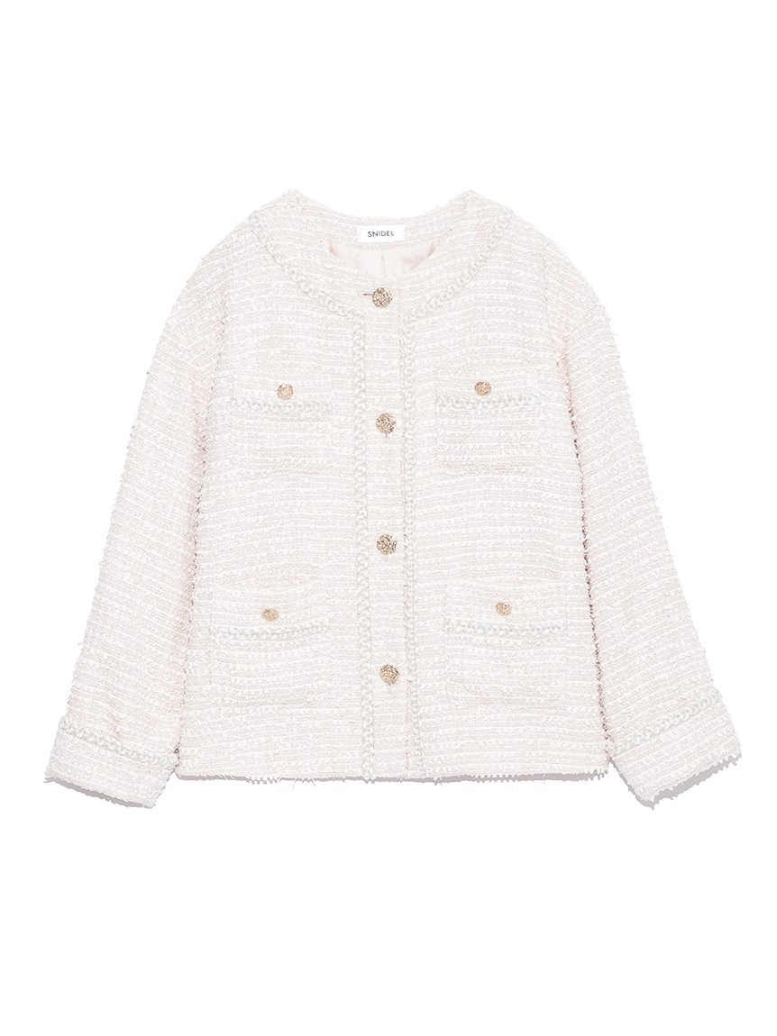 クラシカルなツイード素材で仕立てた、品の良さを感じさせるノーカラージャケット。ドロップショルダーのオーバーサイズシルエットで、気負いなくカジュアルに着られる1着です。全体に施されたブレードの装飾が表情を引き締めるアクセントに。パンツともスカートとも合わせやすく、同素材を用いたミニスカート(SWFS224186)とセットアップでもスタイリング可能です。