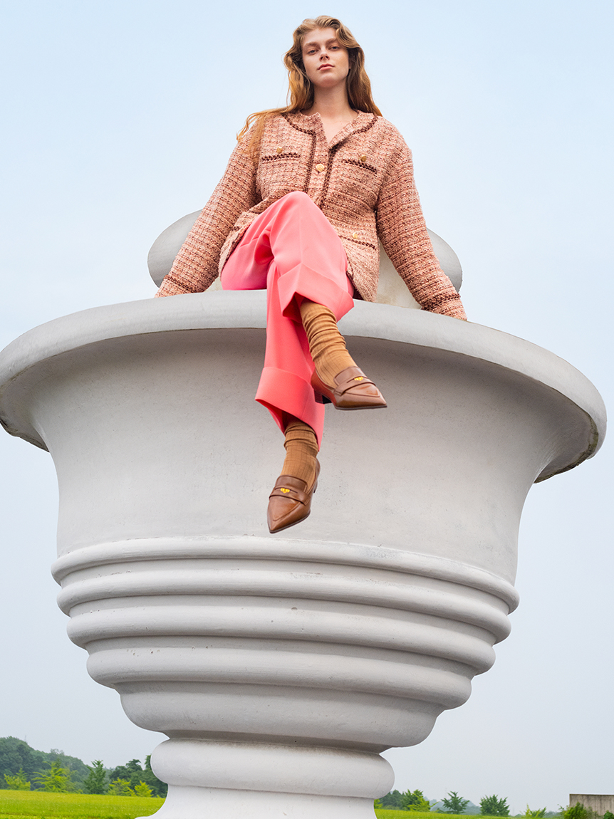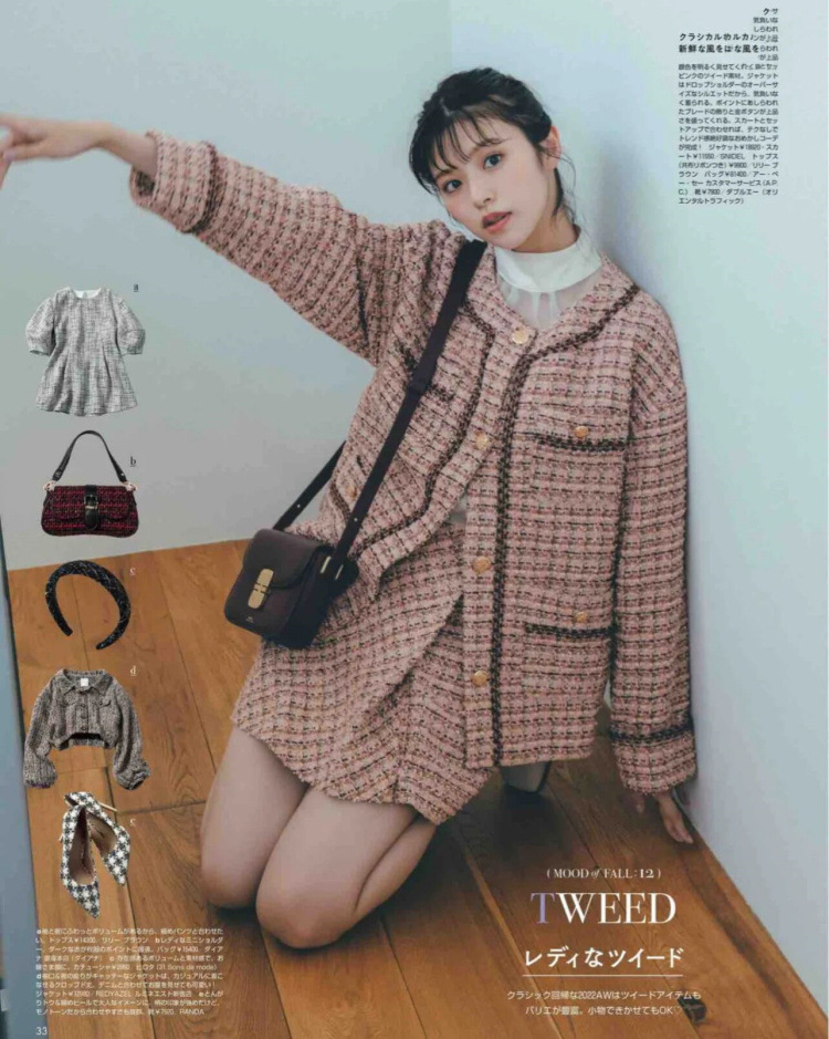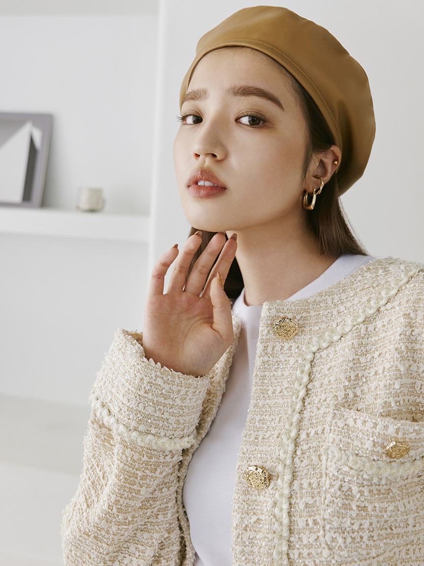 凸凹とした表面感のあるツイード素材を使用。ボーダー見えのワントーンカラーで仕上げたアイボリー、黒と白をミックスさせたブラック、柔らかいピンクベースにダークブラウンを締め色に効かせたコーラルピンクの3色をご用意しました。