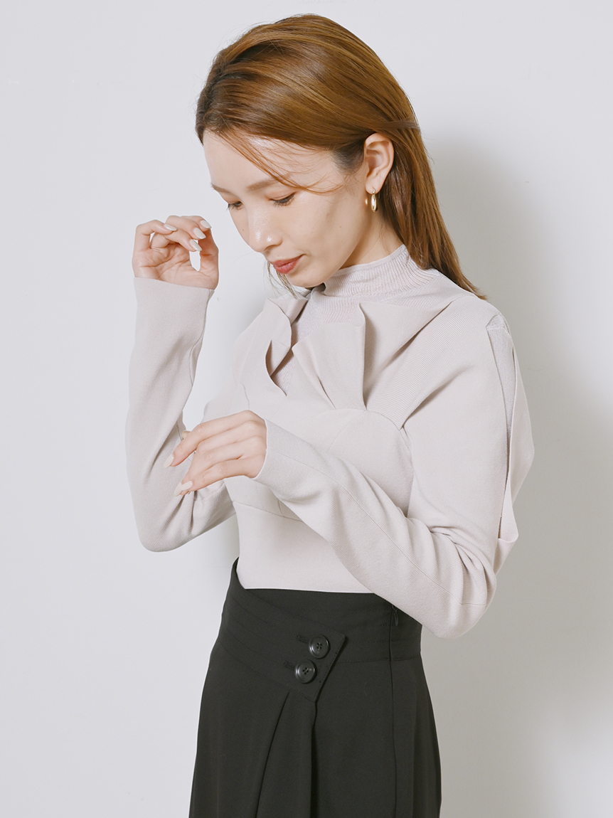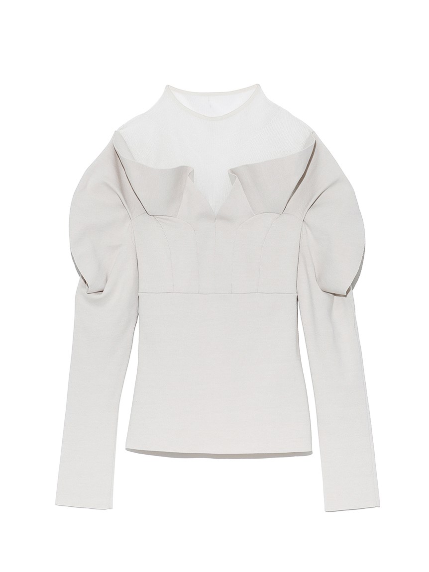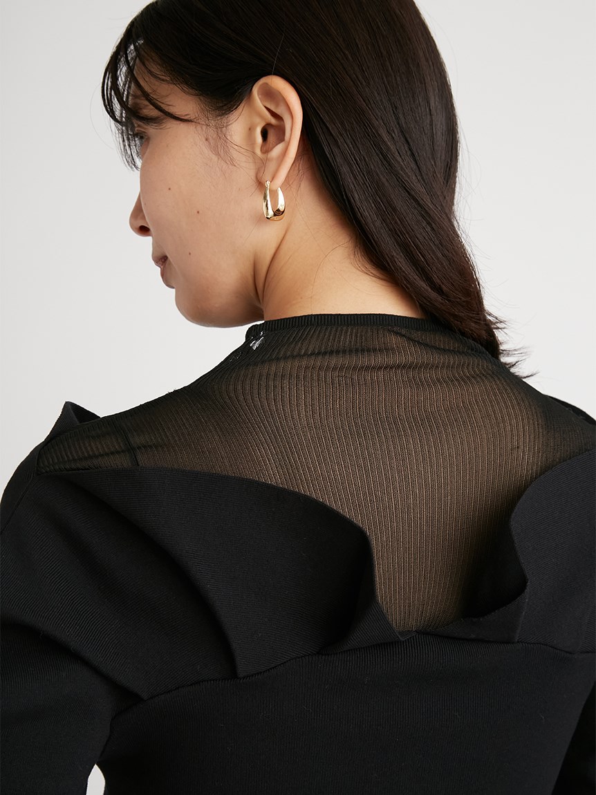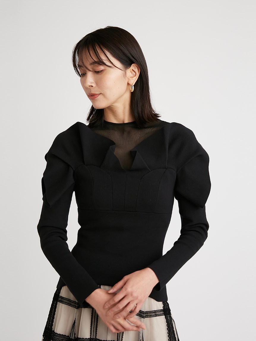 透け感のあるセンシュアルなデコルテとコルセットライクな身頃との絶妙なバランス感が魅力。「SNIDEL」定番のデコルテシースルーニットをモードに昇華させたこだわりの1着が届きました。前後に彩られたボリューミーなフリルでぐっと華やかな雰囲気に。オフショルにアレンジすることも可能なので、着こなしを自由に楽しめます。