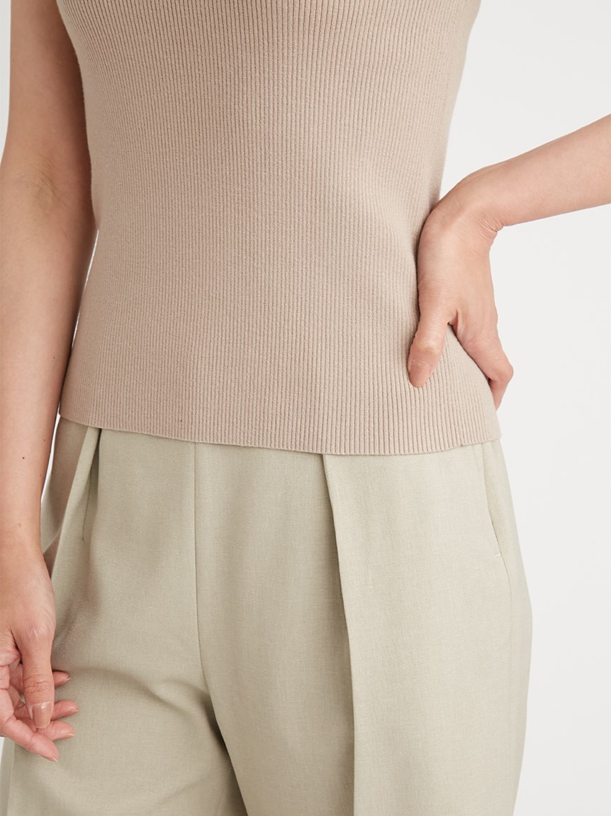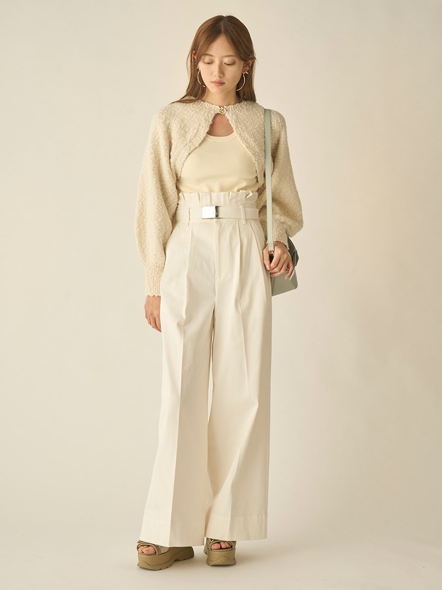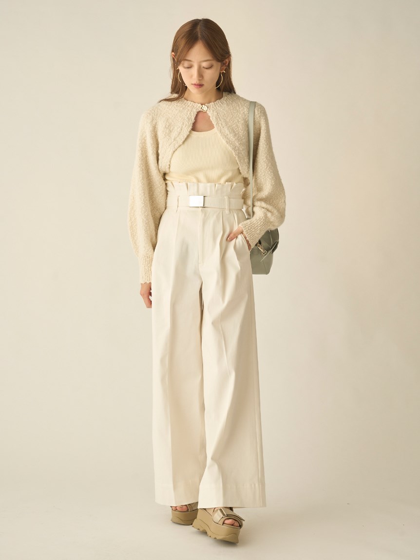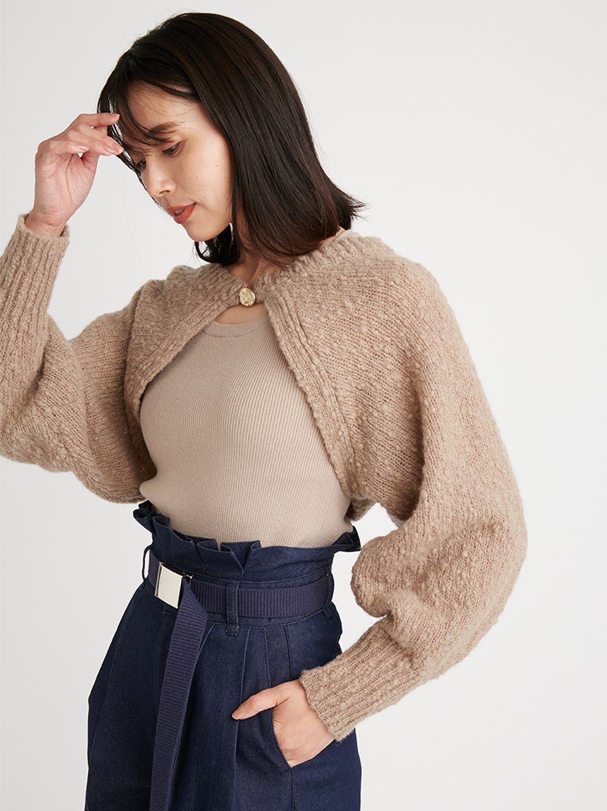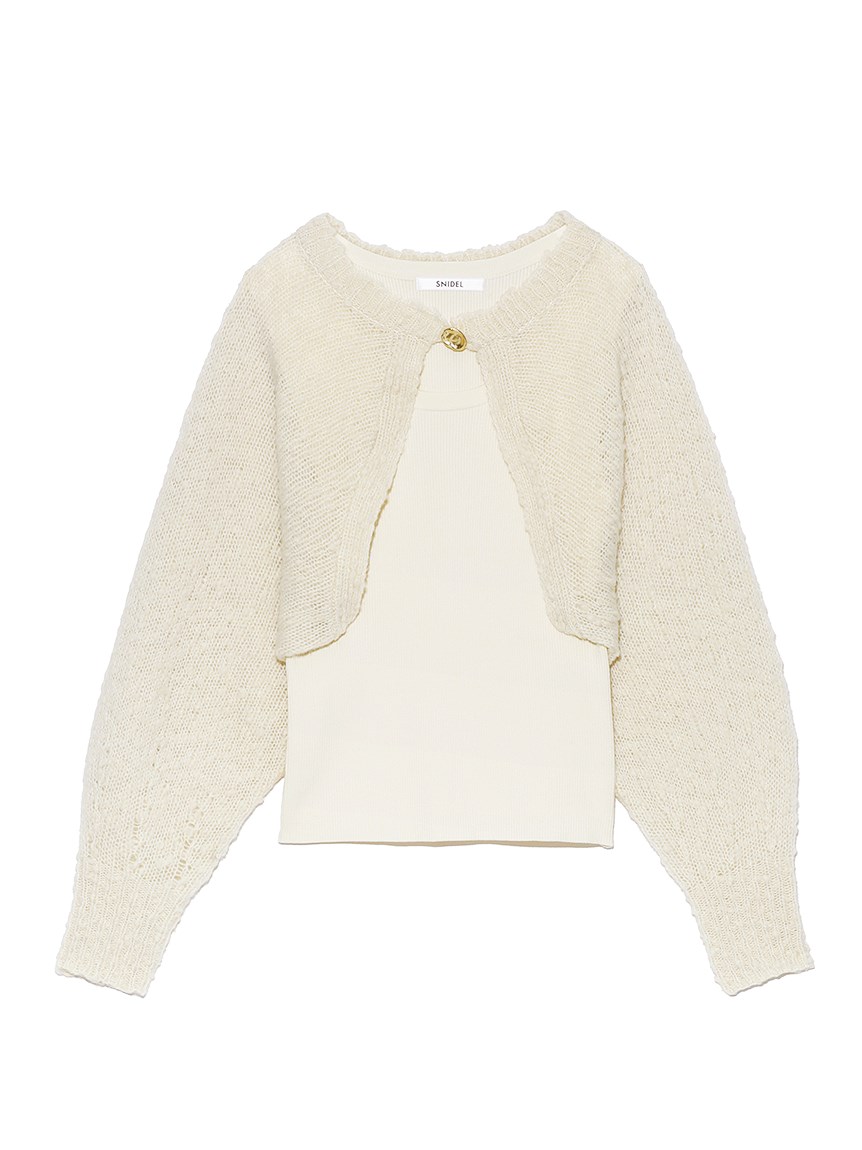 ボレロはイタリア糸を用いた編地に表情のあるニット素材を使用、タンクは伸縮性のあるリブニットを使用しました。ホワイト、ベージュ、ダークブラウンの着まわしやすいカラー展開でお届けします。