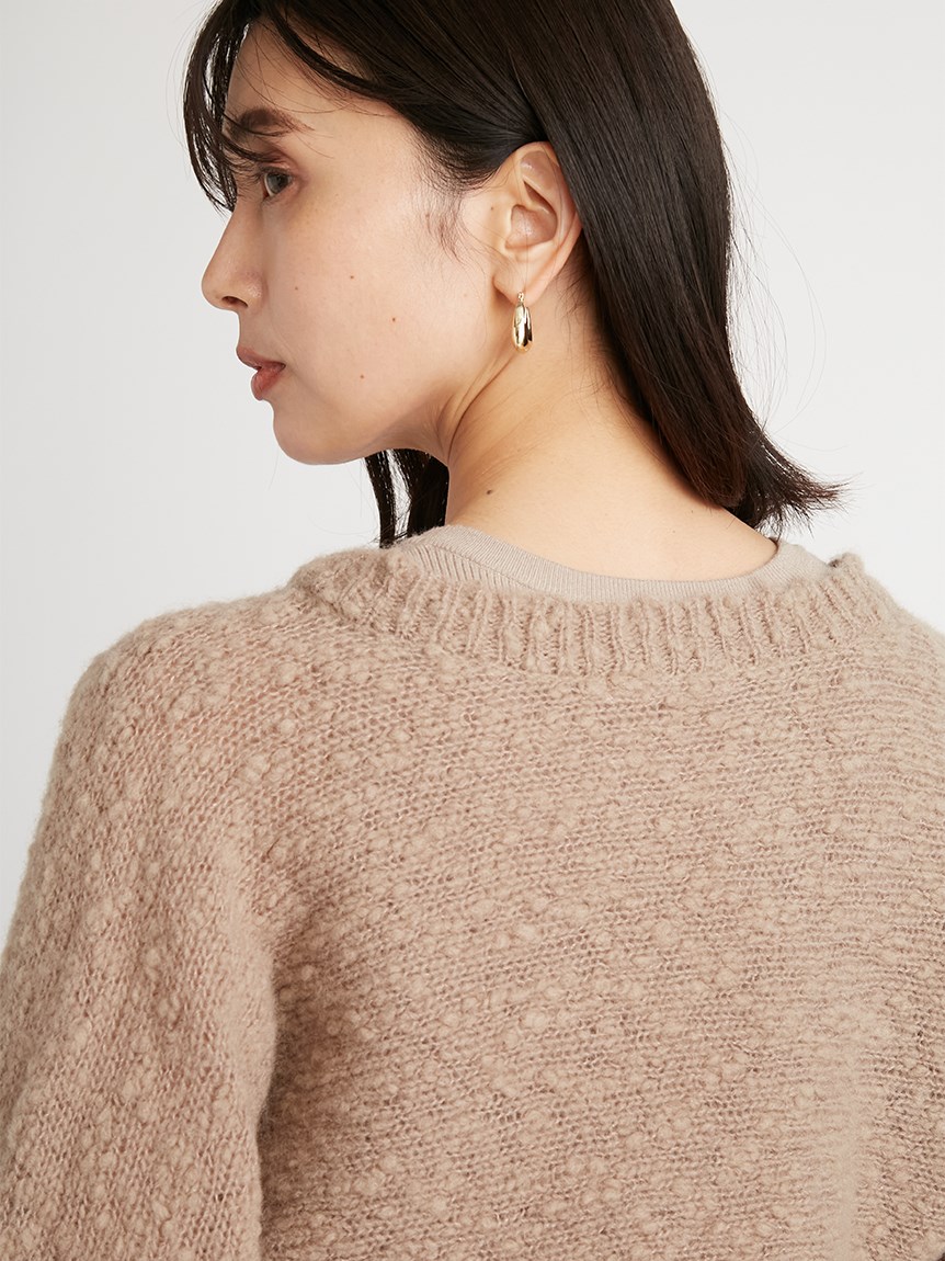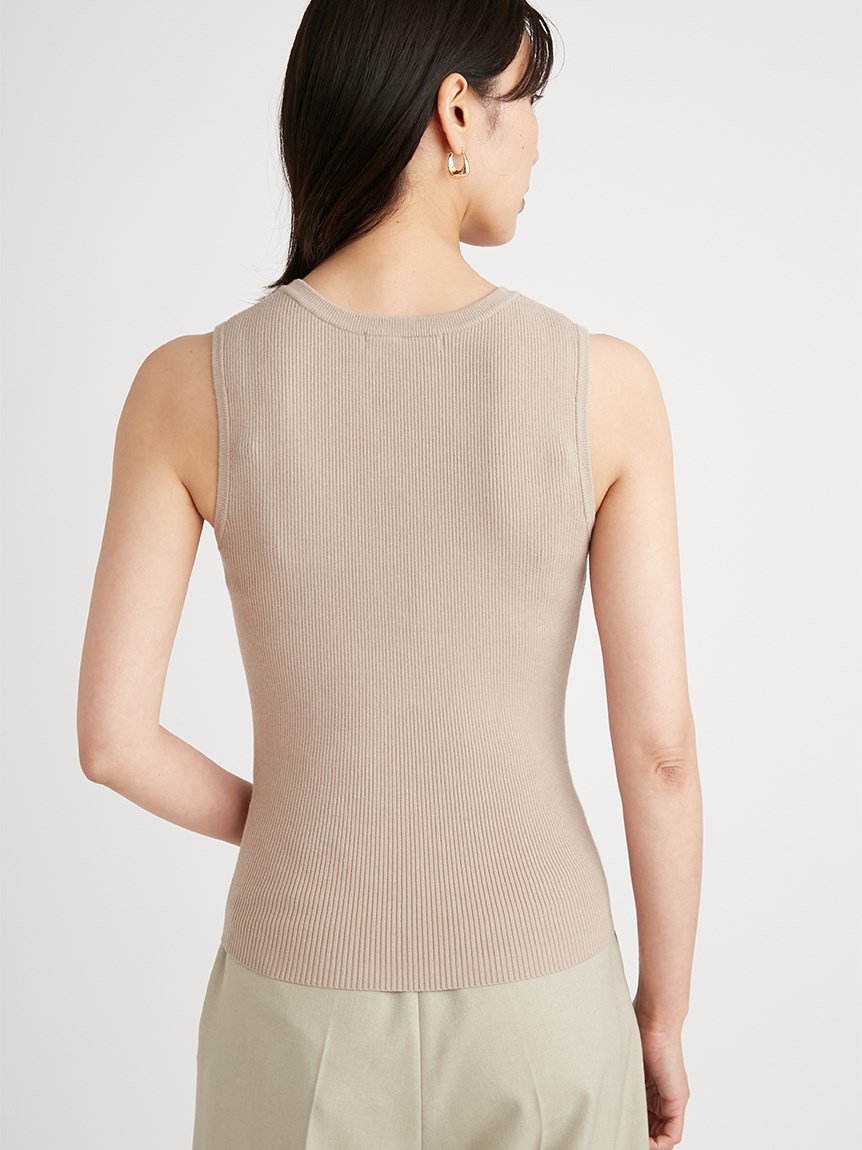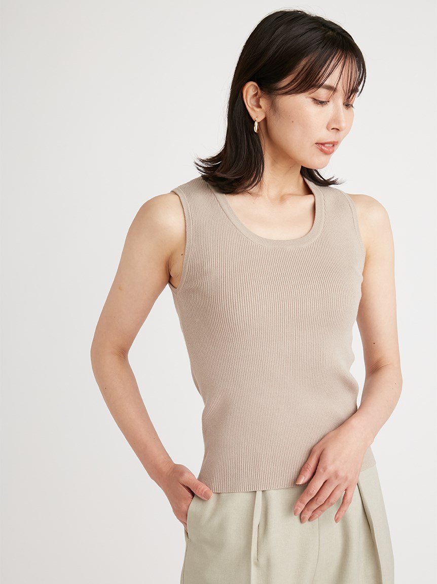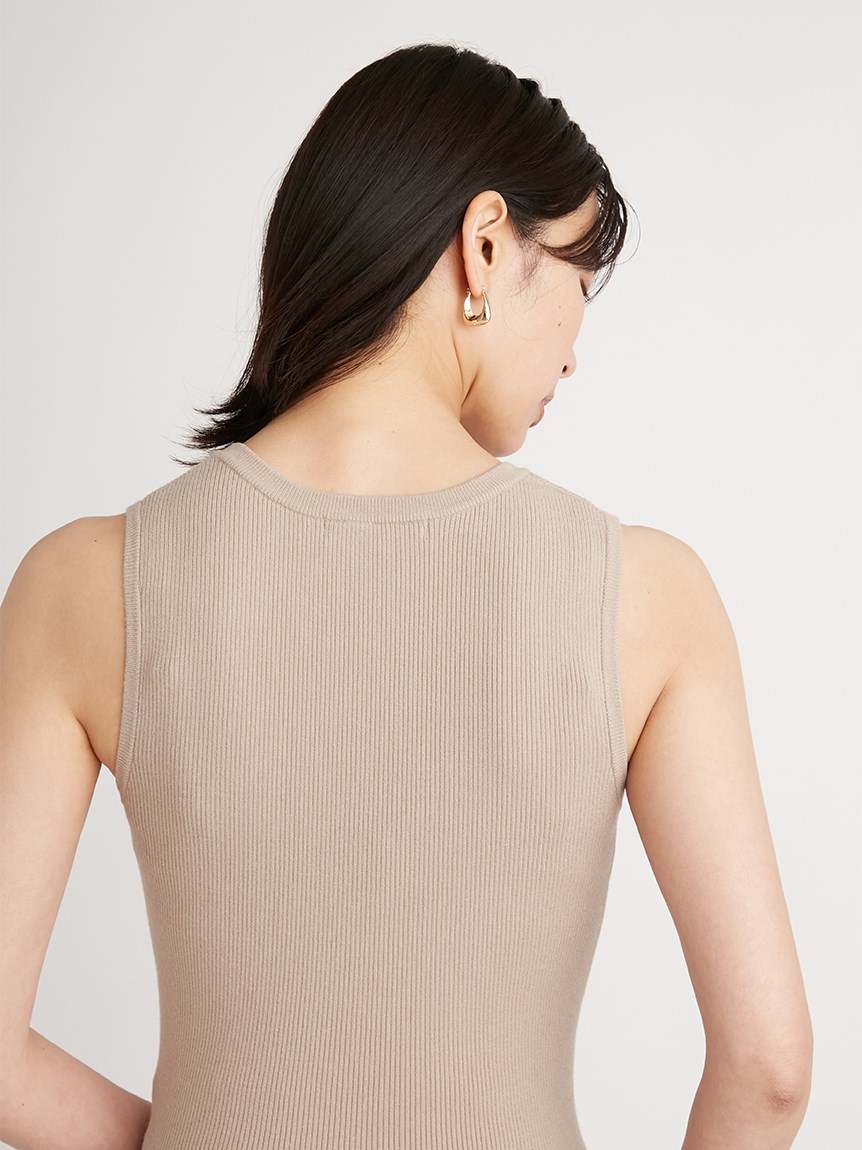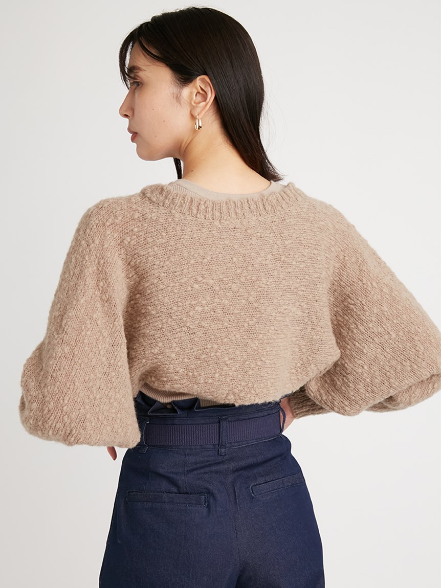 ボレロはイタリア糸を用いた編地に表情のあるニット素材を使用、タンクは伸縮性のあるリブニットを使用しました。ホワイト、ベージュ、ダークブラウンの着まわしやすいカラー展開でお届けします。
