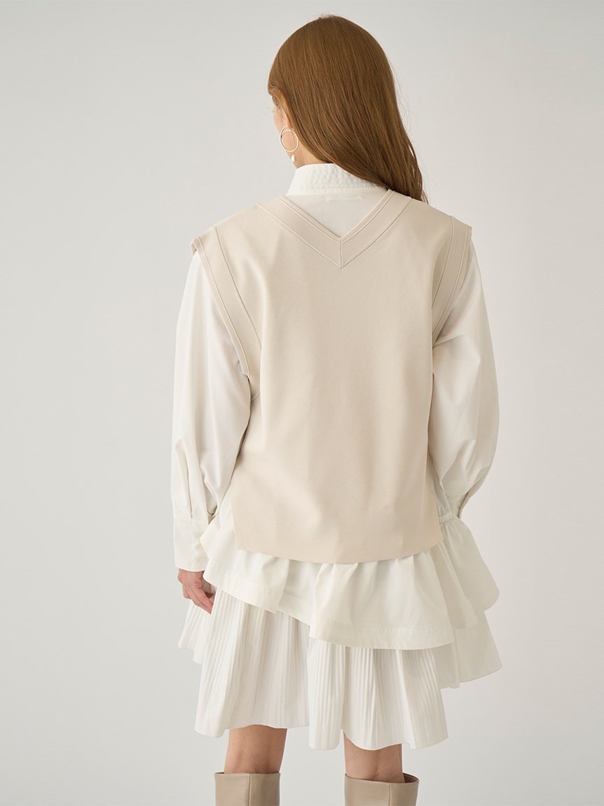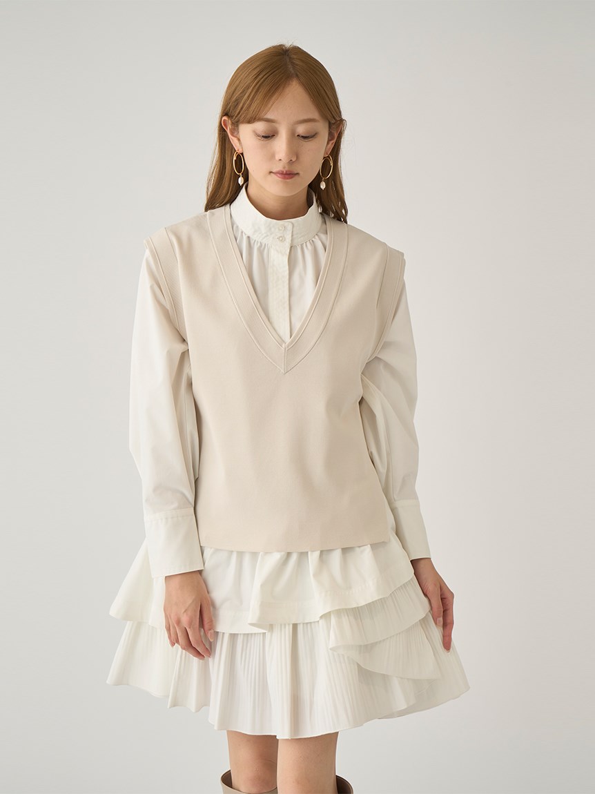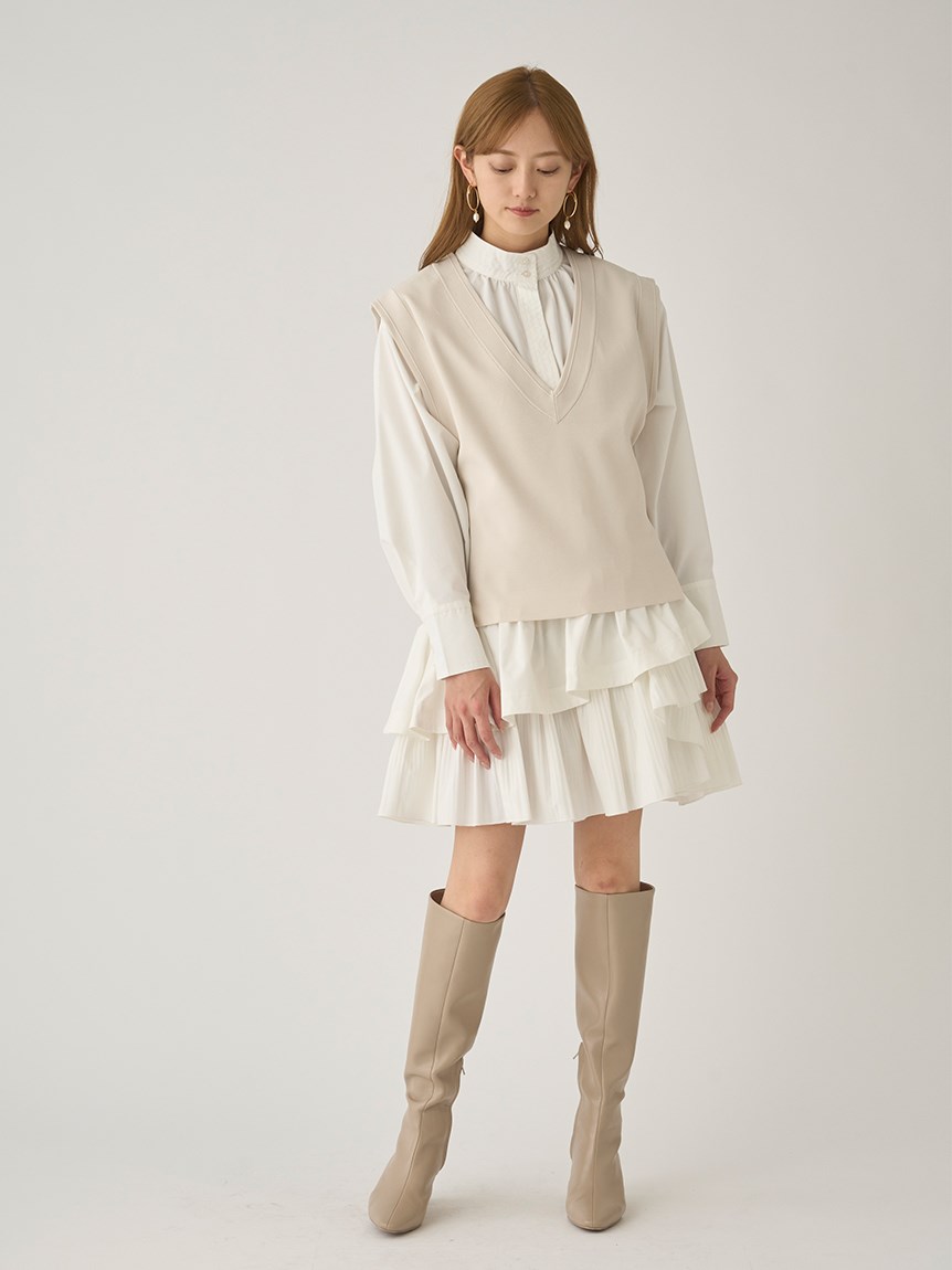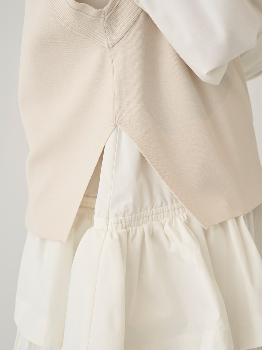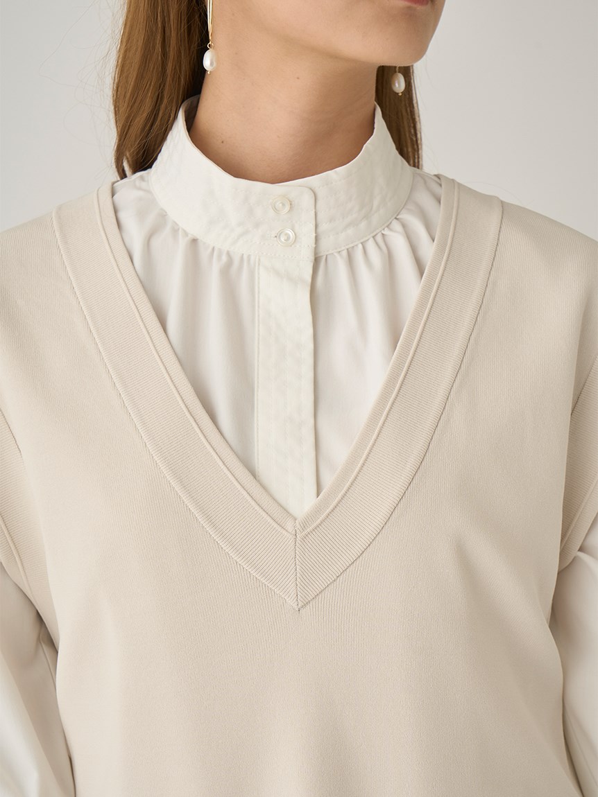 キレイめな質感のニットとライトなシャツ地を組み合わせました。優しい色合いでまとめたアイボリー、シーズンムード高まるバーガンディ、上品な印象を与えるネイビーの3色展開でお届けします。