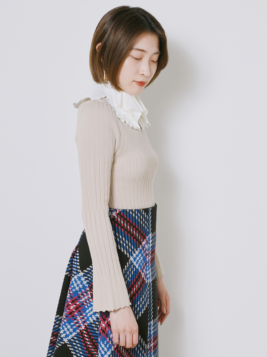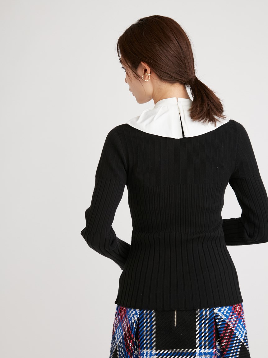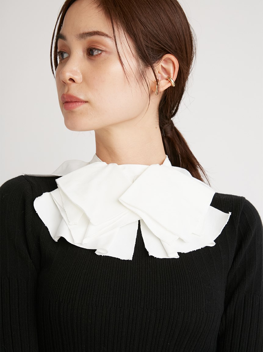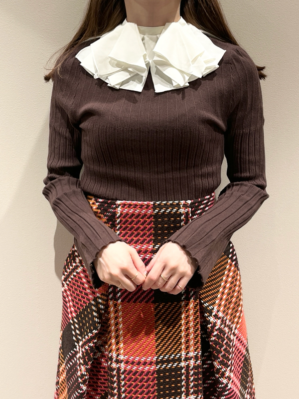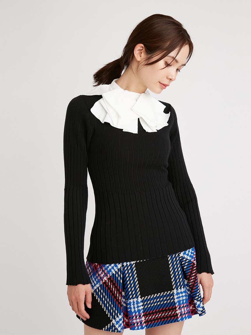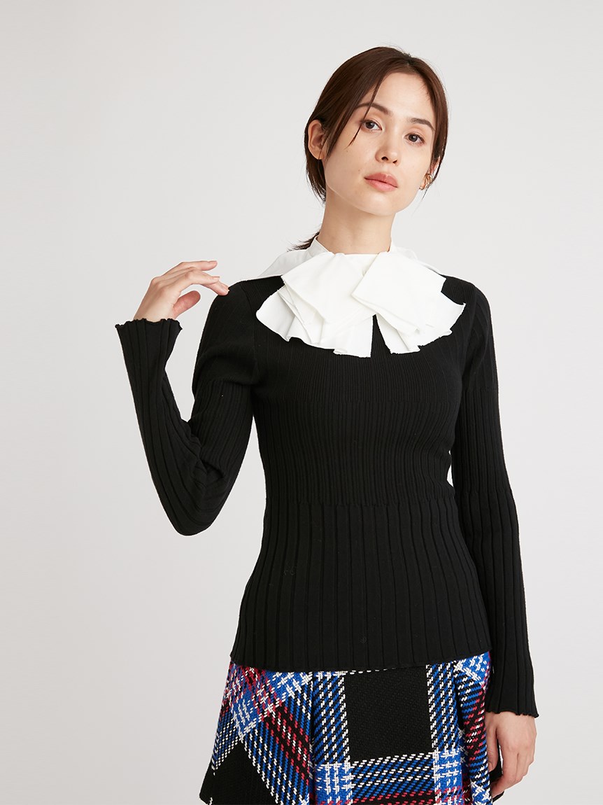 スカーフのようなフリリーな襟をドッキングした、今年らしいクラシカルなデザインのニットプルオーバー。身頃部分は編地に変化を付け表情豊かに仕上げています。ボディラインにすっきりと沿うタイトシルエットが女性らしさを高める秘訣。パンツともスカートとも合わせやすく、幅広いコーディネートに活躍してくれます。