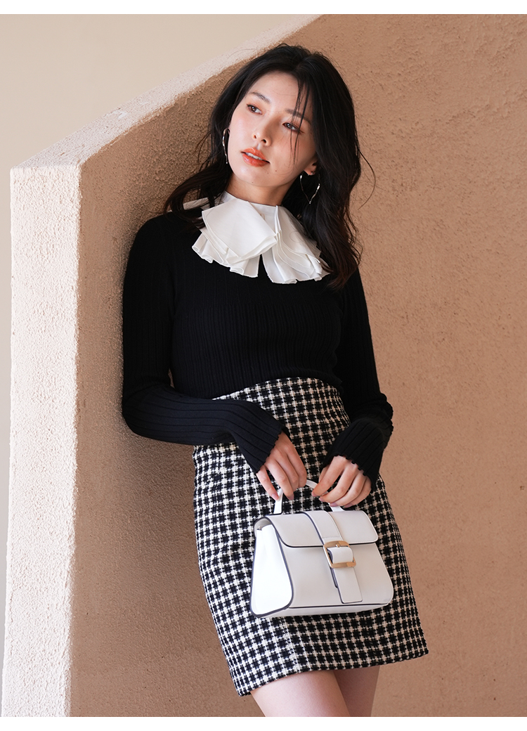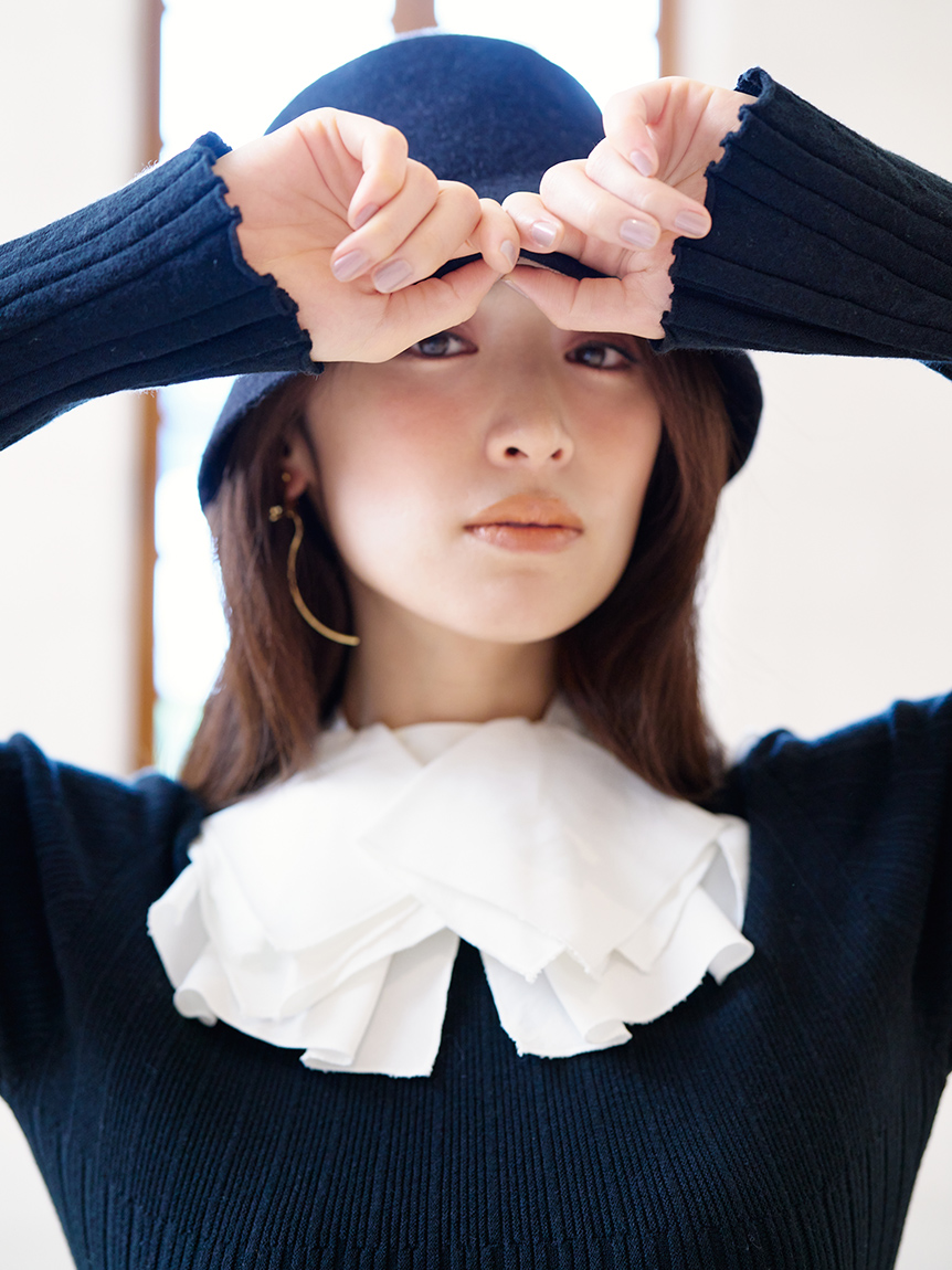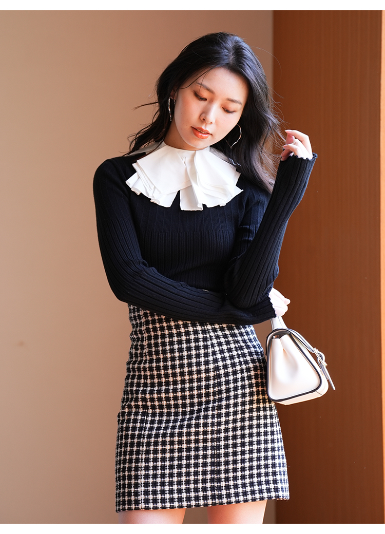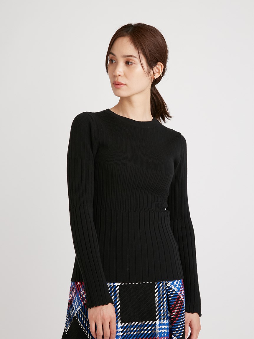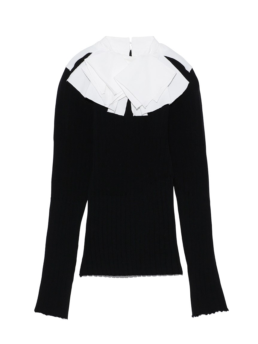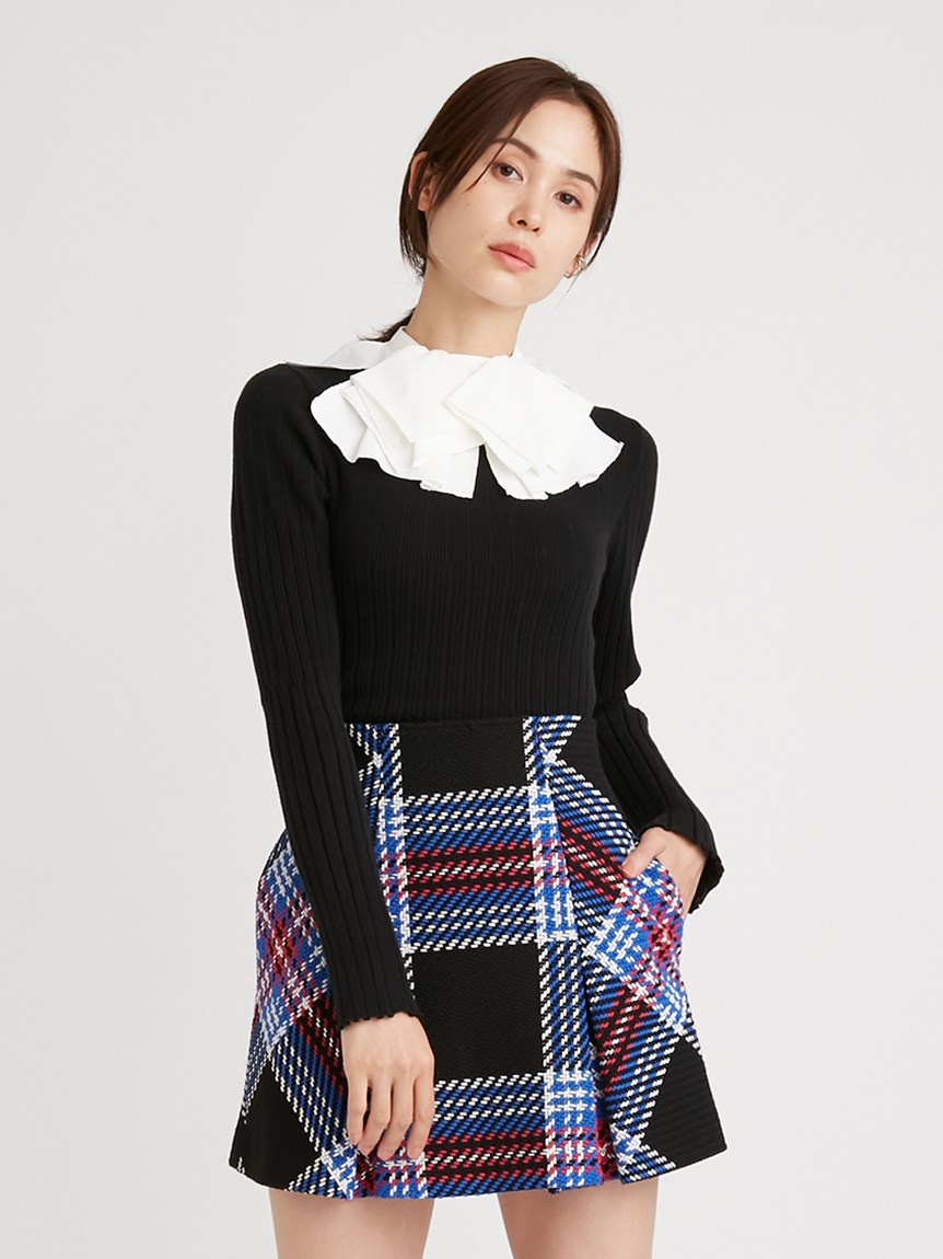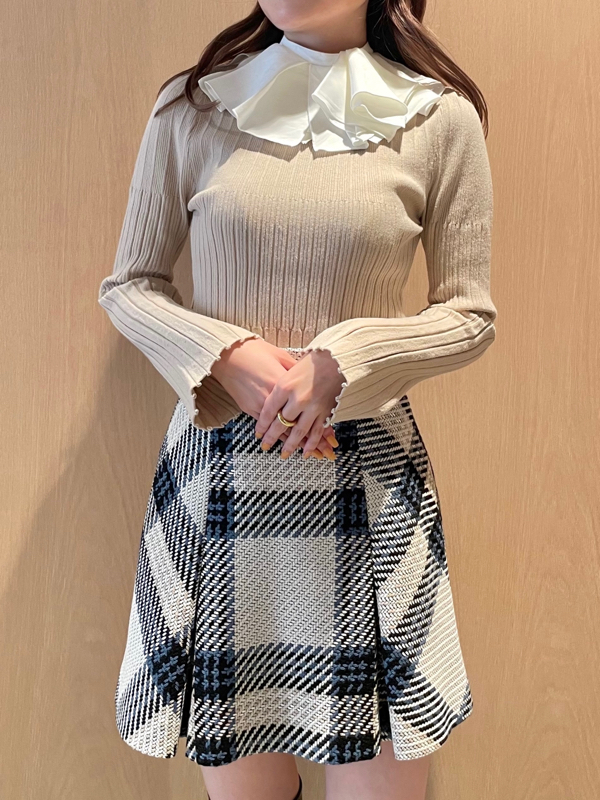 スカーフのようなフリリーな襟をドッキングした、今年らしいクラシカルなデザインのニットプルオーバー。身頃部分は編地に変化を付け表情豊かに仕上げています。ボディラインにすっきりと沿うタイトシルエットが女性らしさを高める秘訣。パンツともスカートとも合わせやすく、幅広いコーディネートに活躍してくれます。