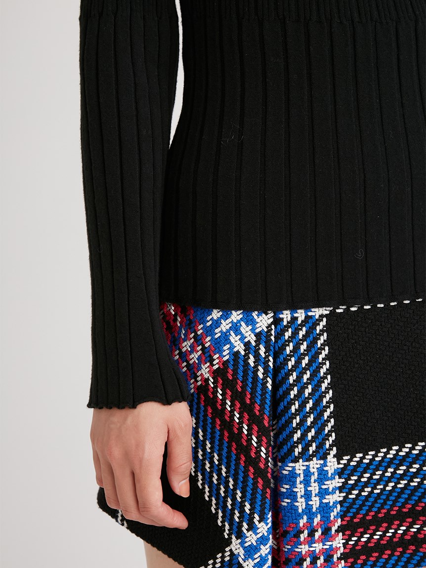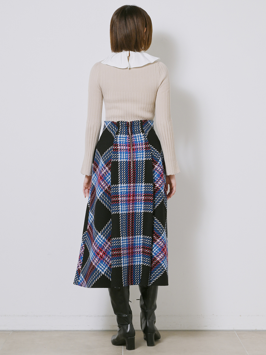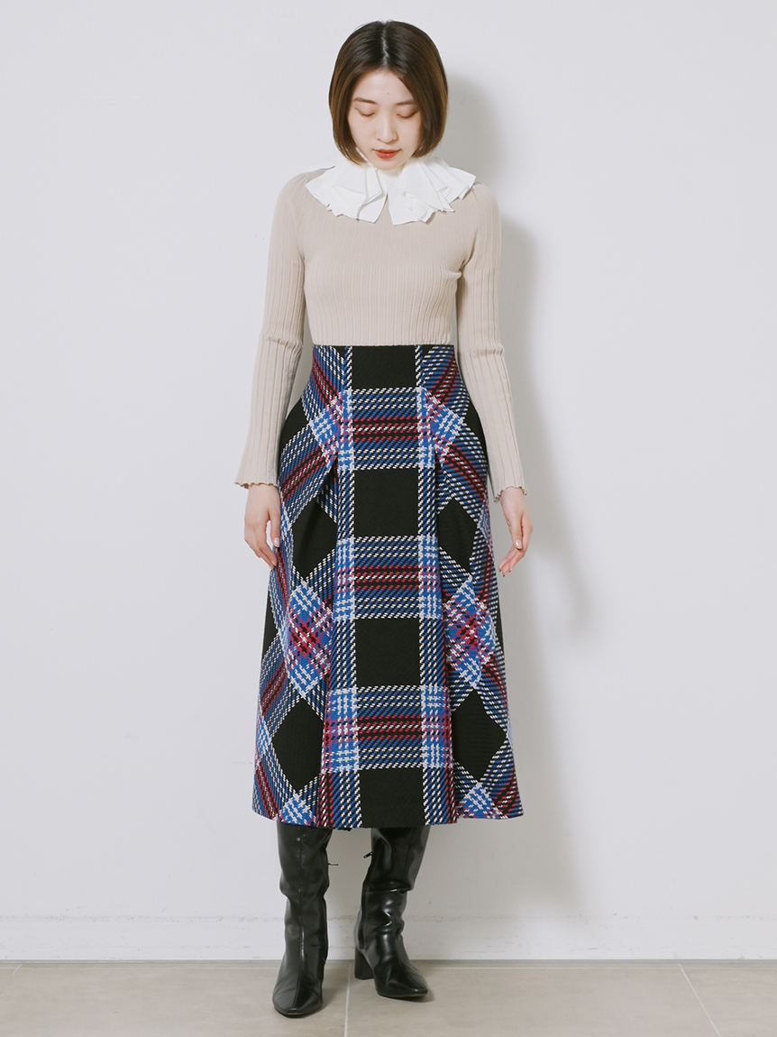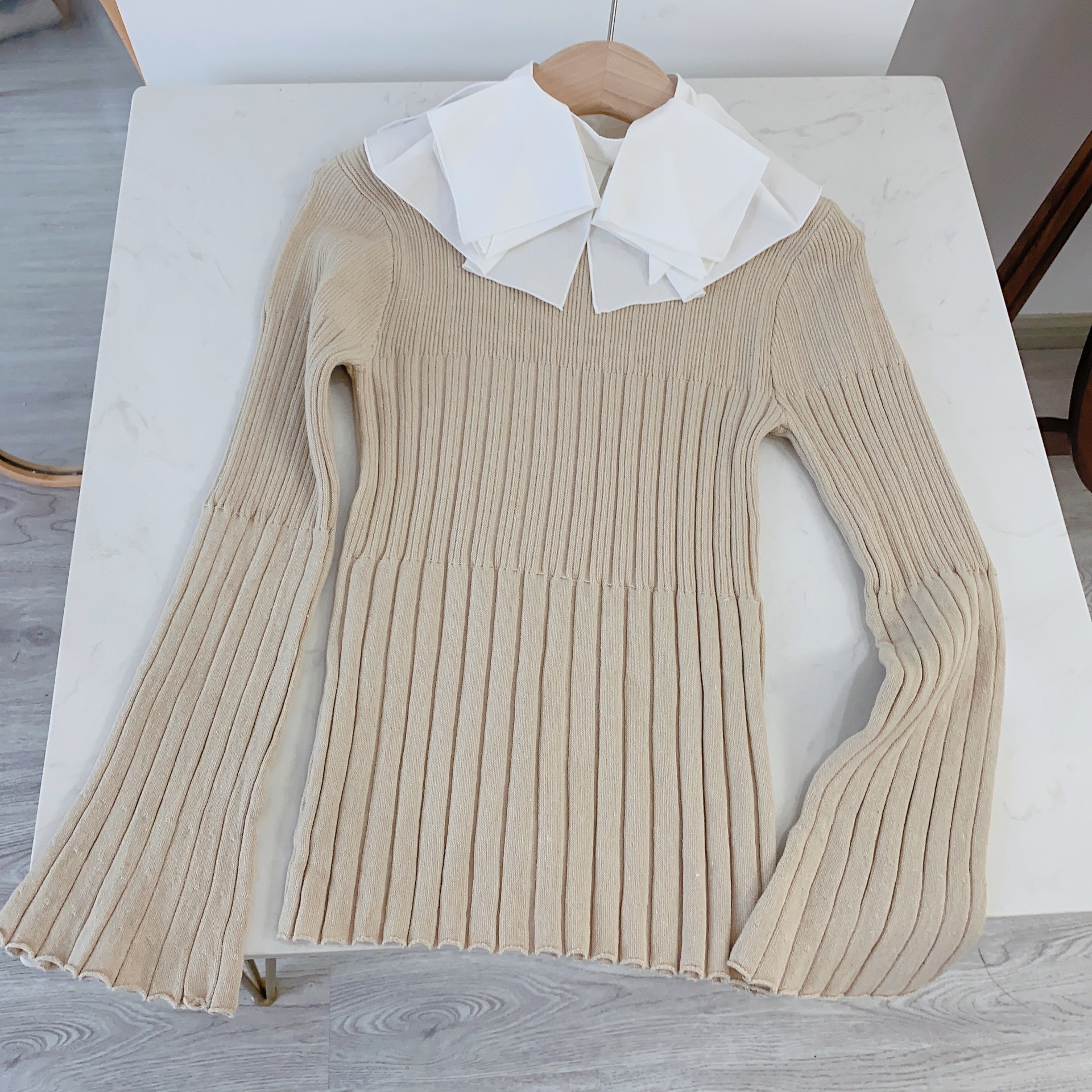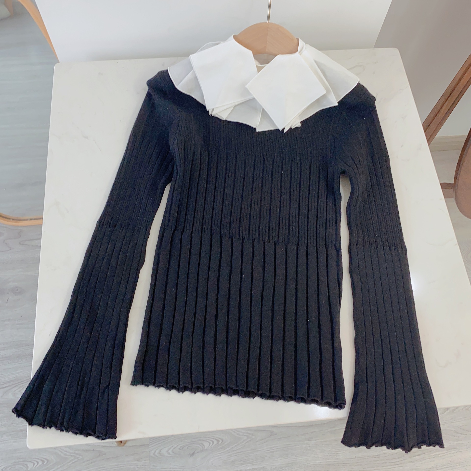 スカーフのようなフリリーな襟をドッキングした、今年らしいクラシカルなデザインのニットプルオーバー。身頃部分は編地に変化を付け表情豊かに仕上げています。ボディラインにすっきりと沿うタイトシルエットが女性らしさを高める秘訣。パンツともスカートとも合わせやすく、幅広いコーディネートに活躍してくれます。